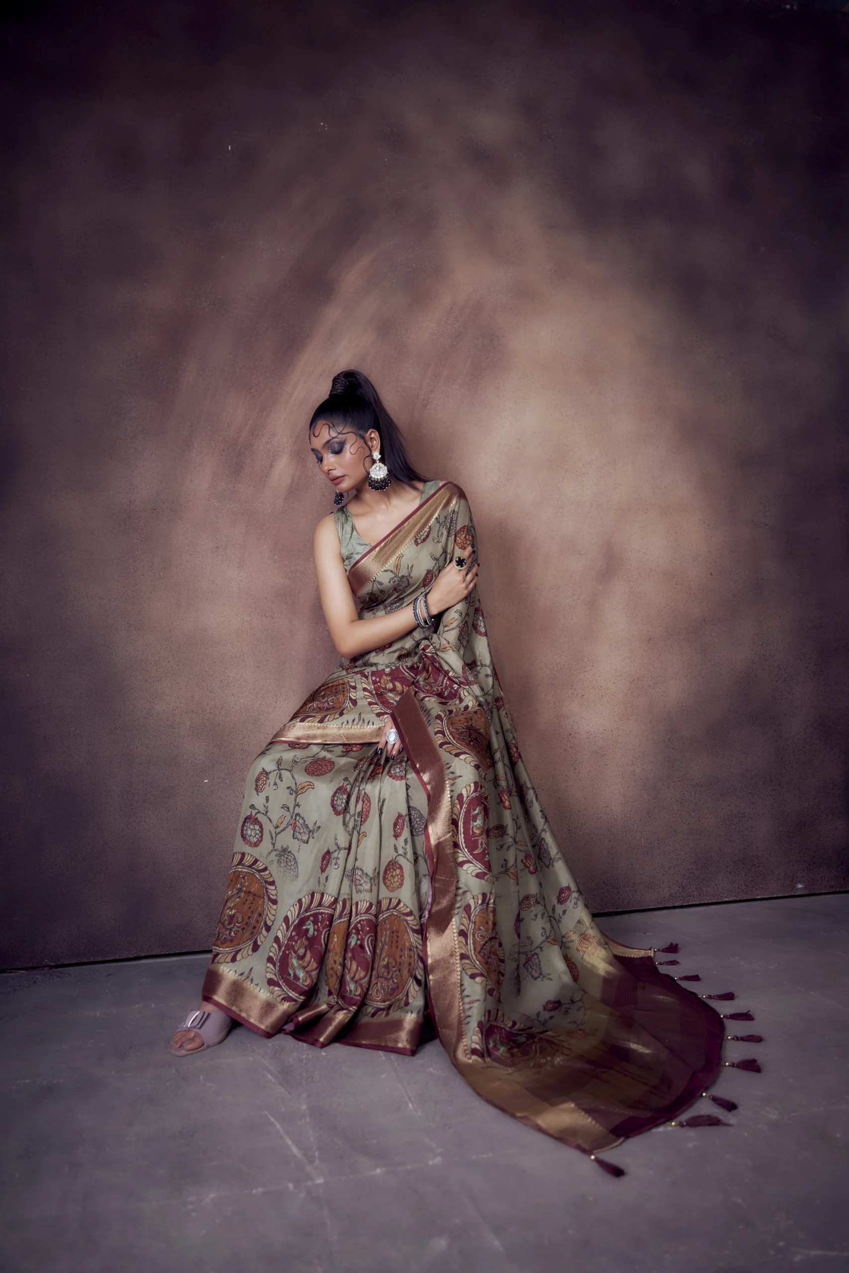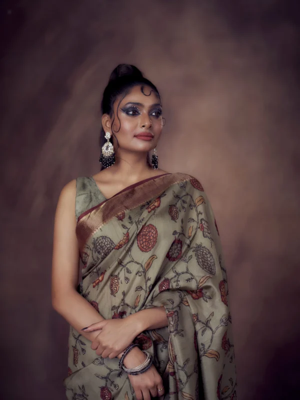 Presenting the Antique Olive Moonga Tussar Saree, a luxurious blend of India’s most treasured artforms—Pichwai, Kalamkari, Patola and folk motifs, beautifully translated onto rich moonga tussar fabric. The muted antique olive base paired with earthy maroon and rust detailing gives this saree a heritage charm that feels regal, rooted and timeless.