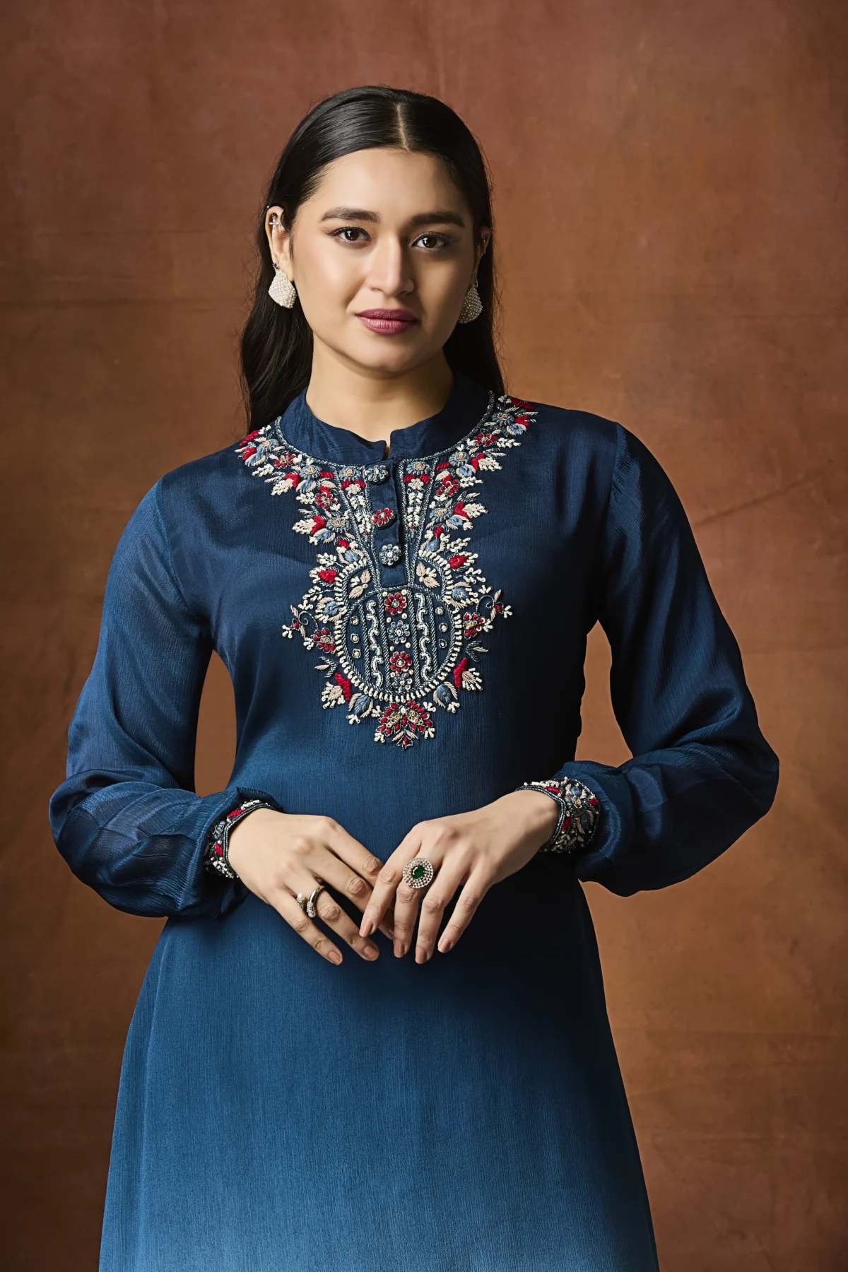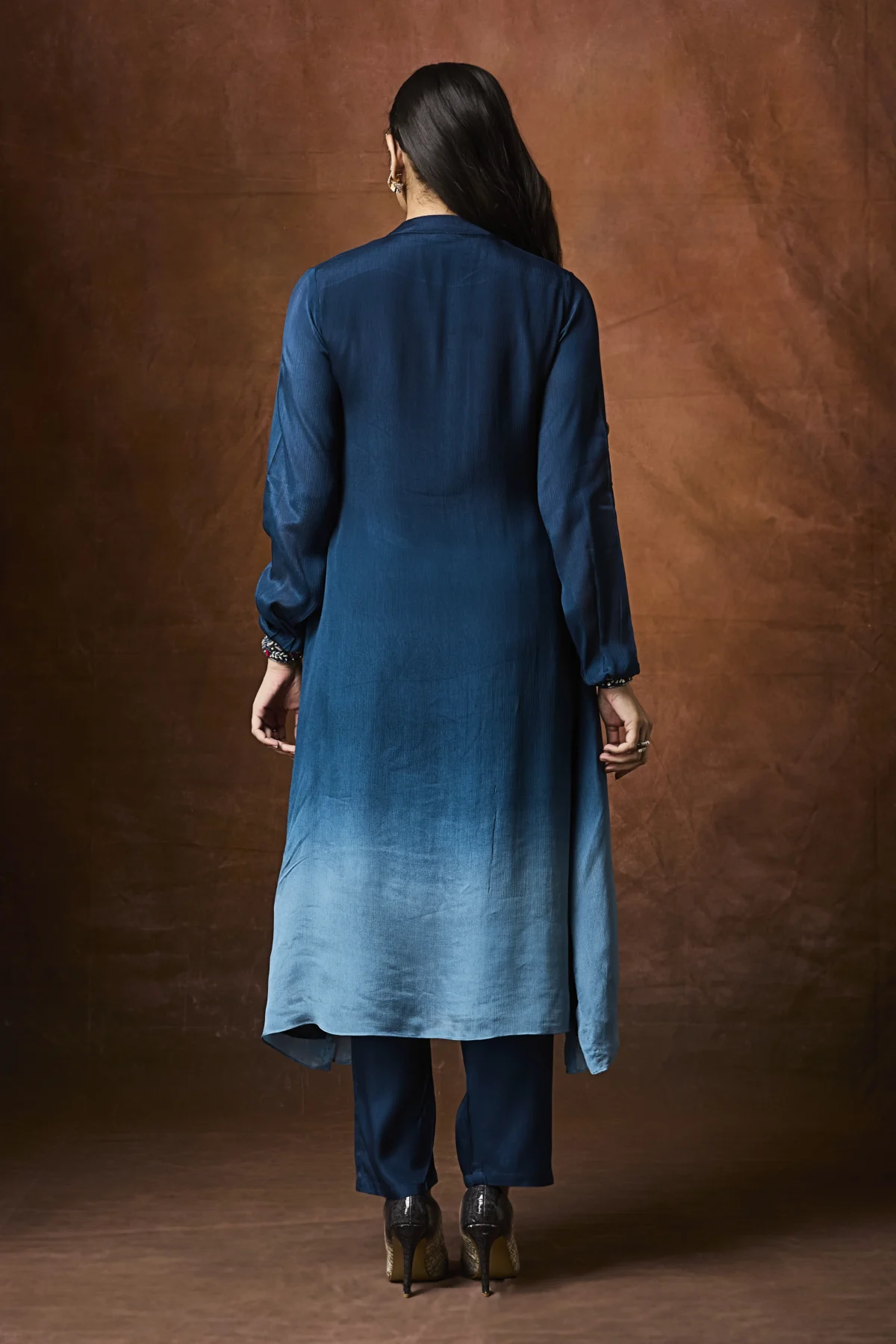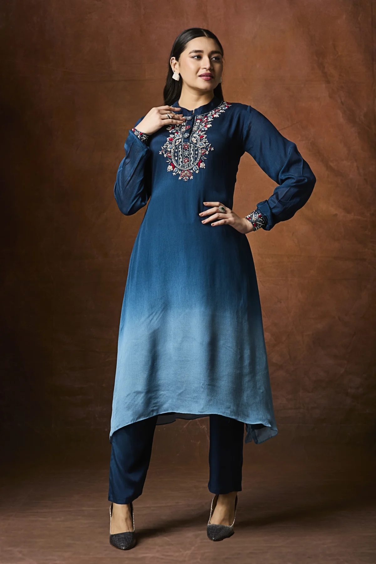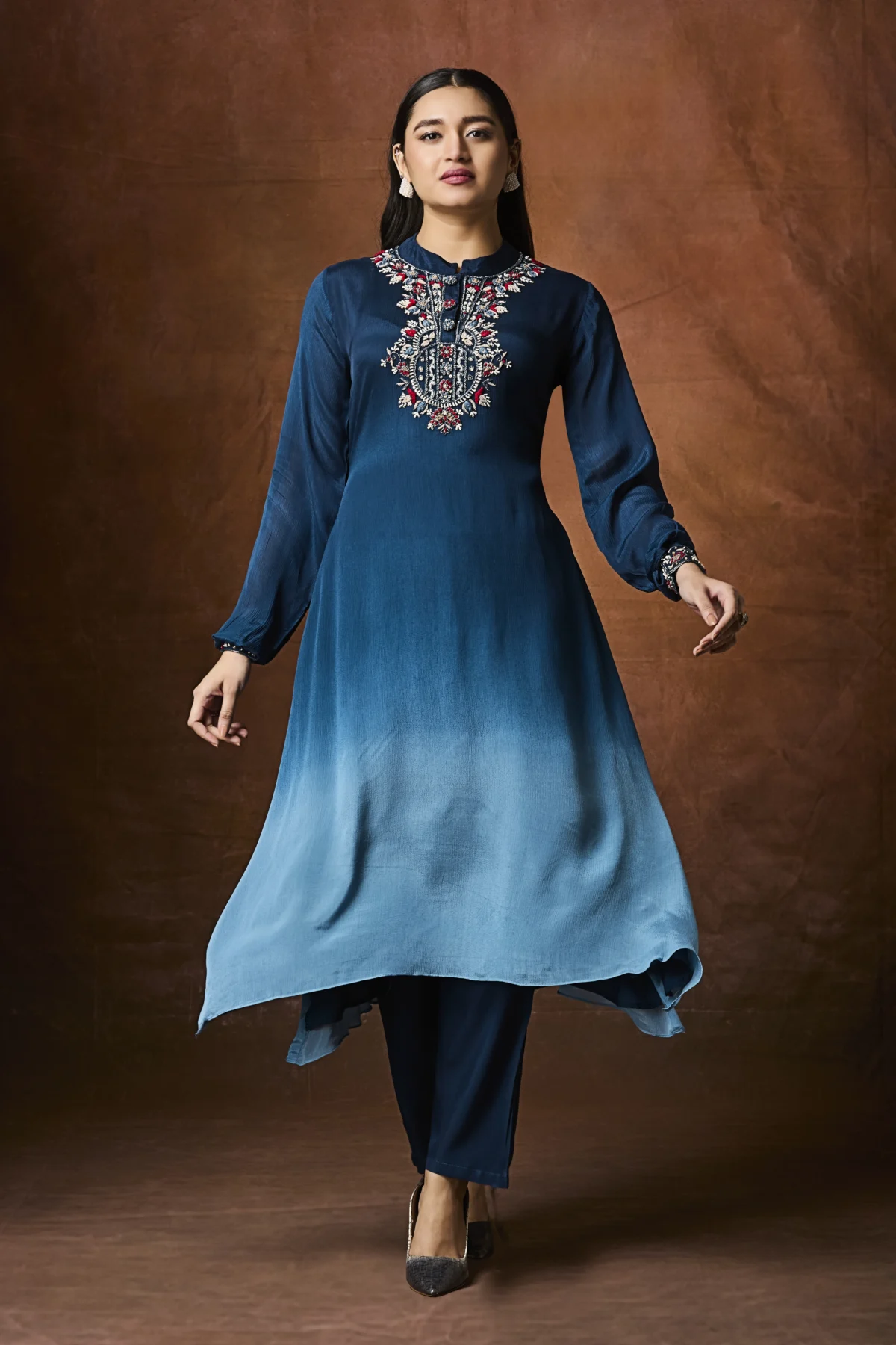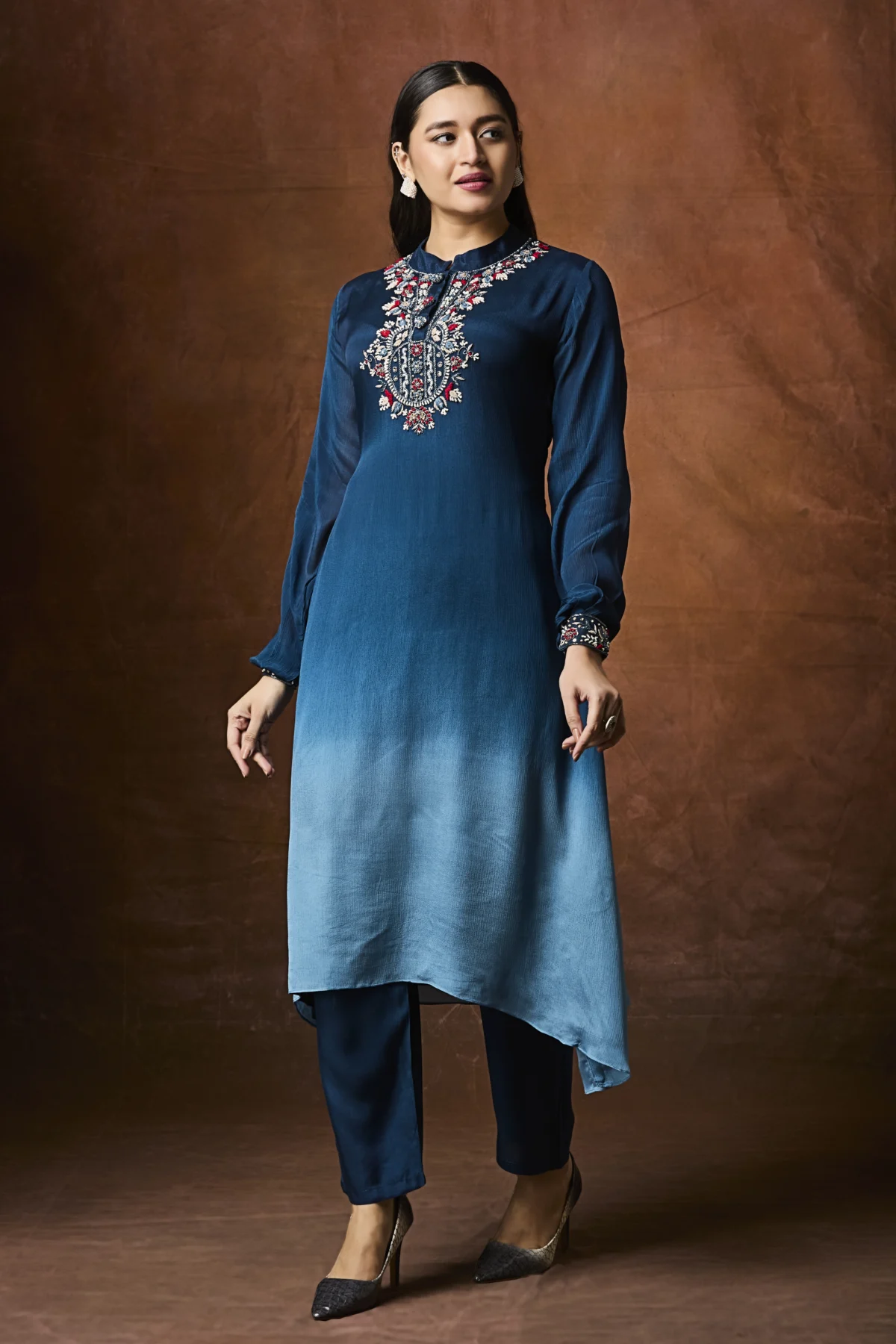 Teal ombré straight suit with embroidered neckline and matching pants.