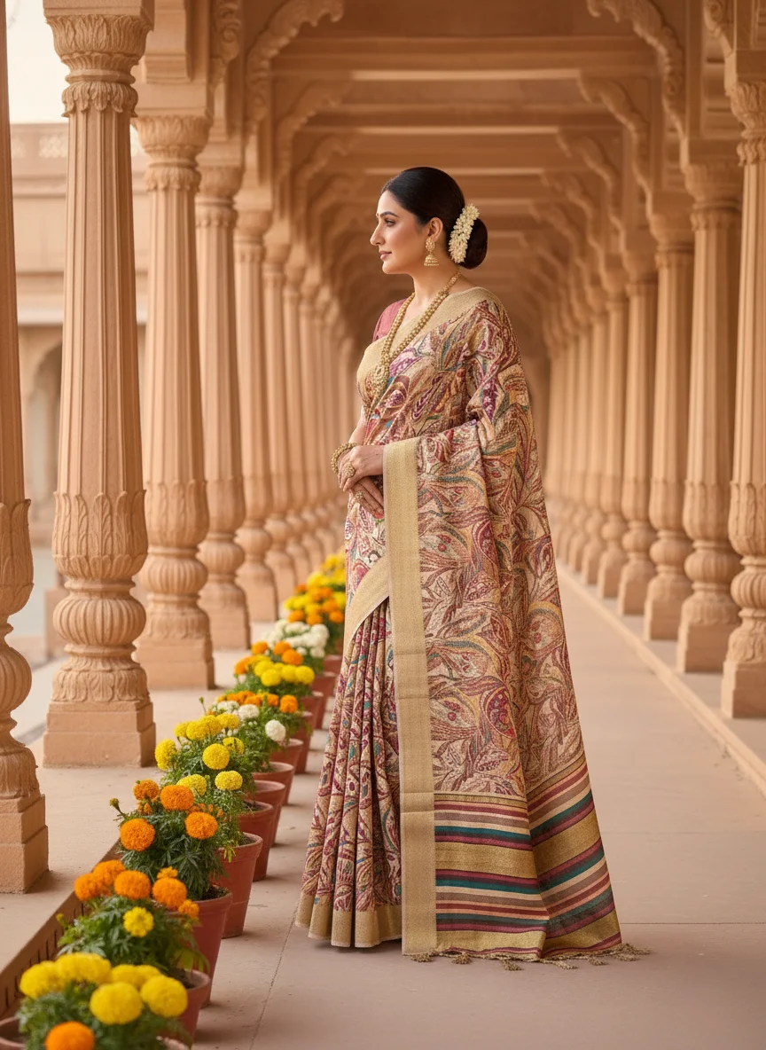 Crafted in premium Moonga Tussar silk, this saree is light in texture yet rich in appearance — offering a luminous sheen and unmatched drape. Designed for women who adore heirloom aesthetics, it’s an eternal classic that celebrates Indian tradition with a modern poise.