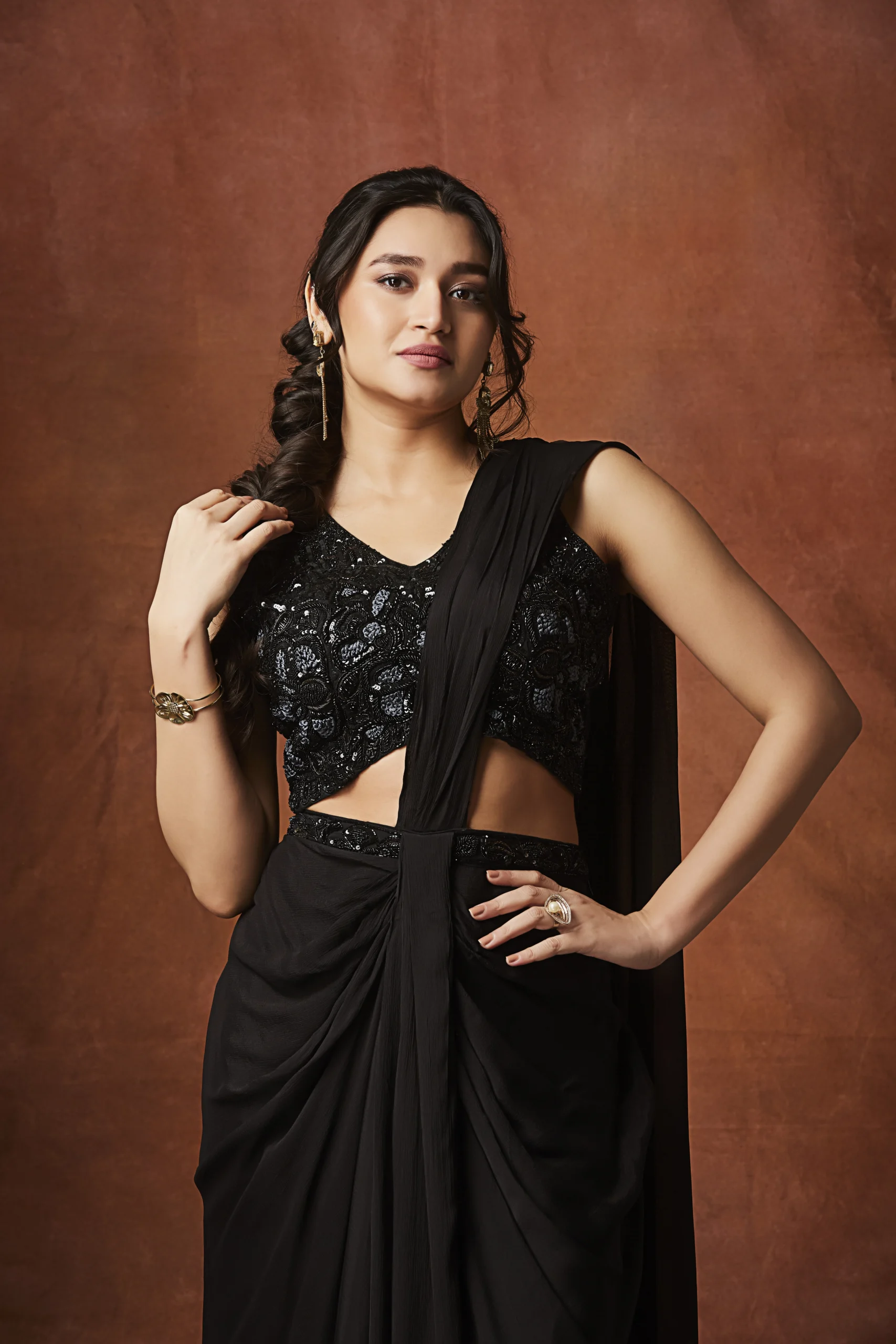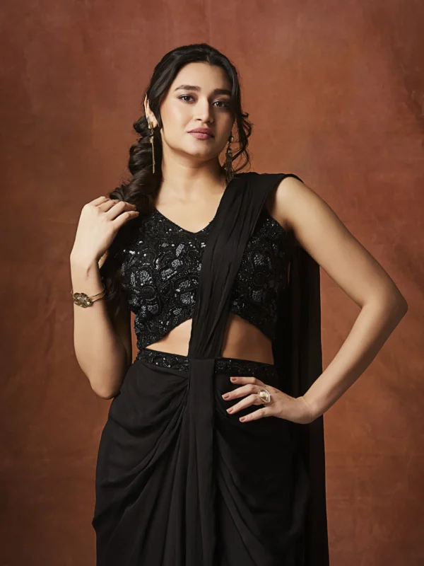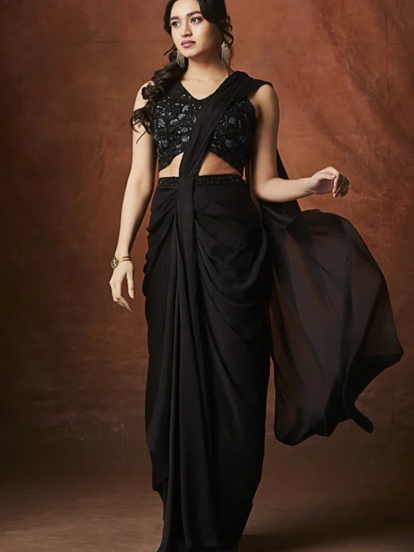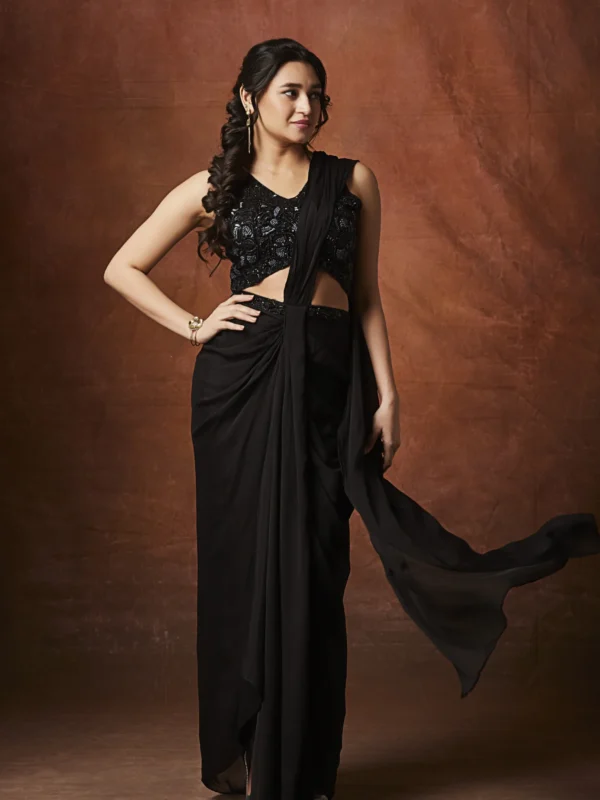 A black designer draped saree with an embellished blouse, perfect for cocktail nights and elegant evening occasions.
