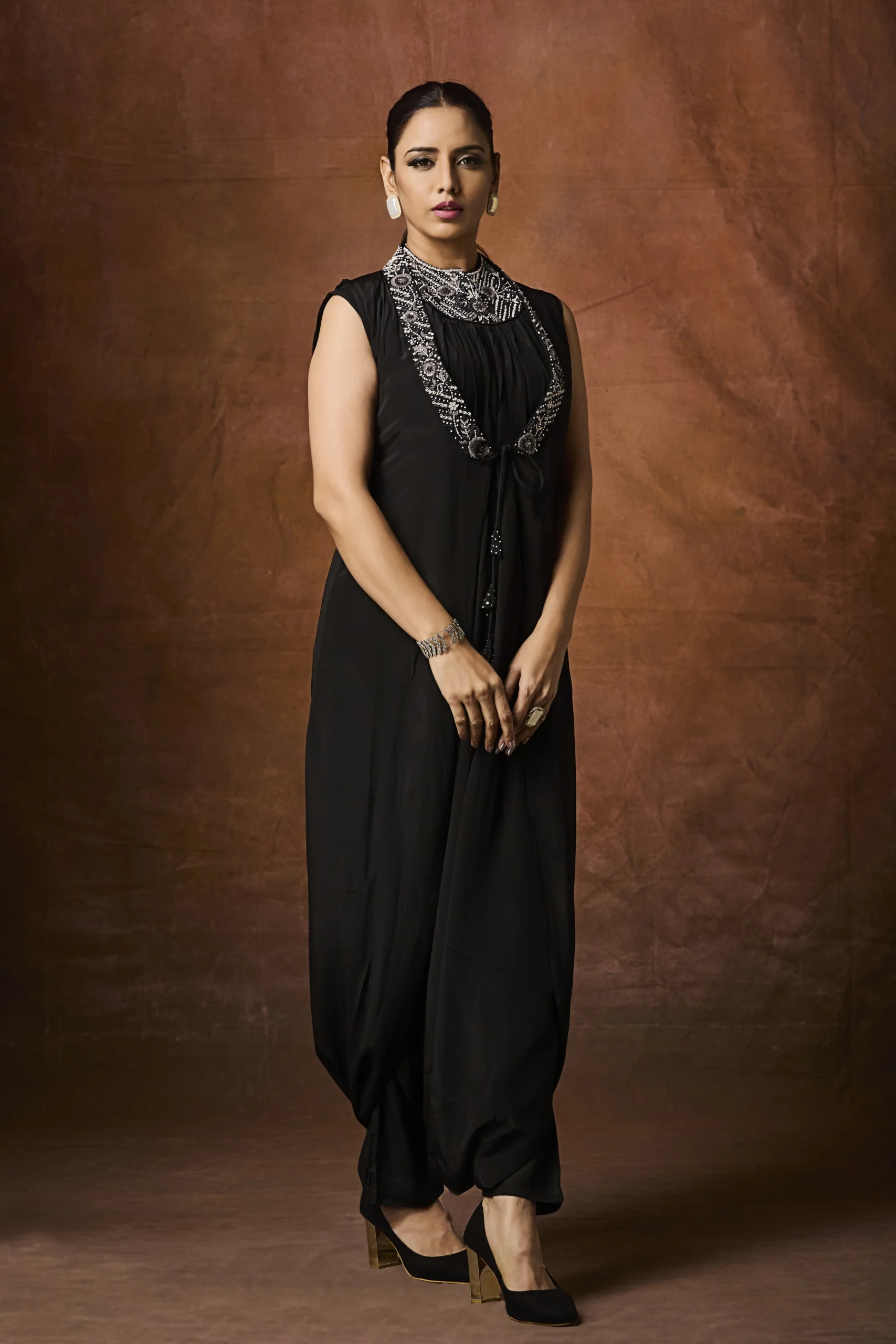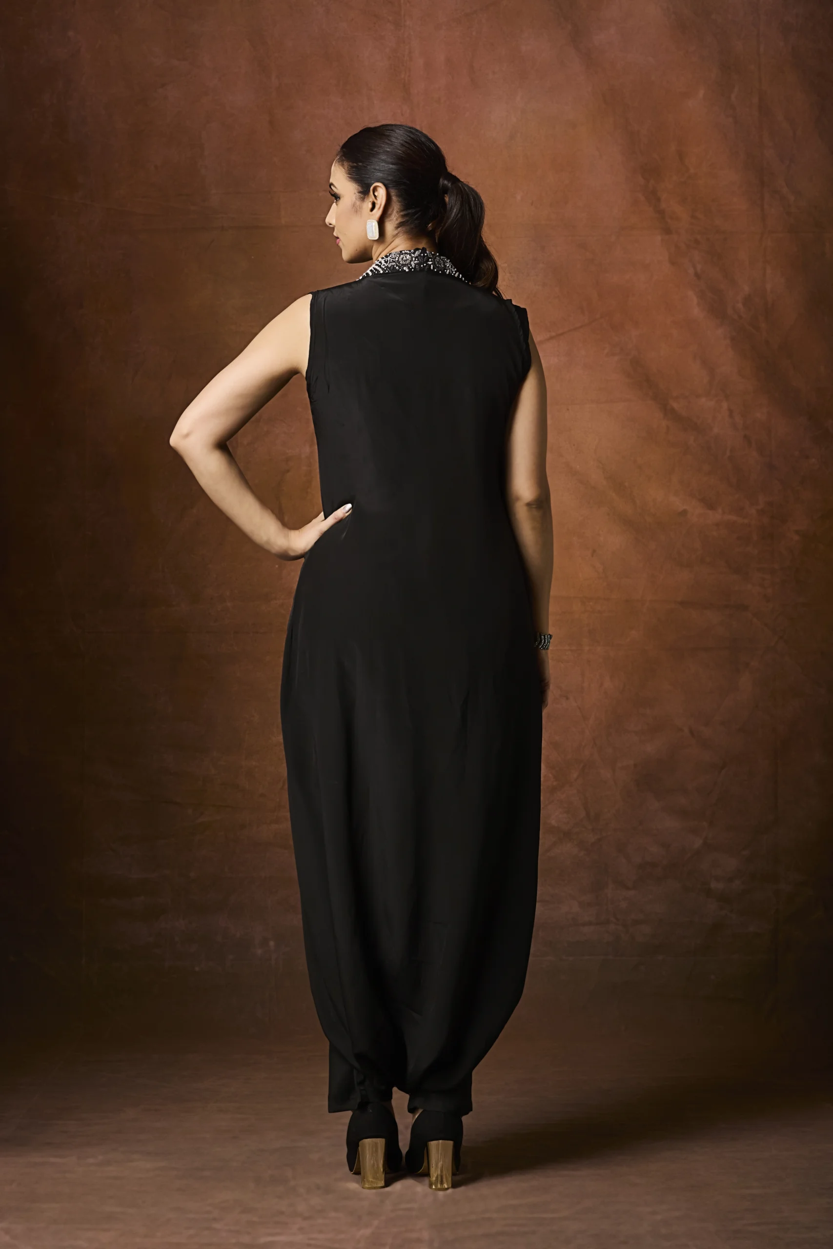 A black embellished Indo-Western draped outfit with a luxurious neckline—perfect for cocktail parties, evening events, and modern celebrations.