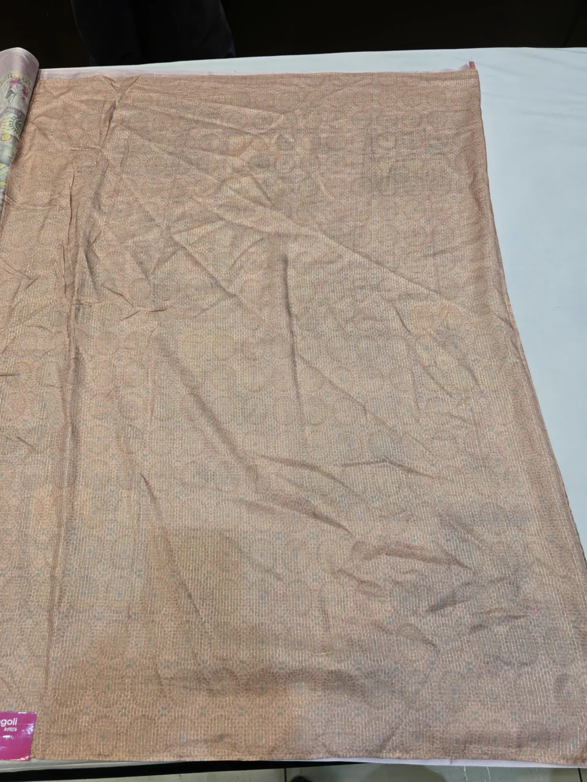 Grace meets grandeur in this Blush Moonga Tussar Saree, adorned with traditional Pichwai-inspired motifs and a luxurious woven zari border. Designed with a 5–6 inch pallu pattern and paired with a matching blouse (80 cm), this saree is a timeless drape for every celebration.