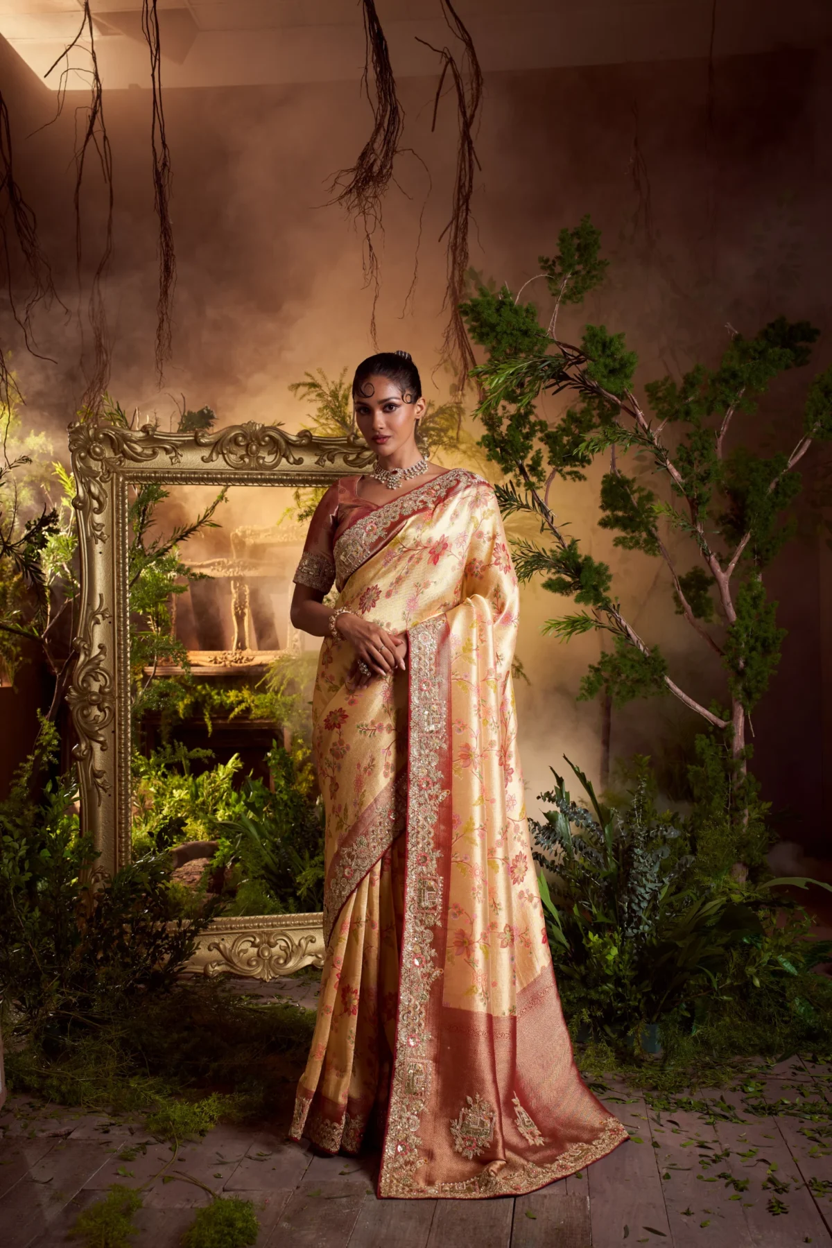 Blush rose woven silk saree with floral motifs and a hand-embroidered sequin–zari border. Comes with an unstitched blouse.