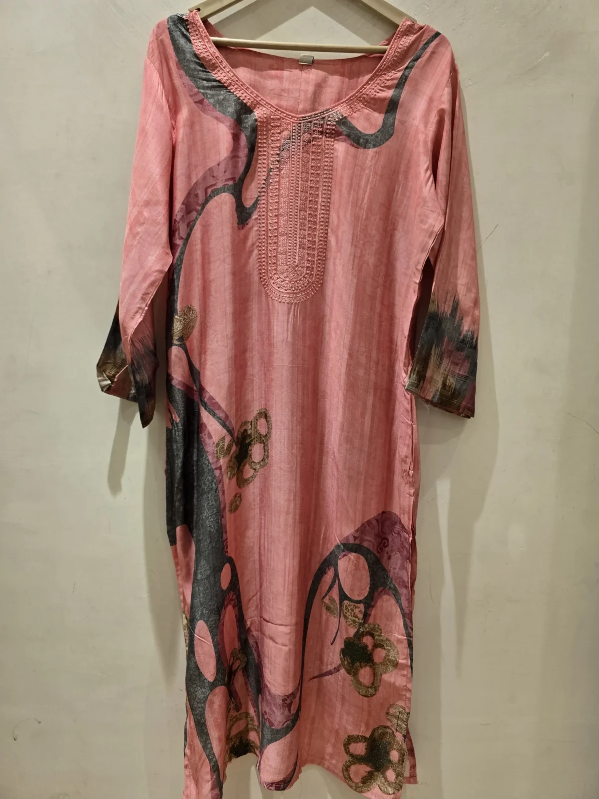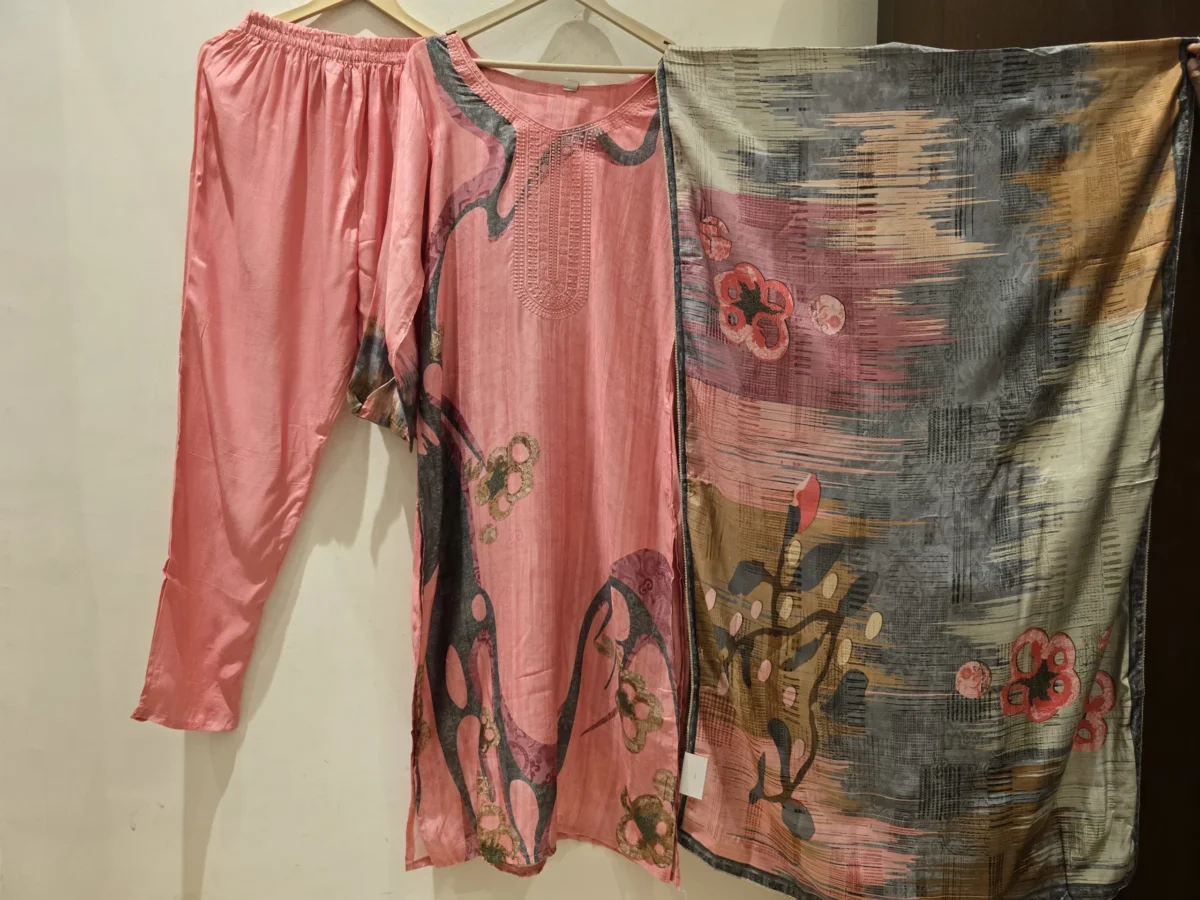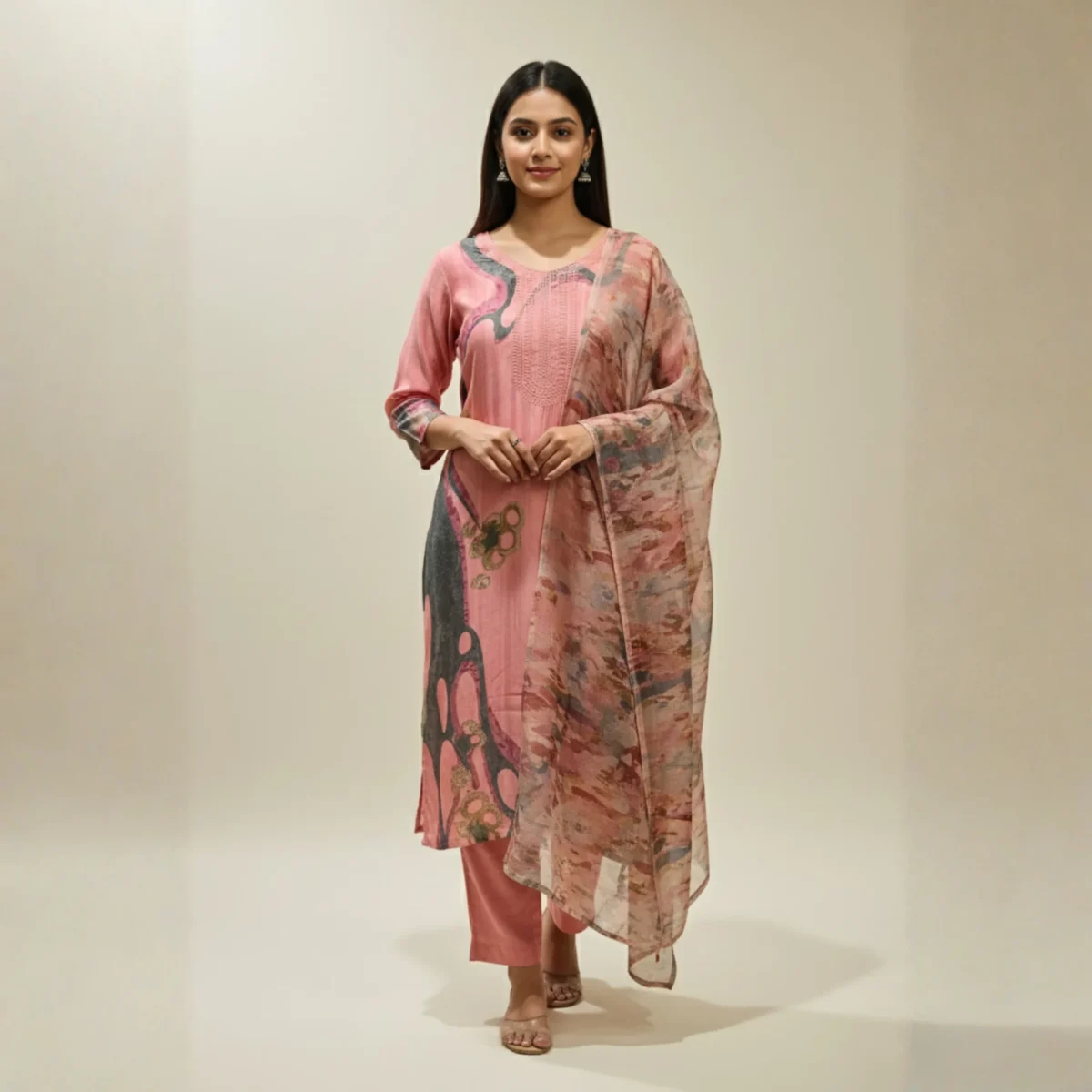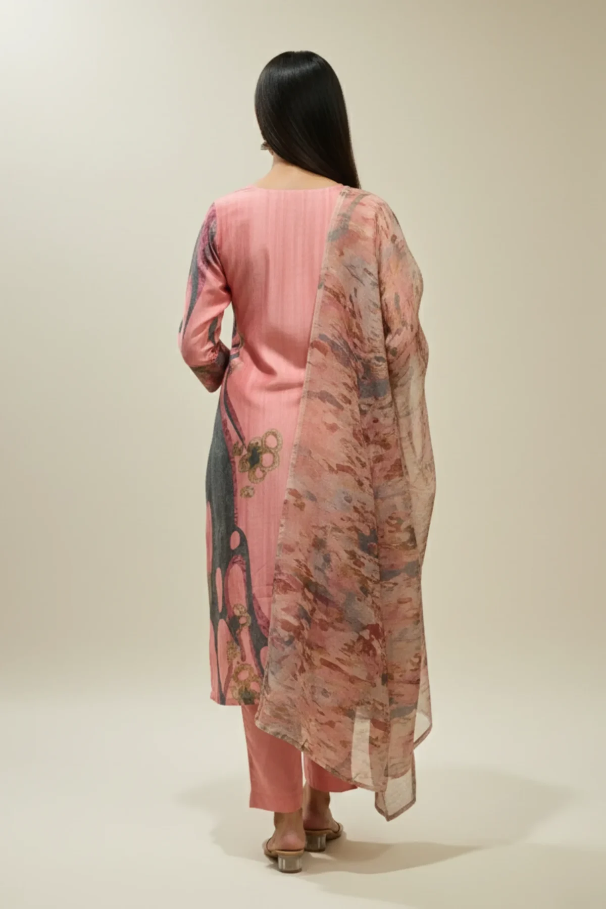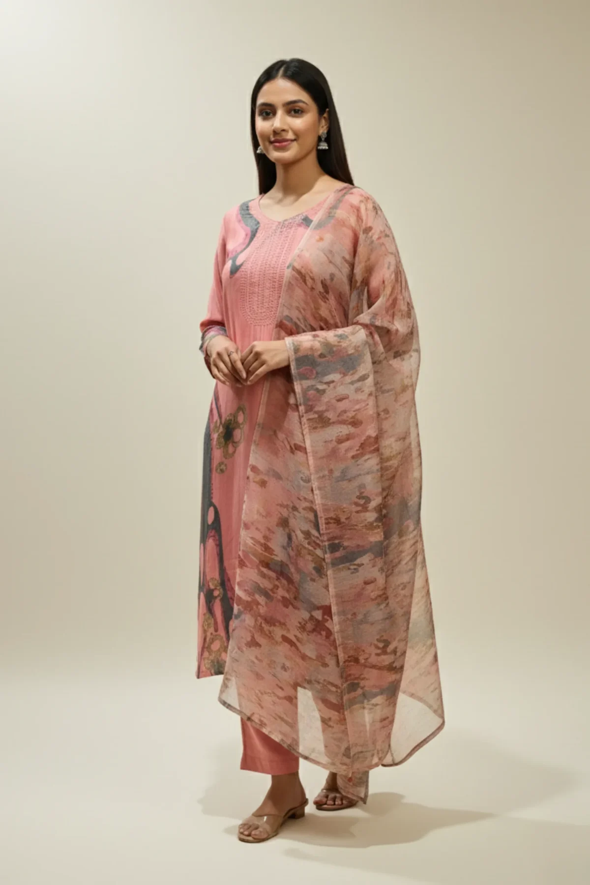 Blush Symphony – Pink Muslin Suit with Artistic Print & Delicate Embroidery