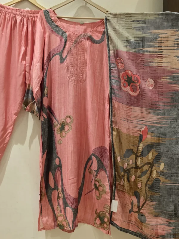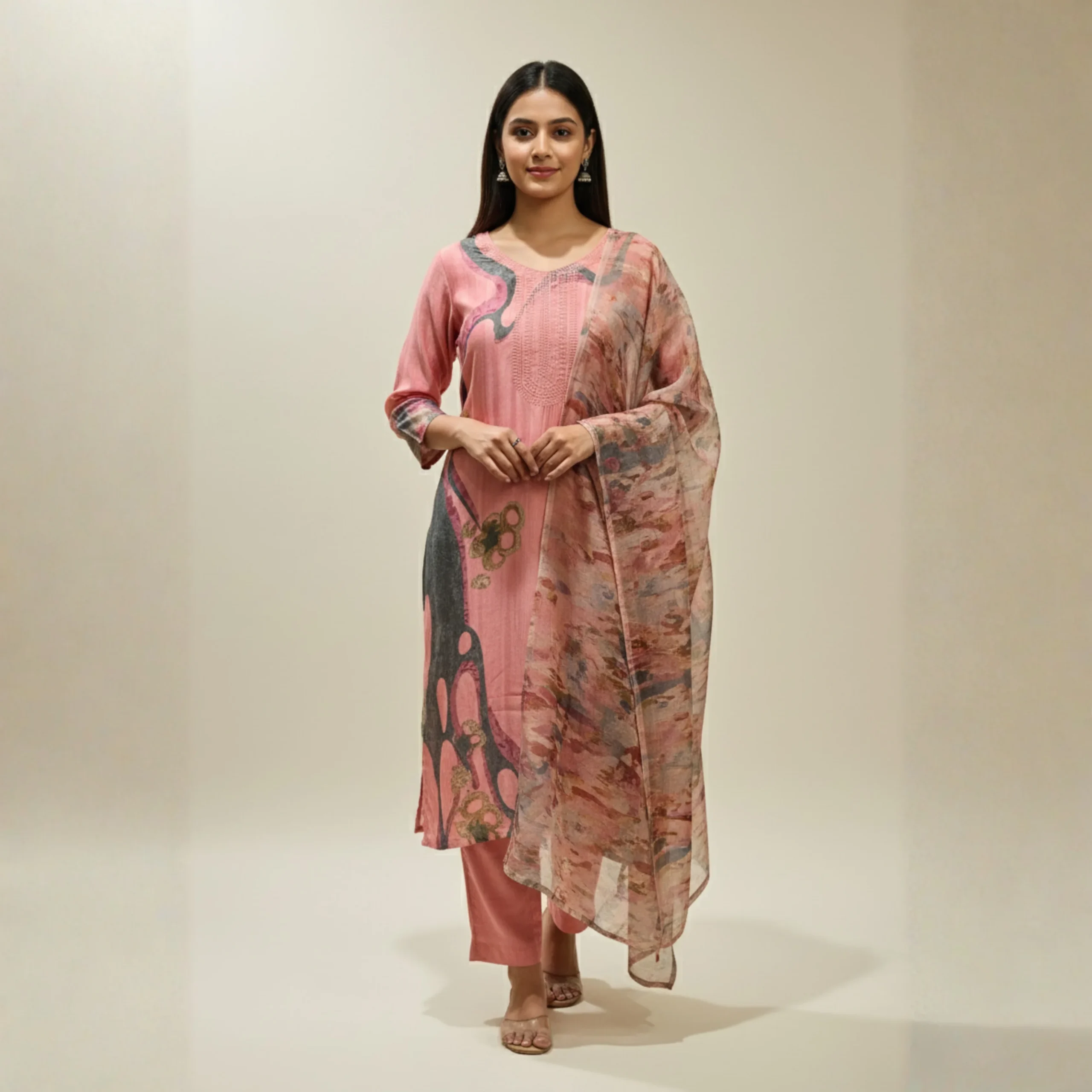 Step into the season of grace with Blush Symphony, an elegant pink muslin suit that beautifully merges modern artistry with timeless tradition. The ensemble features a sophisticated blend of abstract prints and fine embroidery, adding an element of handcrafted luxury to your everyday elegance.