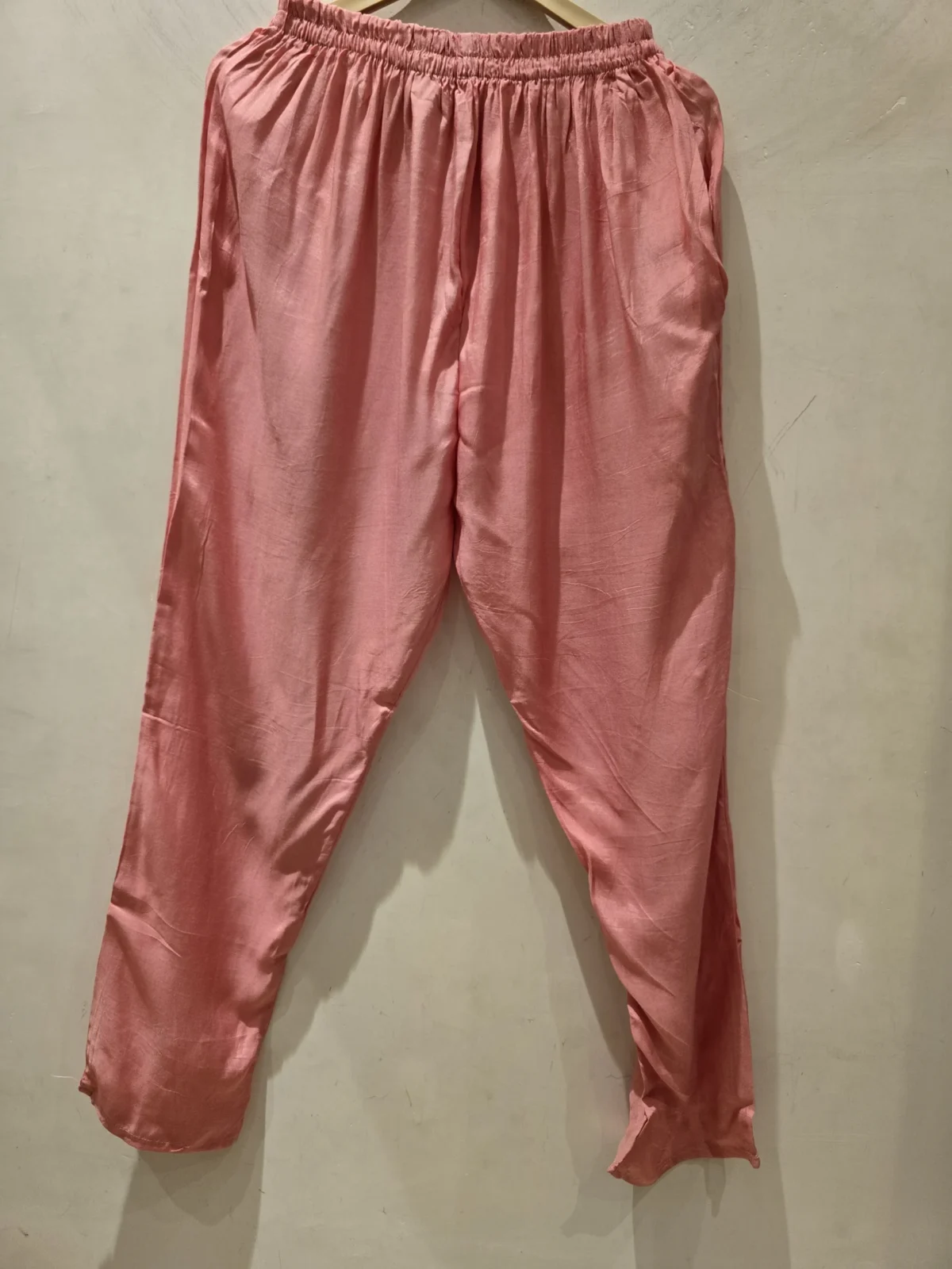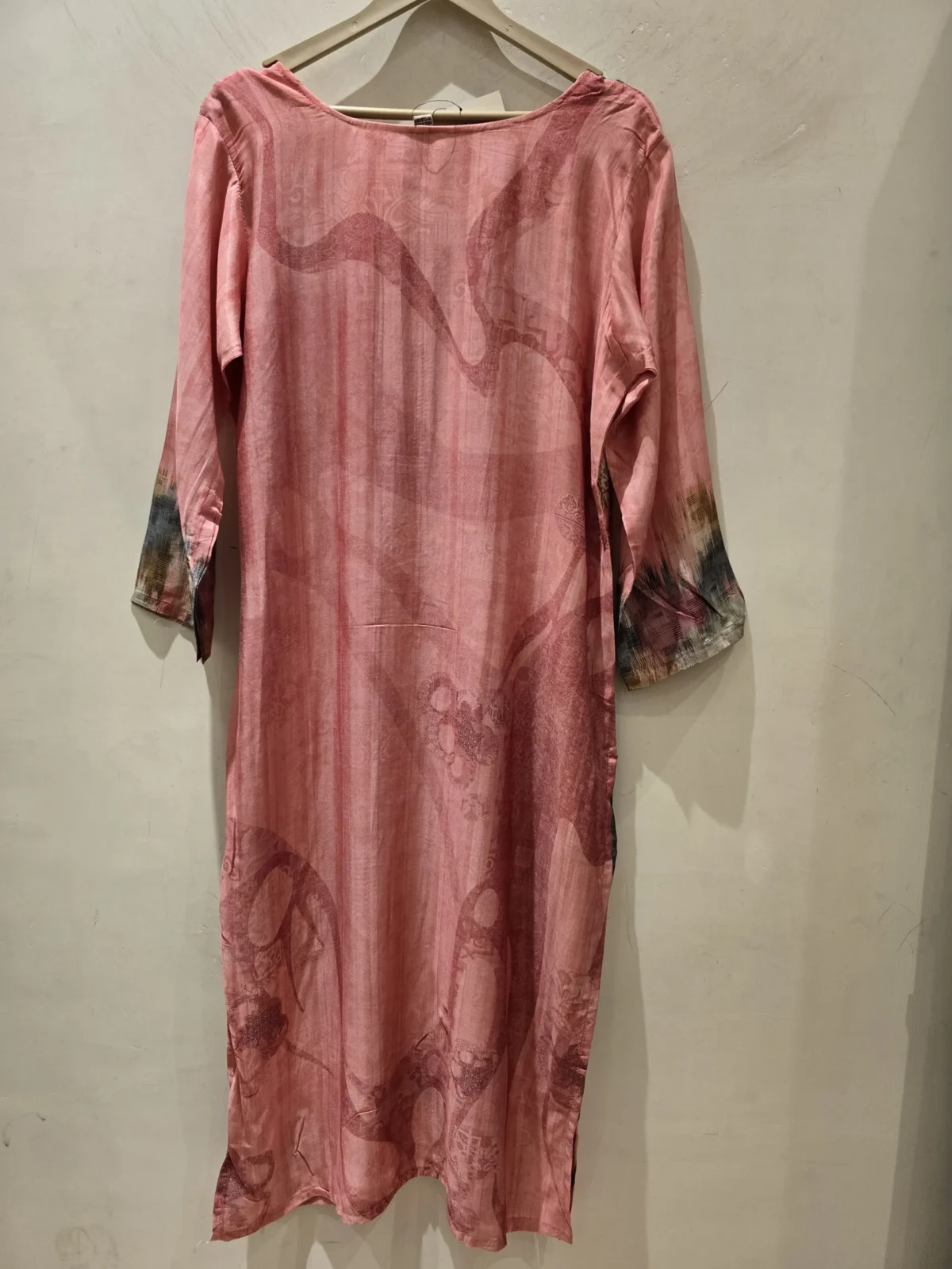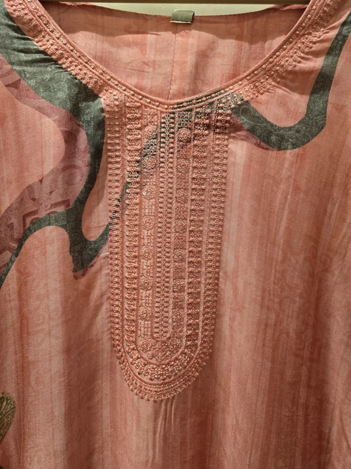 Refined pink muslin suit adorned with artistic prints and delicate embroidery, perfect for festive and elegant daytime wear.