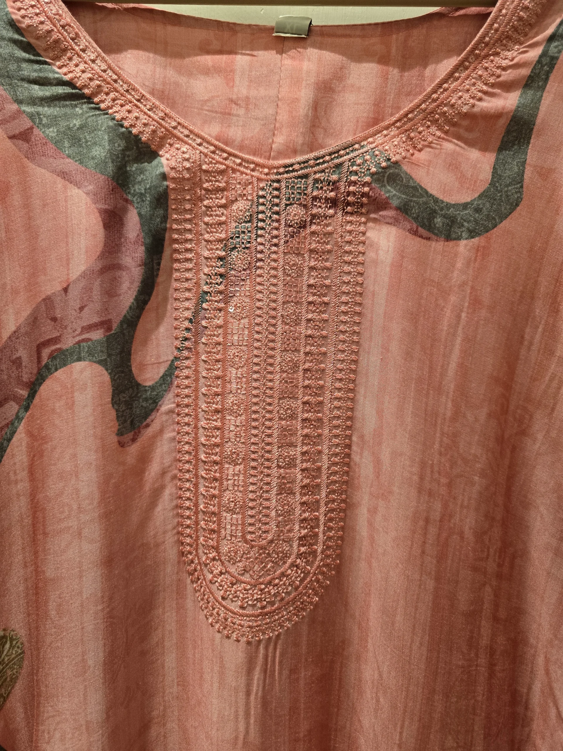 Crafted from soft muslin fabric, this suit promises breathability and fluidity while maintaining an effortlessly polished silhouette. The hand-highlighted details on the neckline and the dreamy printed dupatta make it an exquisite choice for brunch gatherings, festive evenings, or chic daywear.