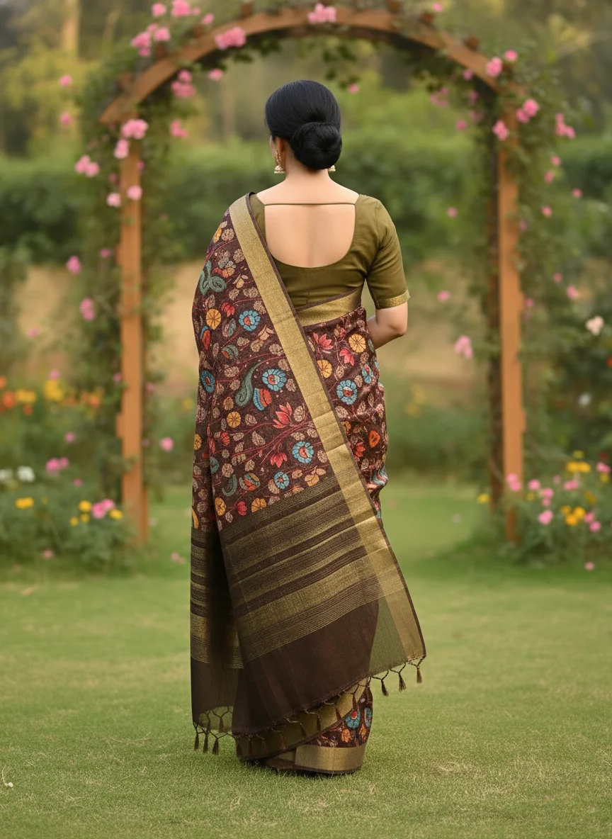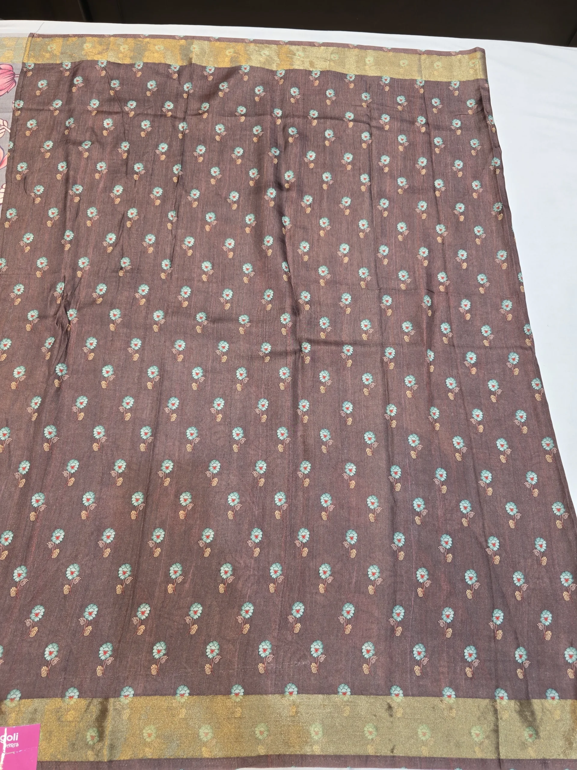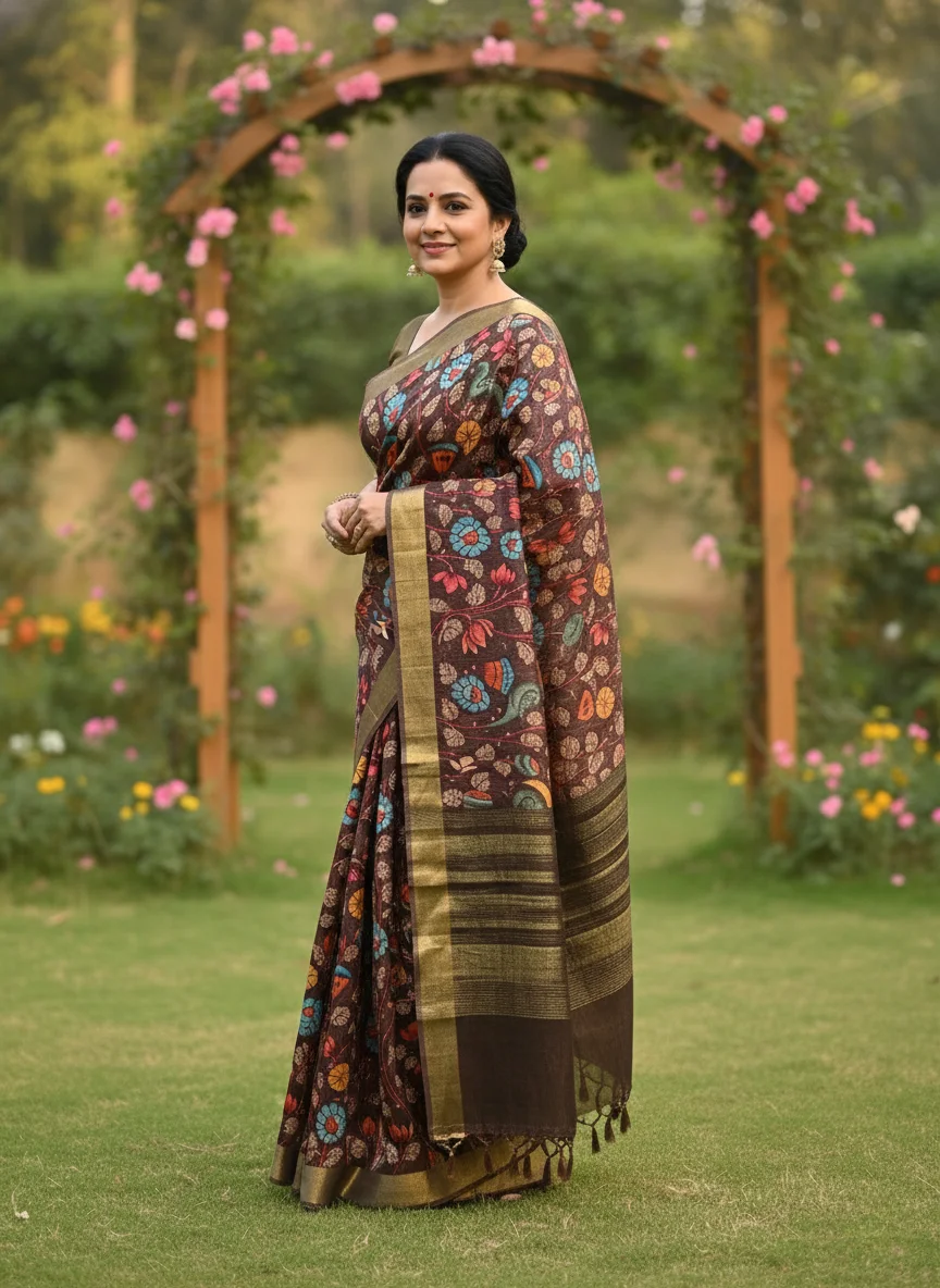 Drape yourself in the warmth of Indian artistry with this Brown Moonga Tussar printed saree, a masterpiece that embodies heritage and refinement.