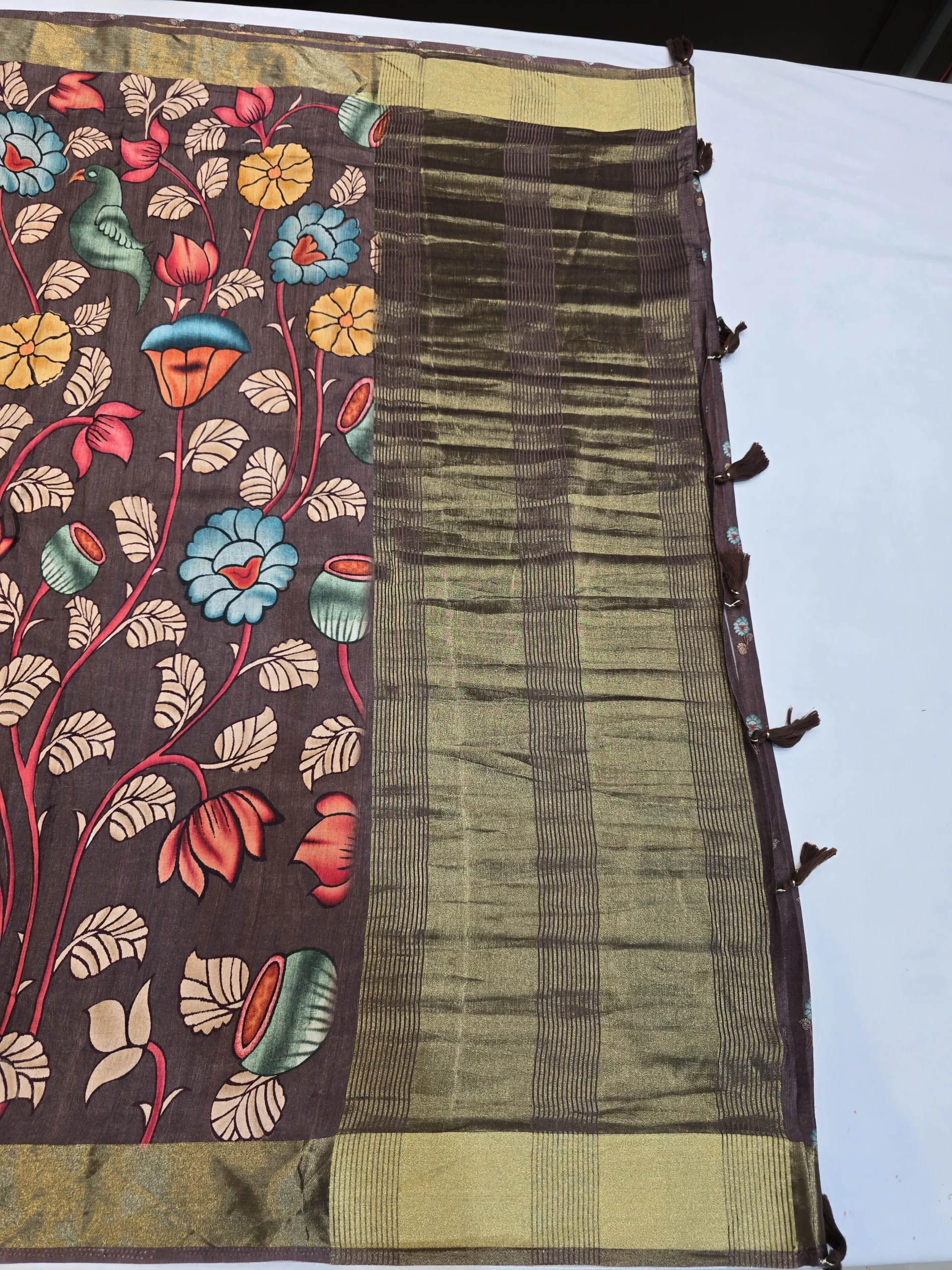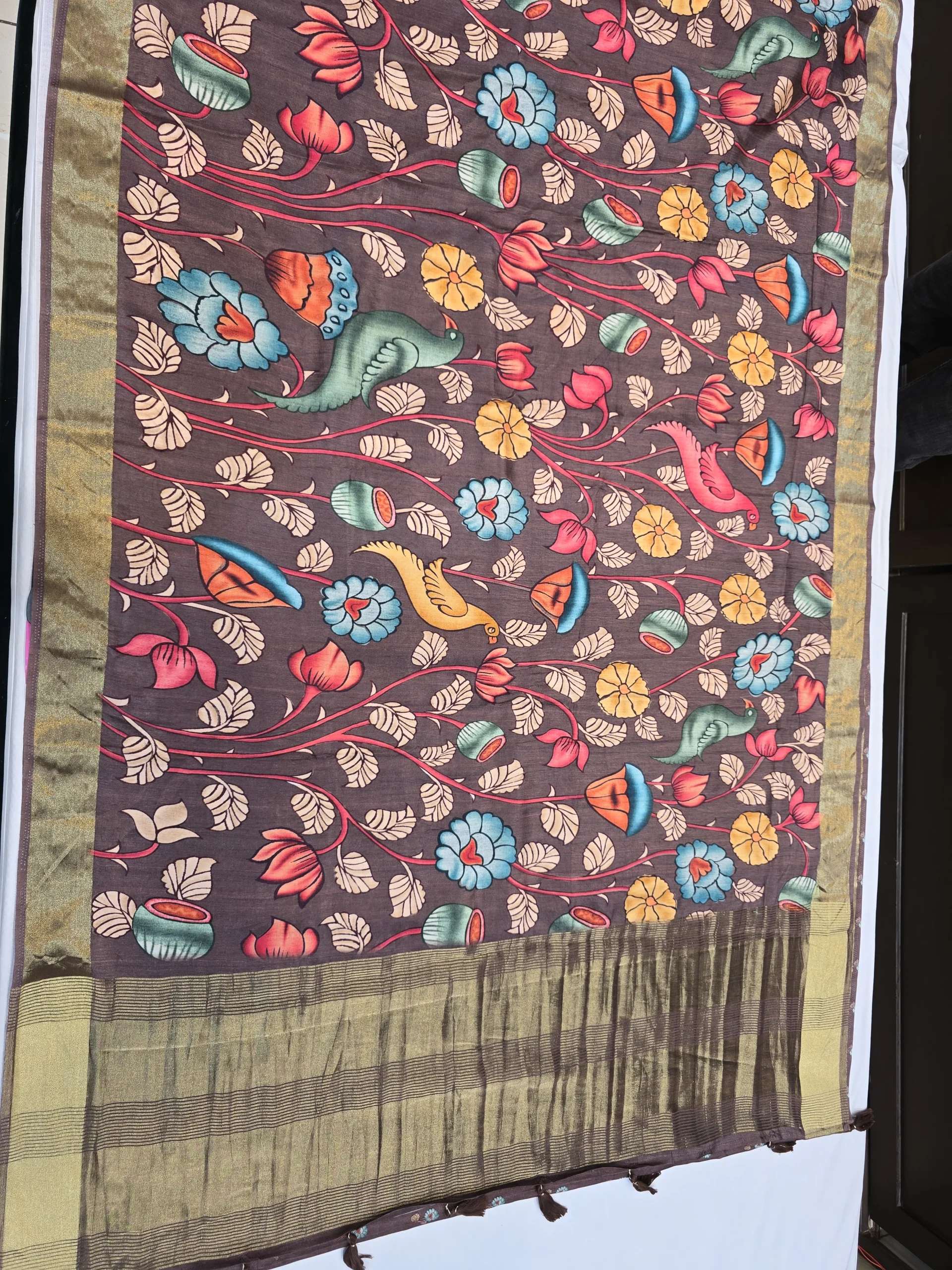 The saree features intricate Pichwai, Patola, and Kalamkari-inspired motifs — each telling stories of tradition and culture through their rich, timeless patterns. The woven zari border and 5–6 inch pallu add a royal glimmer, blending seamlessly with the earthy tones of the fabric.