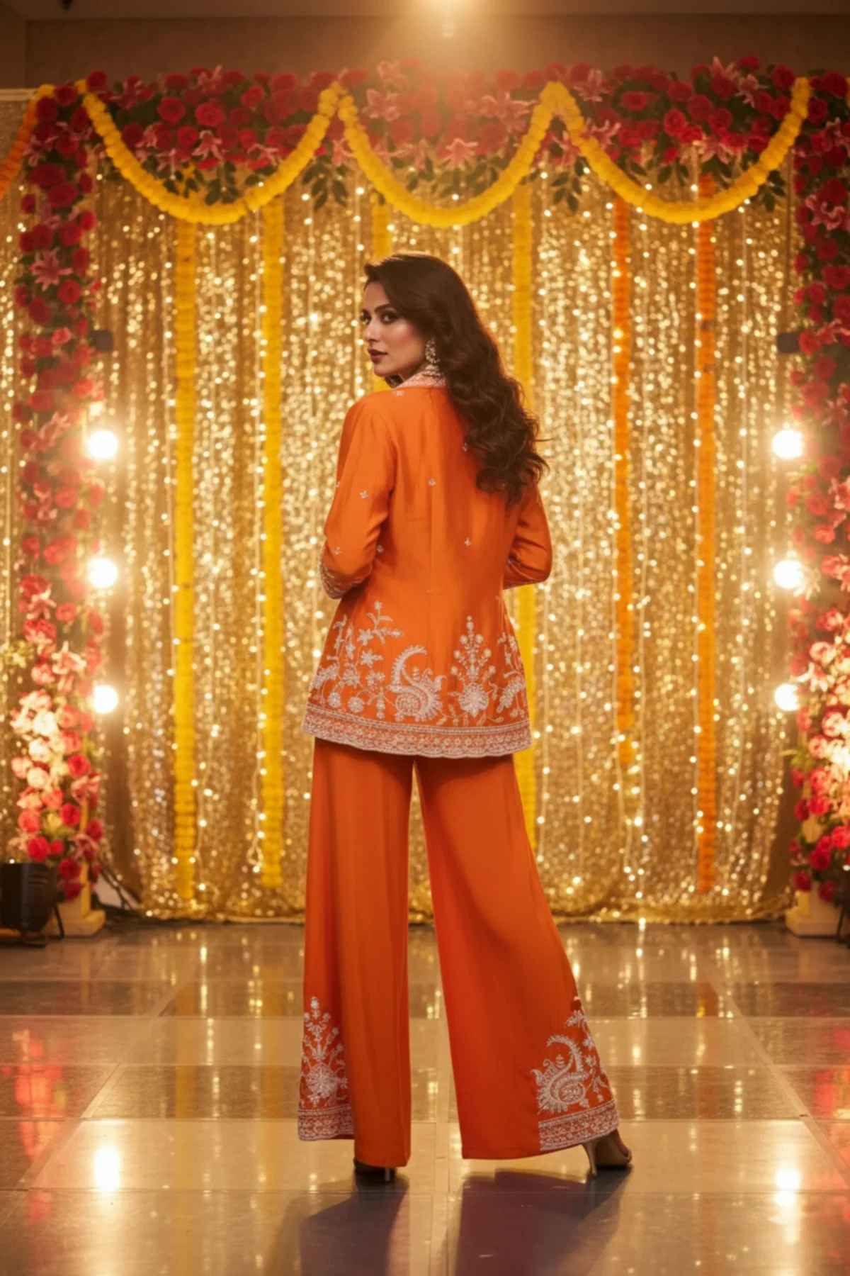 Radiate festive charm in Rangoli Saris’ Burnt Orange Chinnon Co-Ord Set — a blend of luxurious embroidery and bold elegance for modern celebrations.
