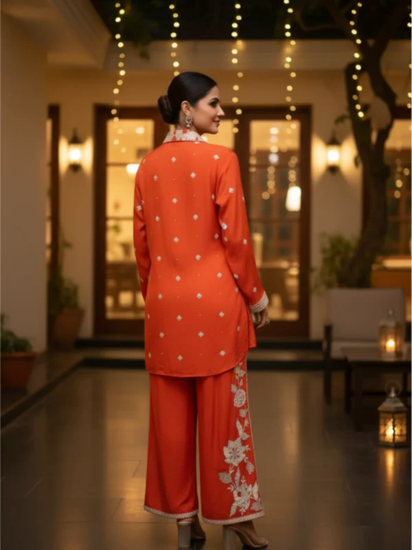 This burnt orange chinnon co-ord set features stunning thread and sequin embroidery that adds a festive yet refined charm. The front-open collared kurta with detailed sleeve and border embroidery lends a chic, structured appeal, while the matching wide-leg pants flow with understated elegance, creating a silhouette that is both graceful and empowering.