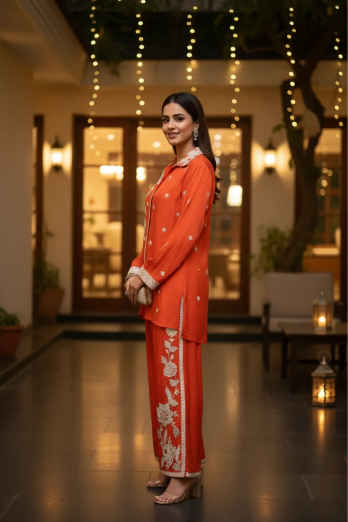 Burnt Orange Chinnon Co-Ord Set with exquisite embroidery — a radiant ensemble from Rangoli Saris, blending modern confidence with festive luxury.