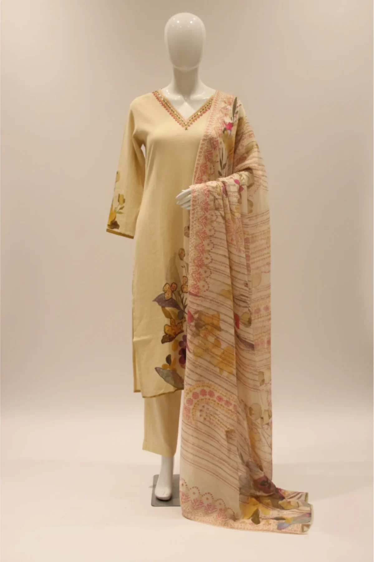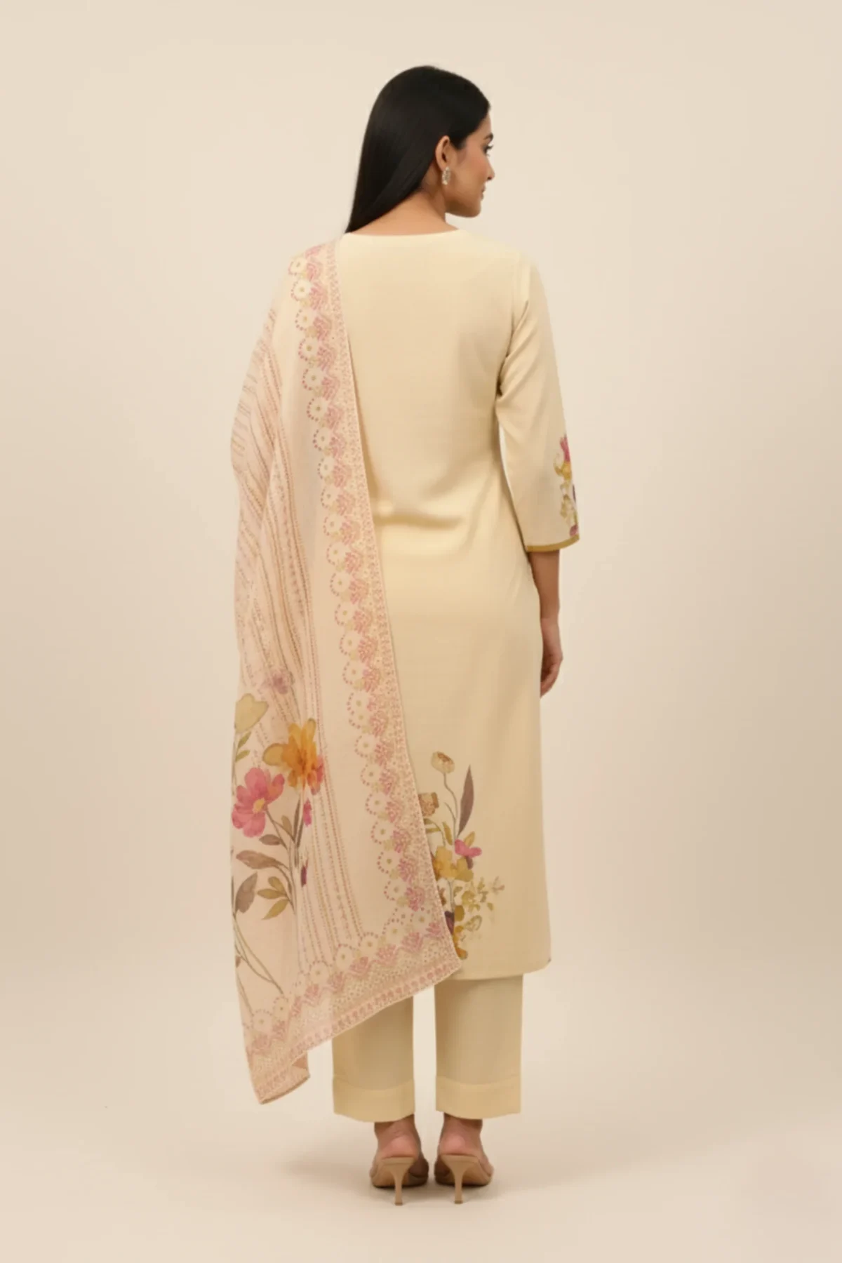 A graceful cream khadi suit with delicate printed motifs and highlight accents — a perfect fusion of art and effortless elegance.