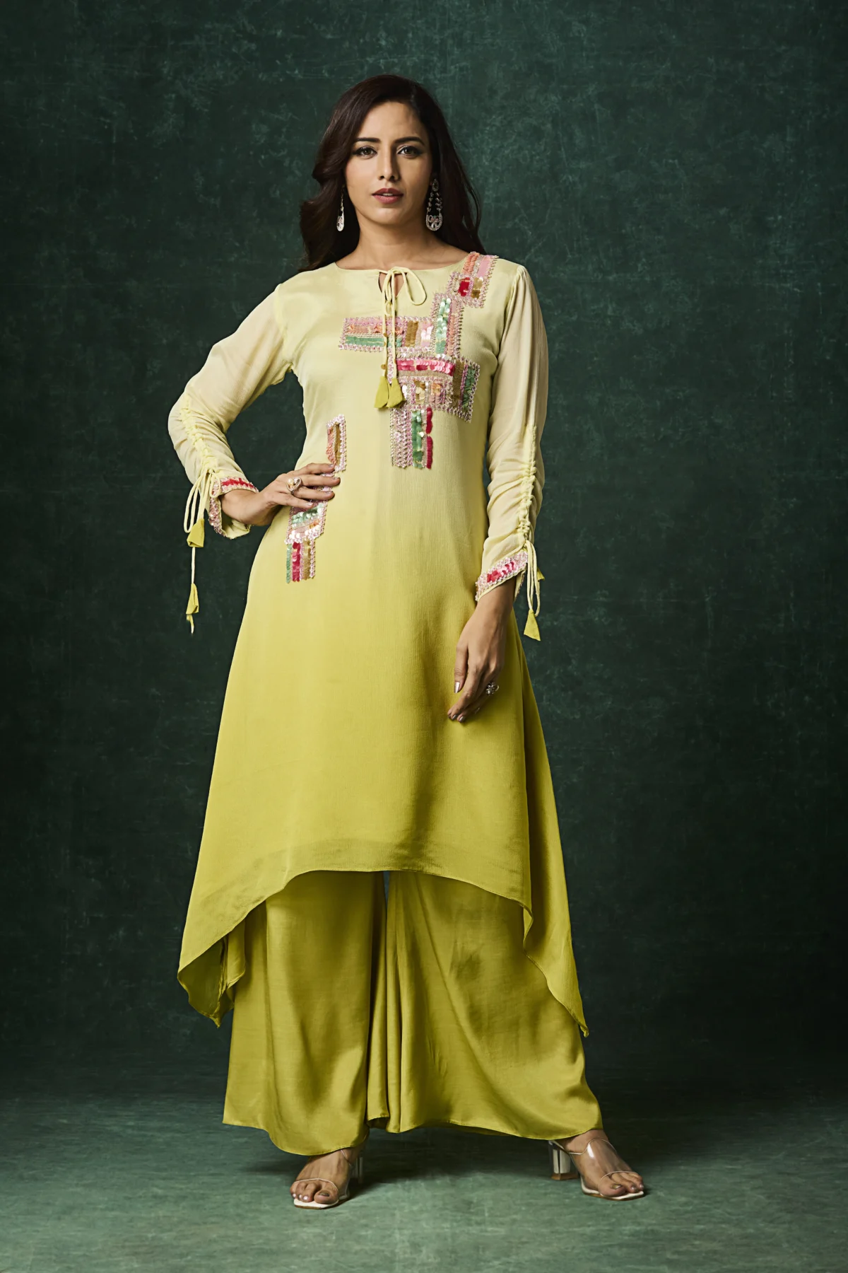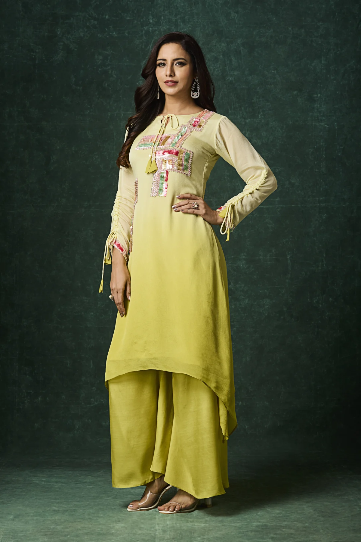 Sunshine yellow embroidered Indo-Western palazzo set featuring an asymmetrical high-low kurta with artistic thread detailing and fluid wide-leg bottoms — perfect for festive and occasion wear.