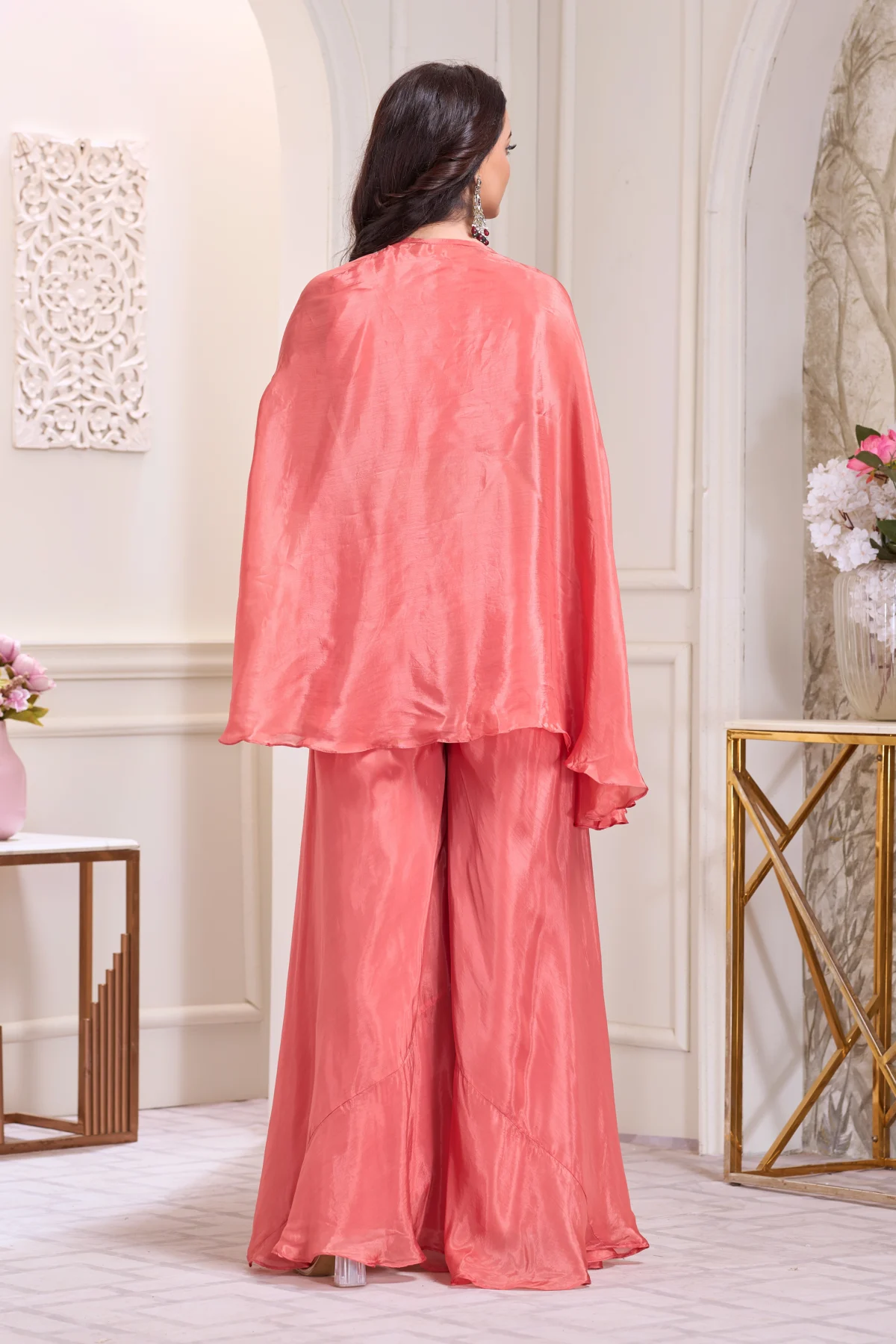 Coral embroidered Indo-Western cape set with designer blouse and wide palazzo pants — perfect for wedding and festive occasions.