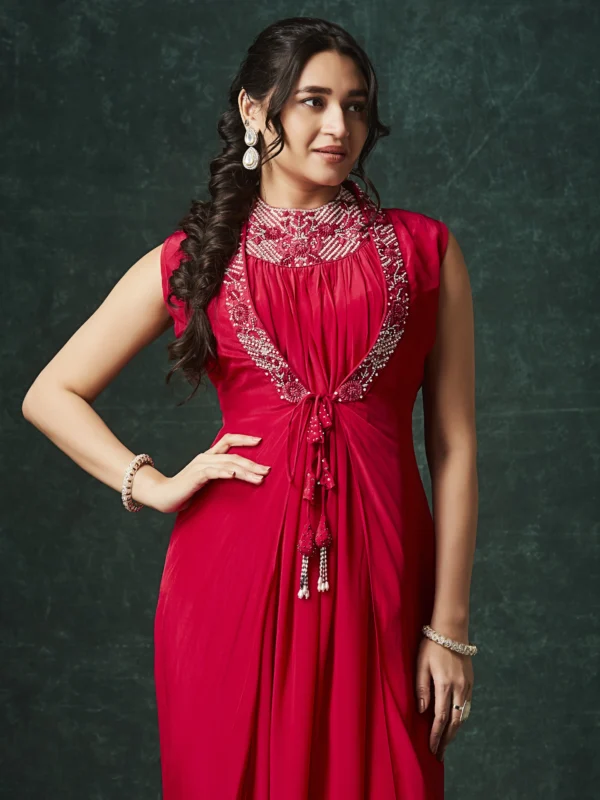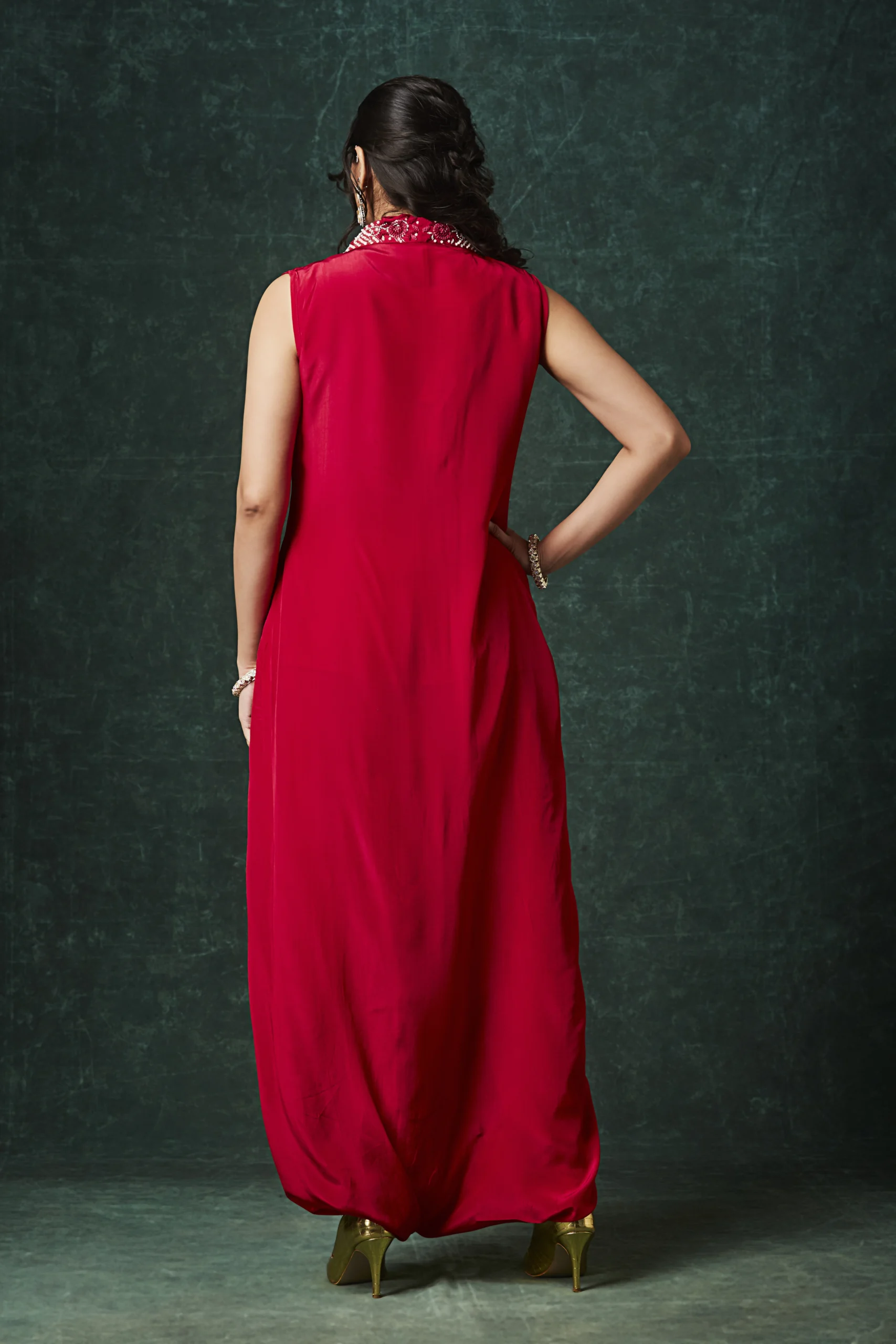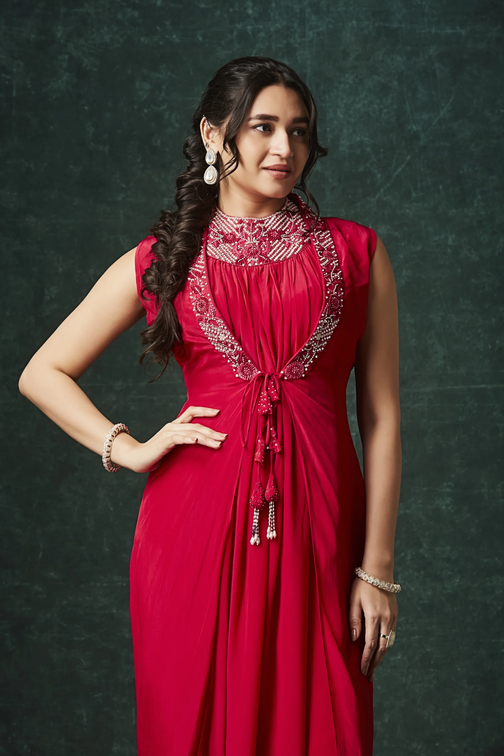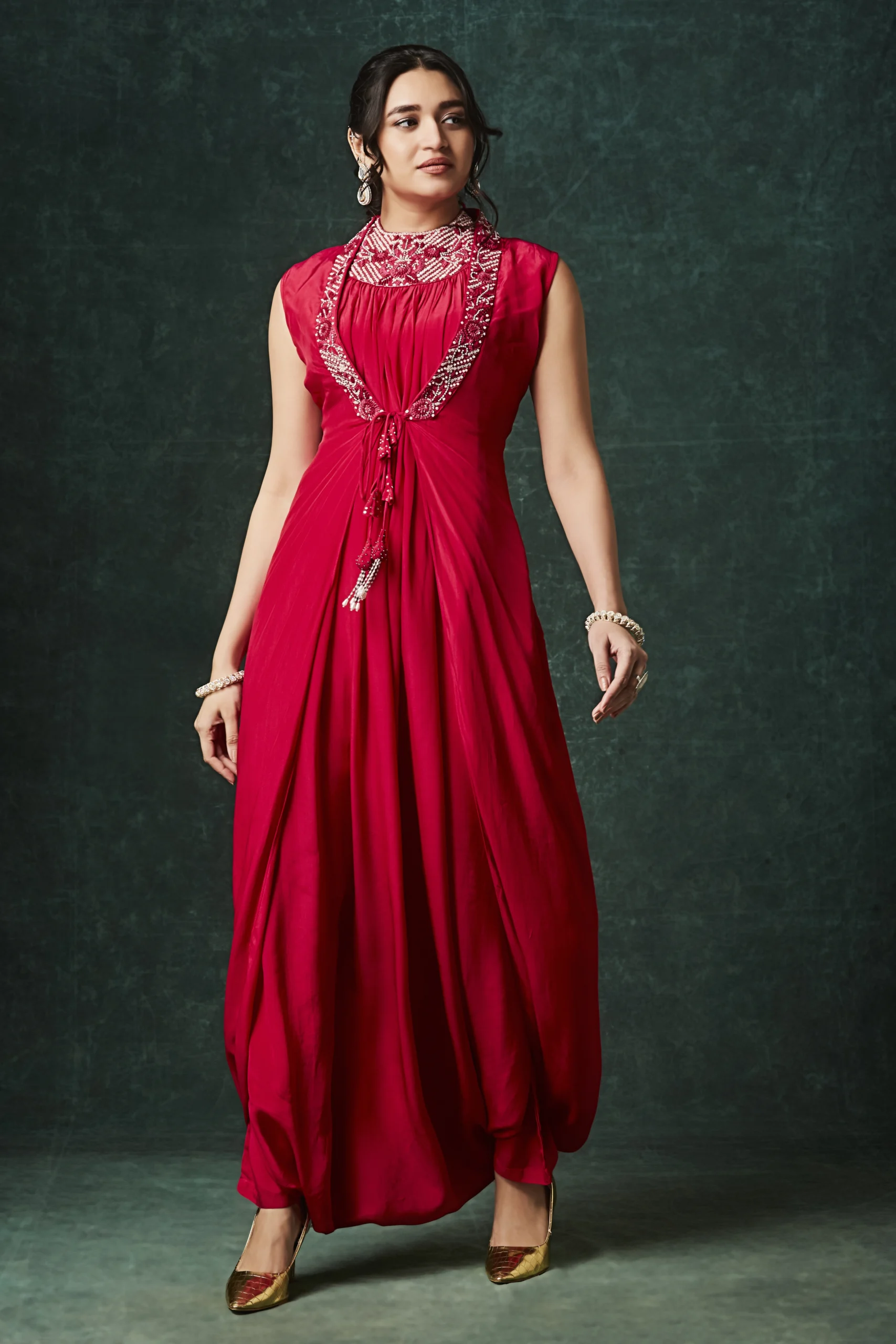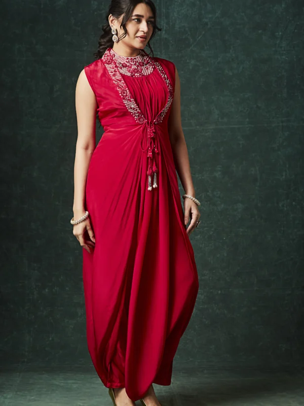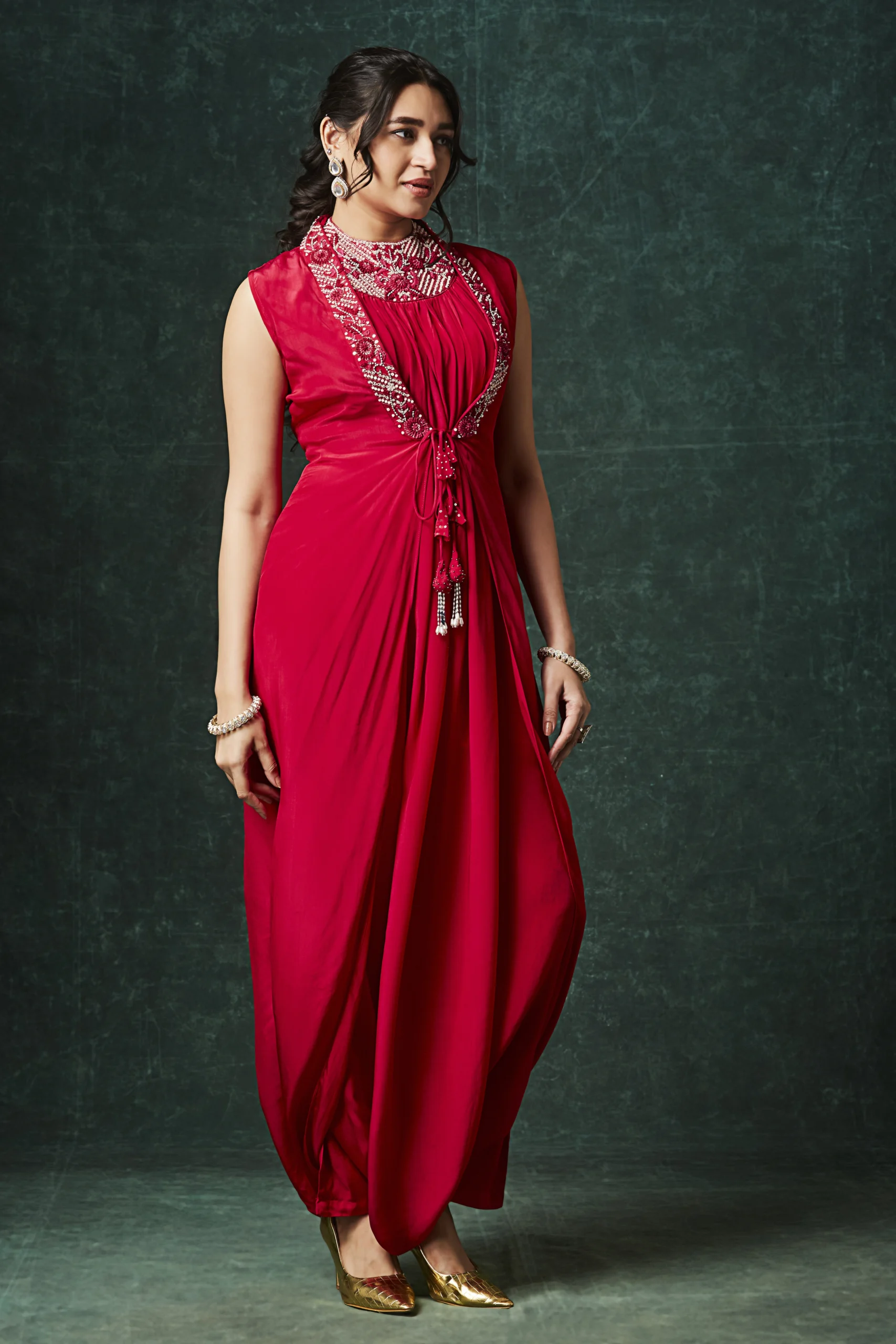 Crafted in a bold crimson red hue, this sleeveless indo-western dress features a fluid draped dhoti-style silhouette that flatters the body while offering graceful movement. The highlight lies in its heavily embellished neckline, adorned with intricate beadwork, fine embroidery, and delicate crystal accents that instantly elevate the ensemble.