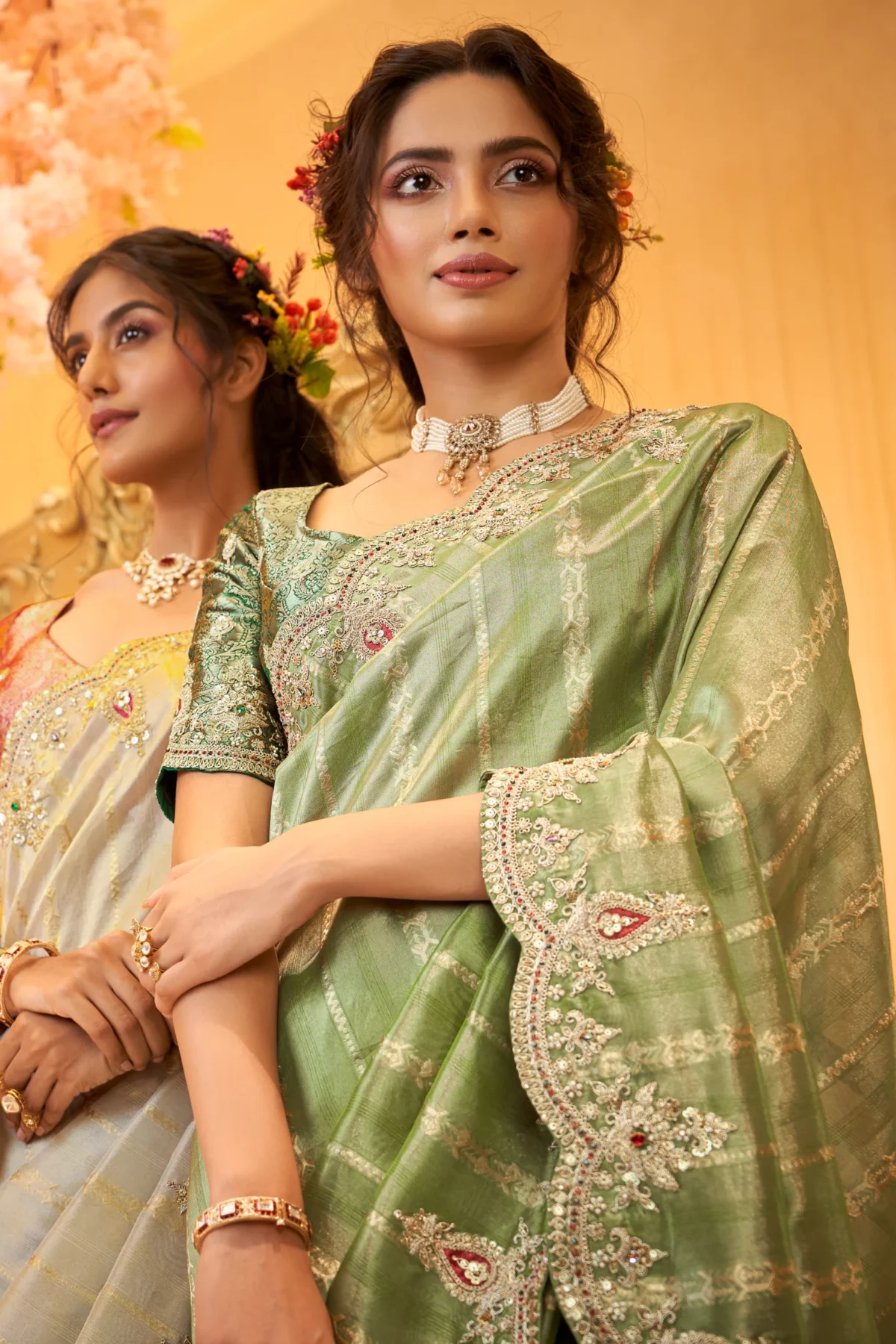 Emerald silk saree with scalloped hand embroidery, shimmering woven texture, and unstitched designer blouse—crafted for luxurious celebrations.