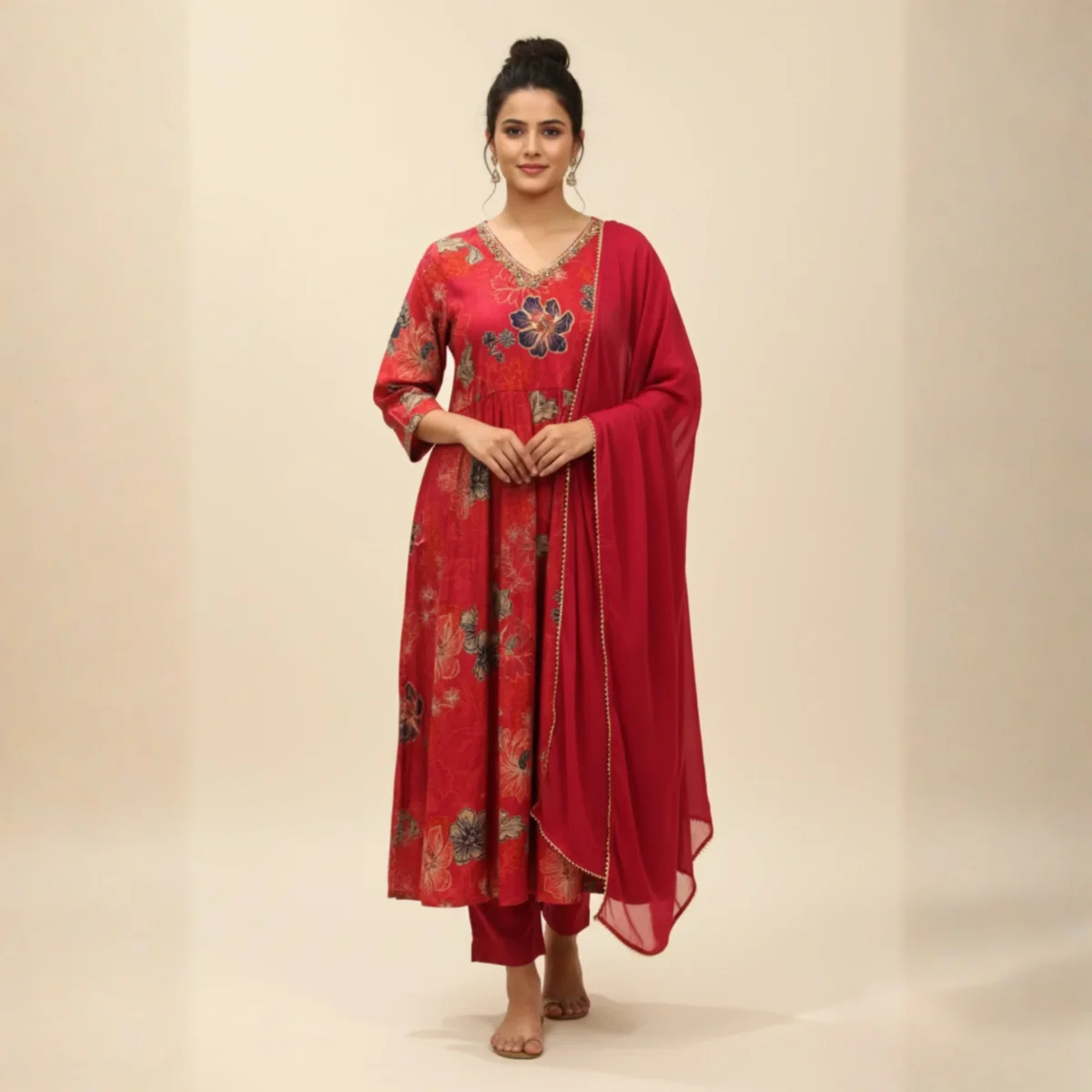 Bright Pink Model Silk suit adorned with floral print work — a perfect blend of festive charm, comfort, and timeless elegance.