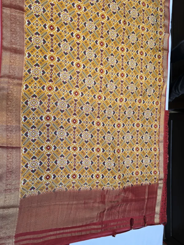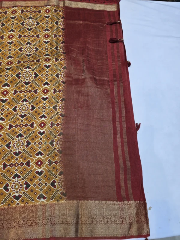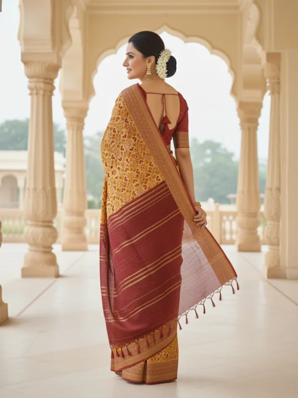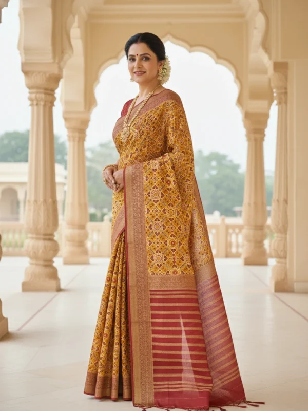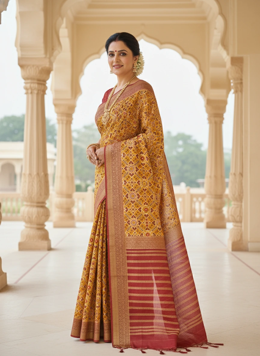 Celebrate the legacy of Indian textile art with this Golden Mustard Moonga Tussar Printed Saree — a treasure that echoes the artistry of ancient weavers. Inspired by the Patola, Pichwai, and Kalamkari traditions, this saree weaves stories of grace through its delicate hand-drawn motifs and rich heritage hues.