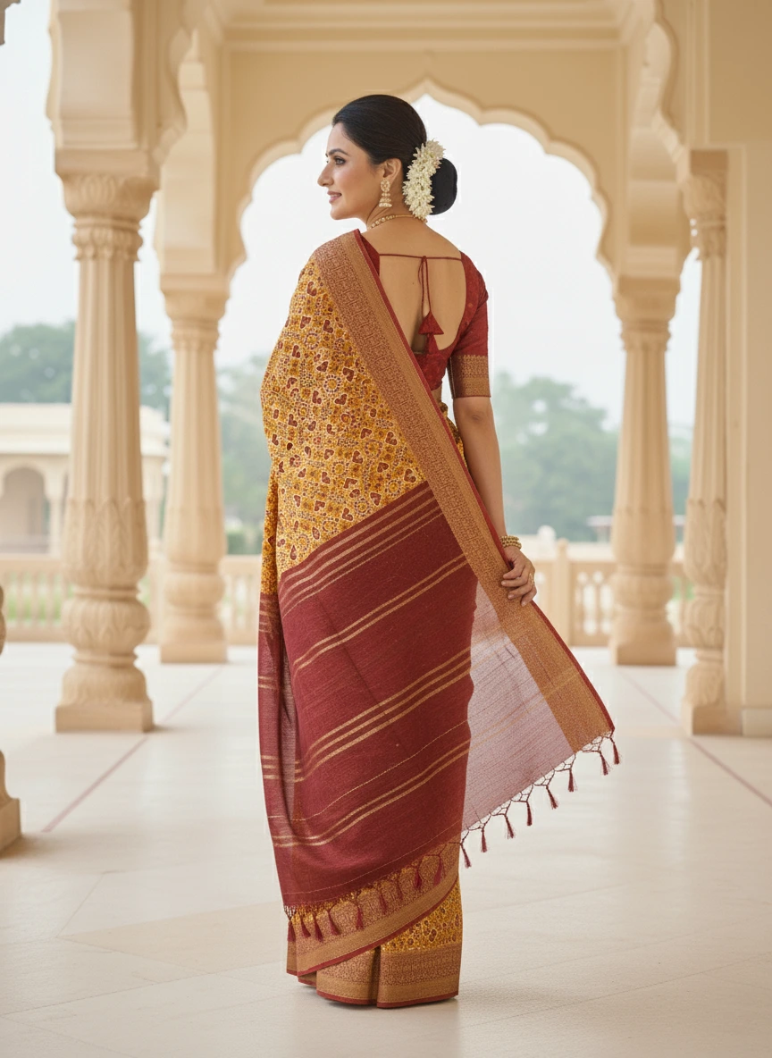 Paired with an 80 cm matching blouse piece, this 5.5-metre masterpiece embodies the perfect harmony of craftsmanship and contemporary appeal — made for women who value elegance rooted in tradition.