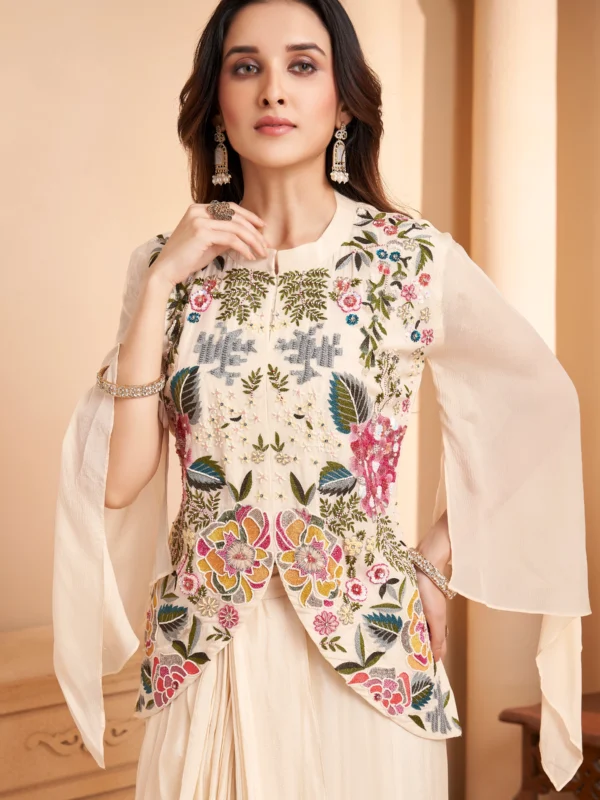 Ivory embroidered Indo-Western drape set with floral bodice and cape sleeves — perfect for wedding and festive occasions.