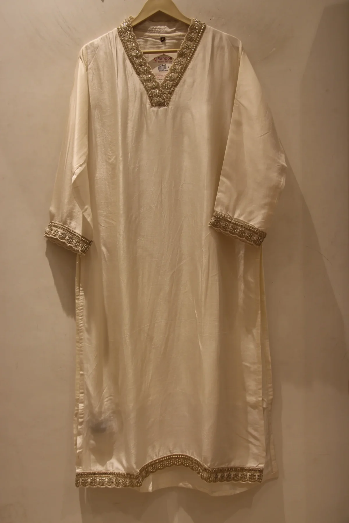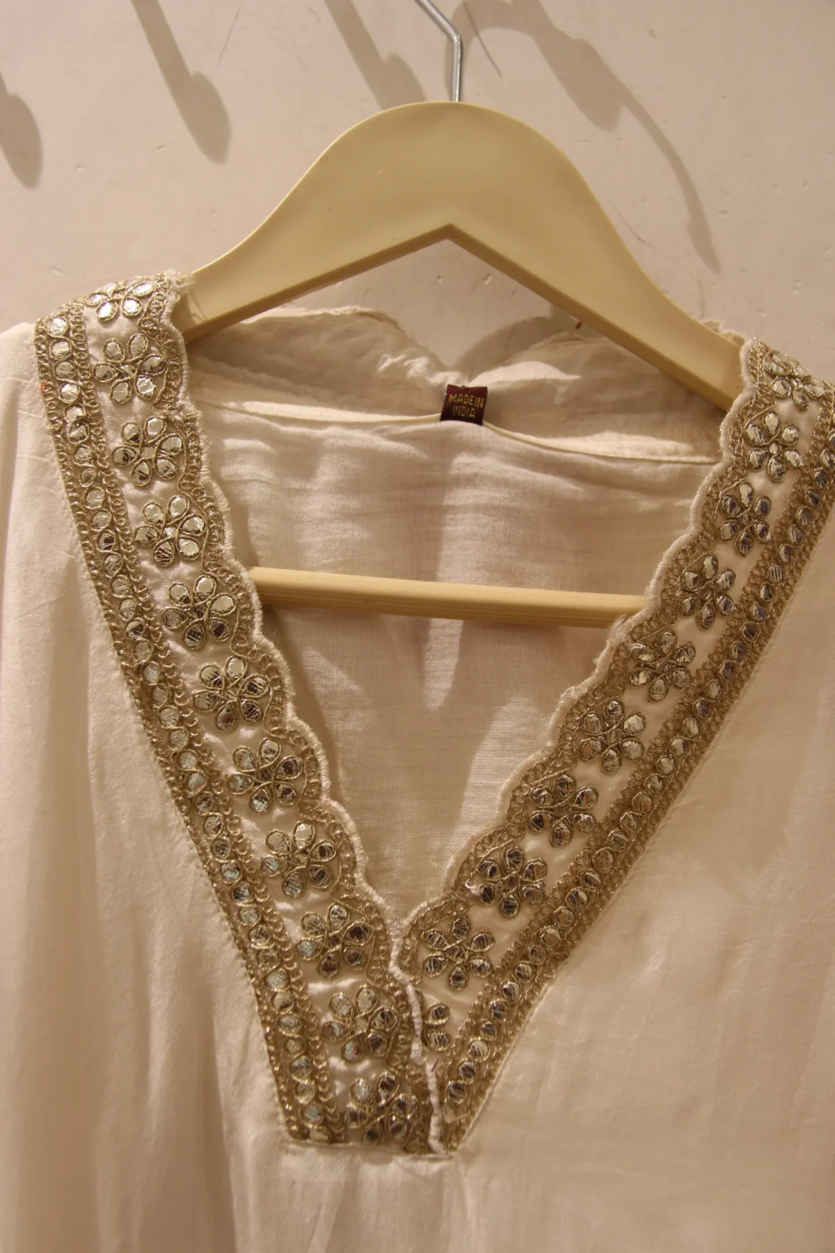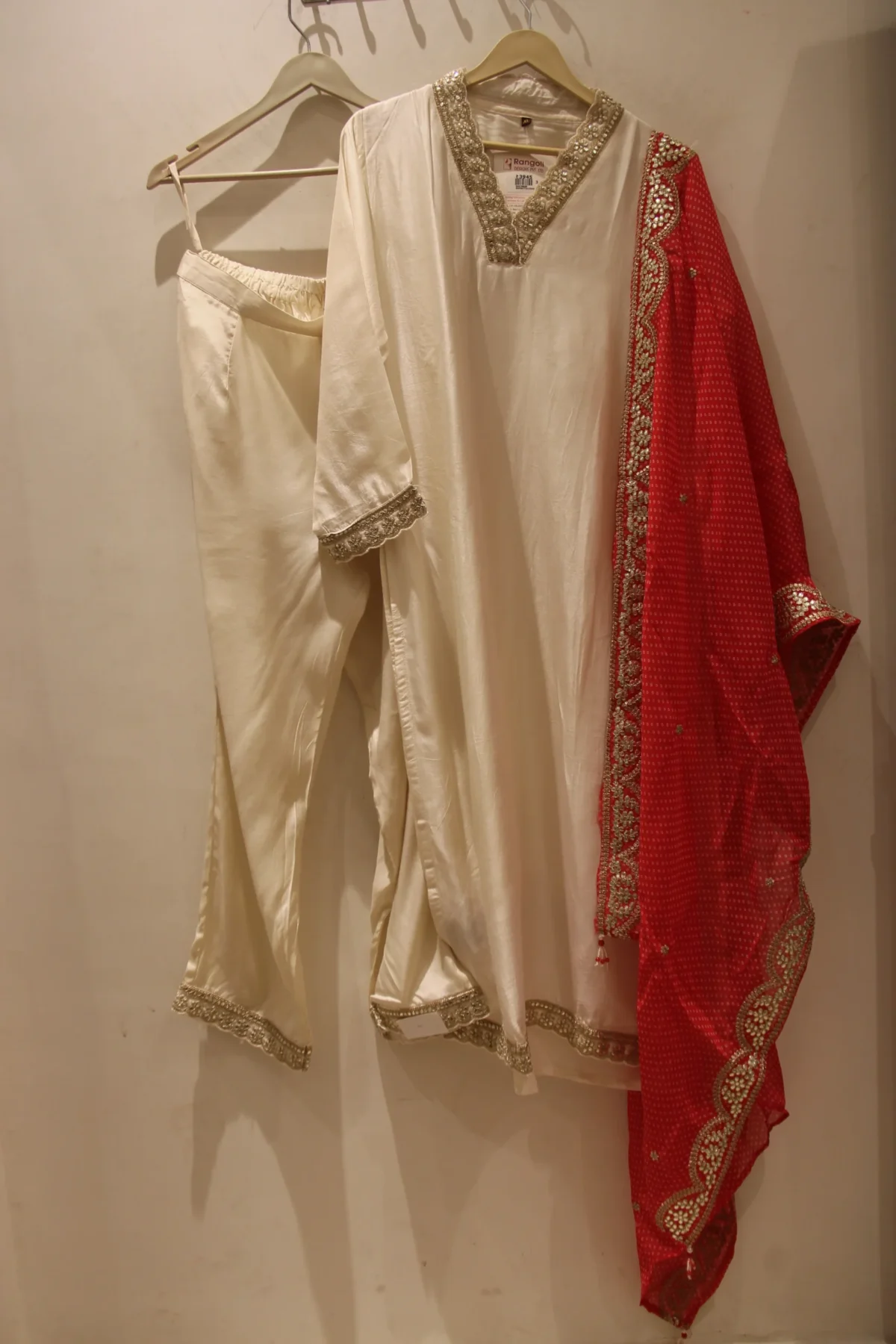An elegant off-white muslin suit featuring delicate neckline embroidery and a graceful silhouette — perfect for festive and daytime elegance.