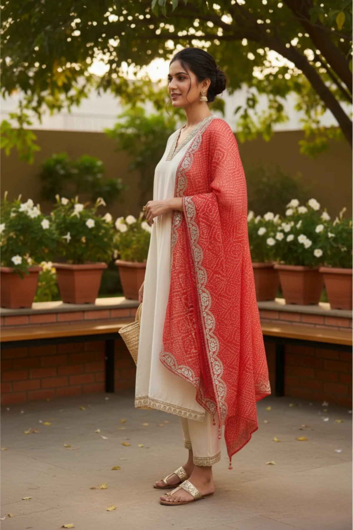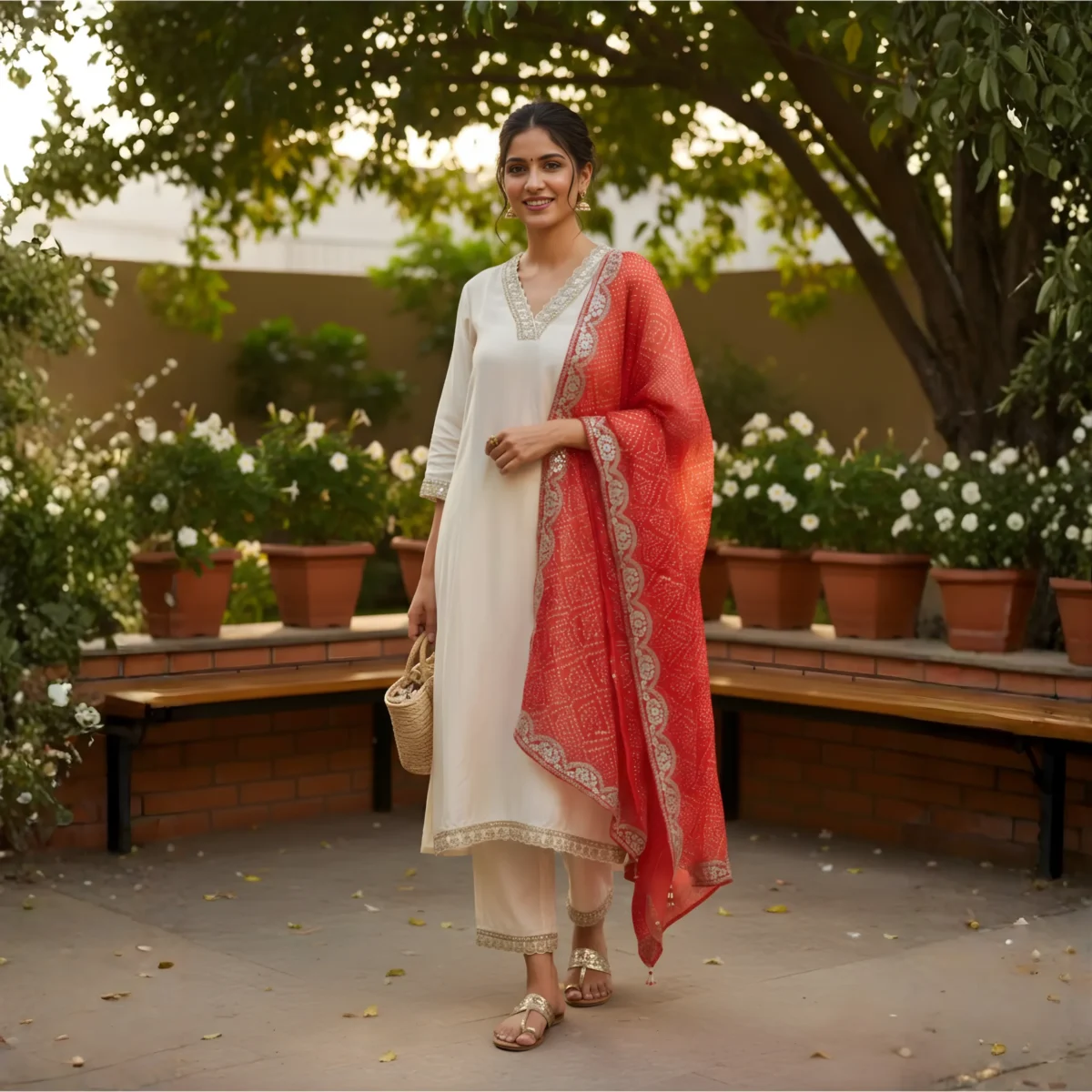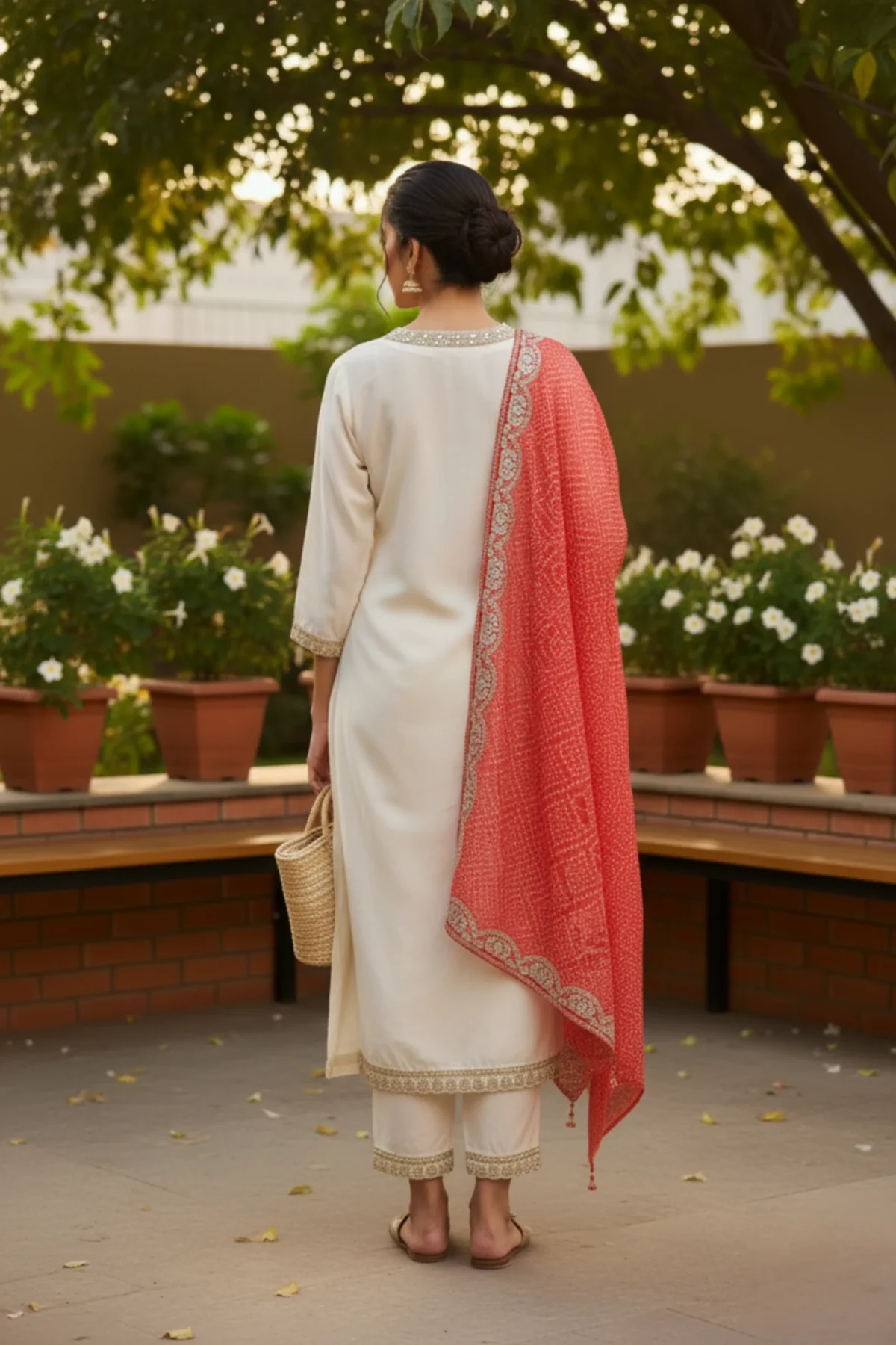 An elegant off-white muslin suit featuring delicate neckline embroidery and a graceful silhouette — perfect for festive and daytime elegance.