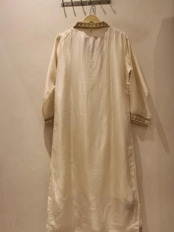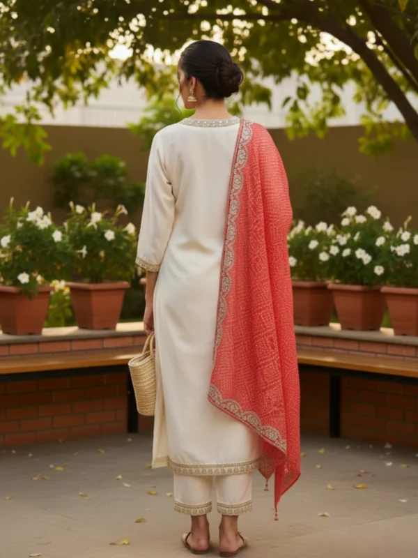 The ensemble’s lightweight drape and flowy silhouette make it ideal for warm days, while its minimal yet luxurious design ensures versatility — perfect for casual gatherings, festive brunches, or elegant daytime events. Paired with an intricately bordered dupatta in vibrant tones, this outfit radiates effortless grace and understated charm.