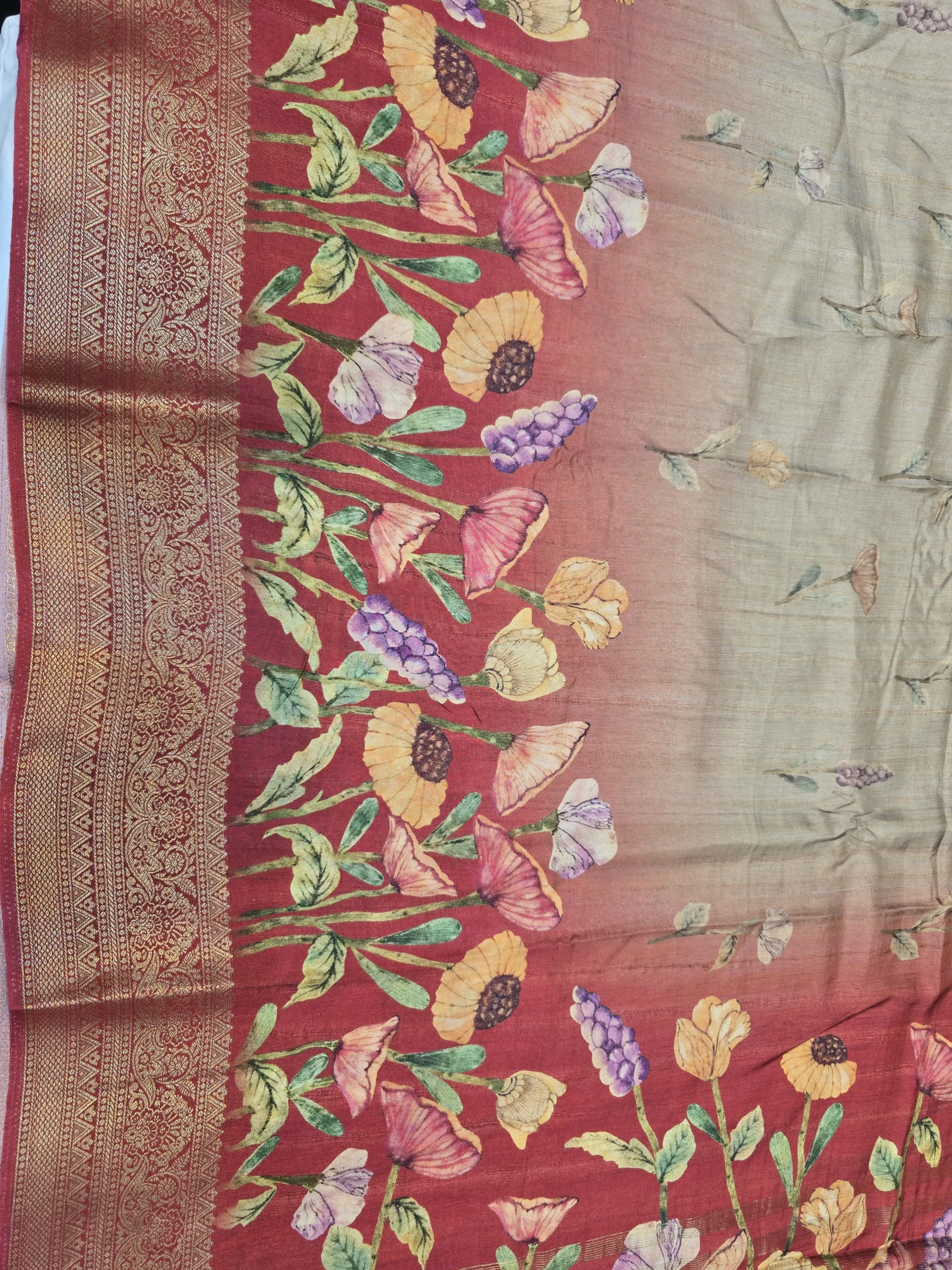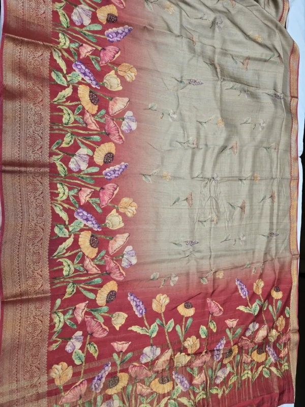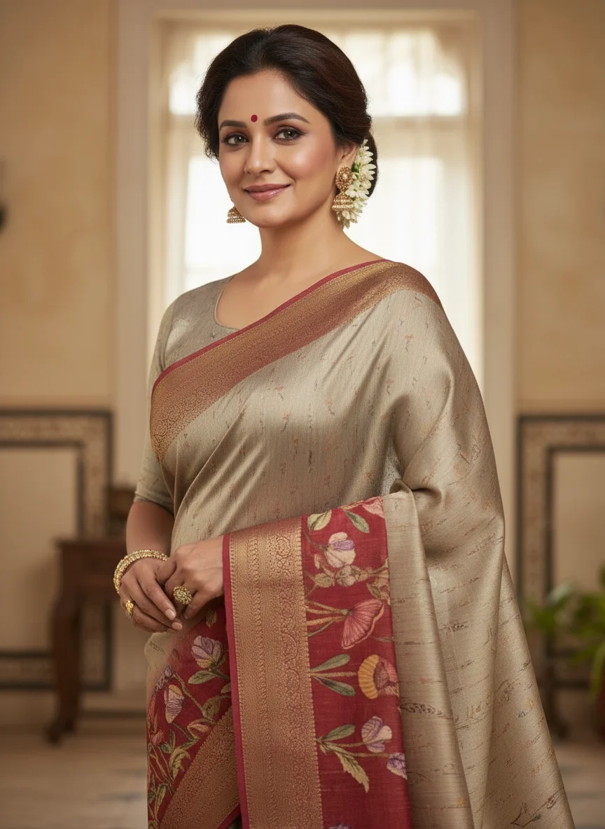 Immerse yourself in heritage artistry with this Ivory Moonga Tussar Printed Saree — a celebration of classic Indian craftsmanship and eternal grace.