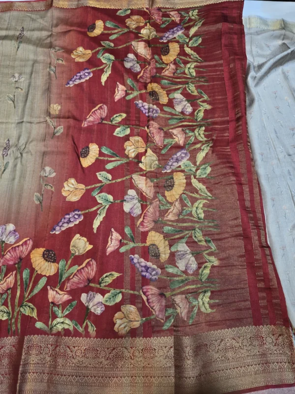 Drawing inspiration from Pichwai, Patola, and Kalamkari traditions, this saree showcases delicate floral motifs gracefully blooming across a soothing ivory base. The rich woven zari border and 5–6 inch intricately designed pallu add a regal charm, making it an exquisite choice for women who appreciate understated luxury.