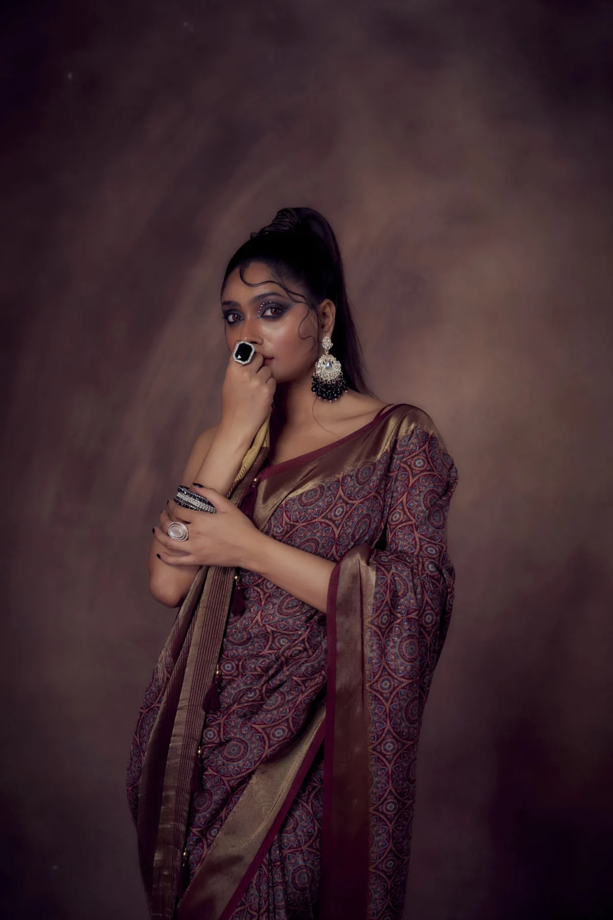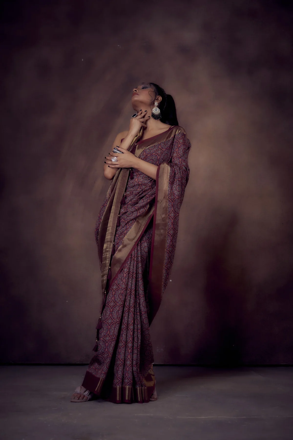 Maroon Moonga Tussar saree with Mandala prints, woven zari border, detailed pallu, and 80 cm blouse.