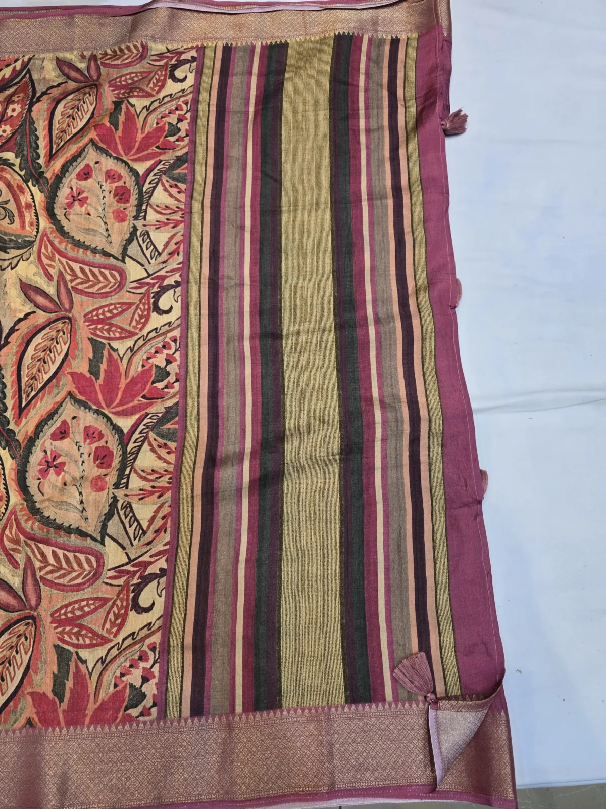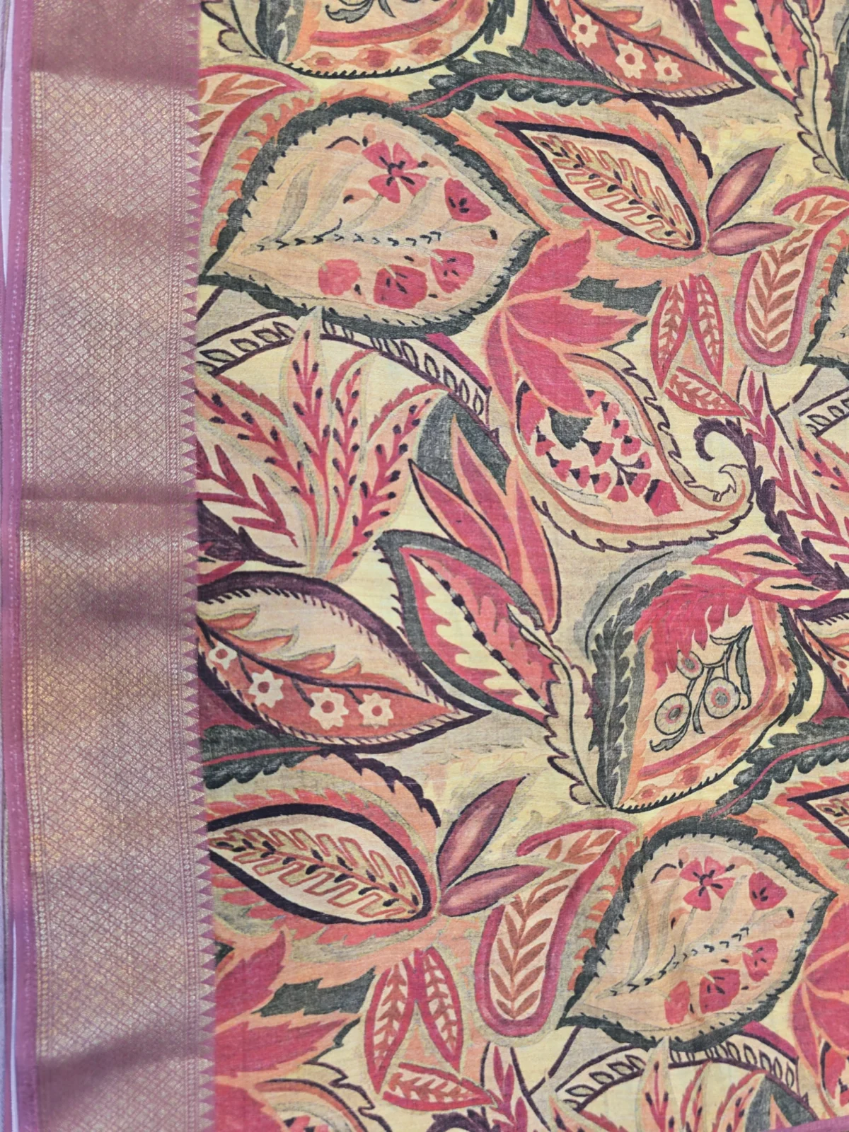An exquisite Maroon Moonga Tussar Saree featuring intricate Pichwai, Patola, and Kalamkari-inspired motifs. The rich woven zari border and 5–6 inch detailed pallu bring together heritage artistry and timeless sophistication. Includes an 80 cm matching blouse piece to complete your traditional ensemble.