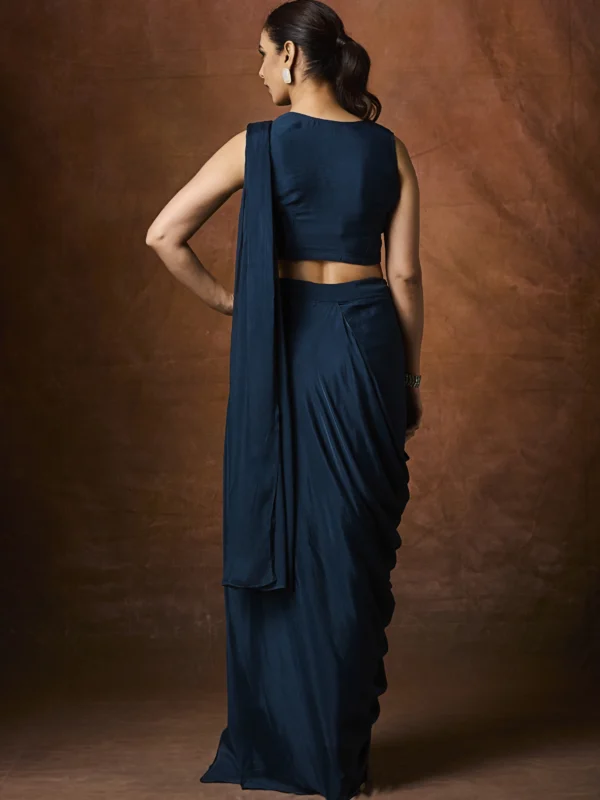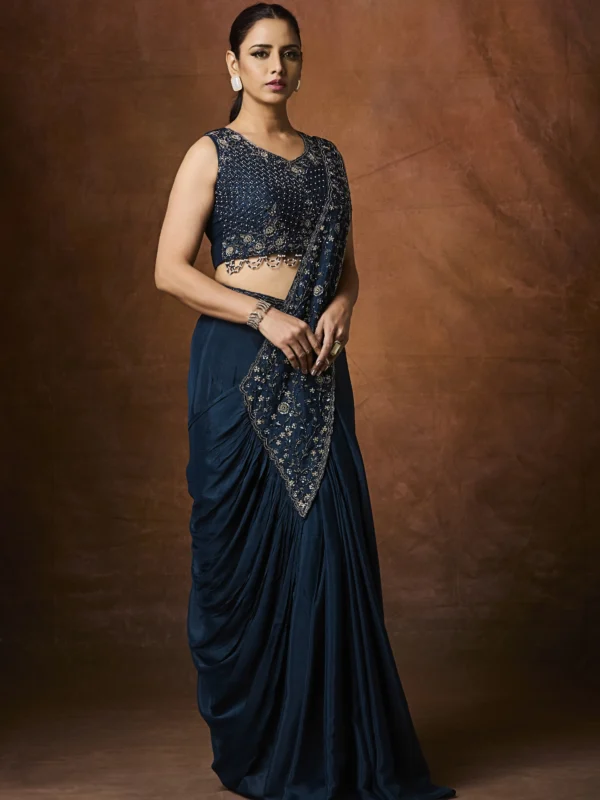 Be the first to review “Midnight Teal Hand-Embroidered Pre-Draped Saree”