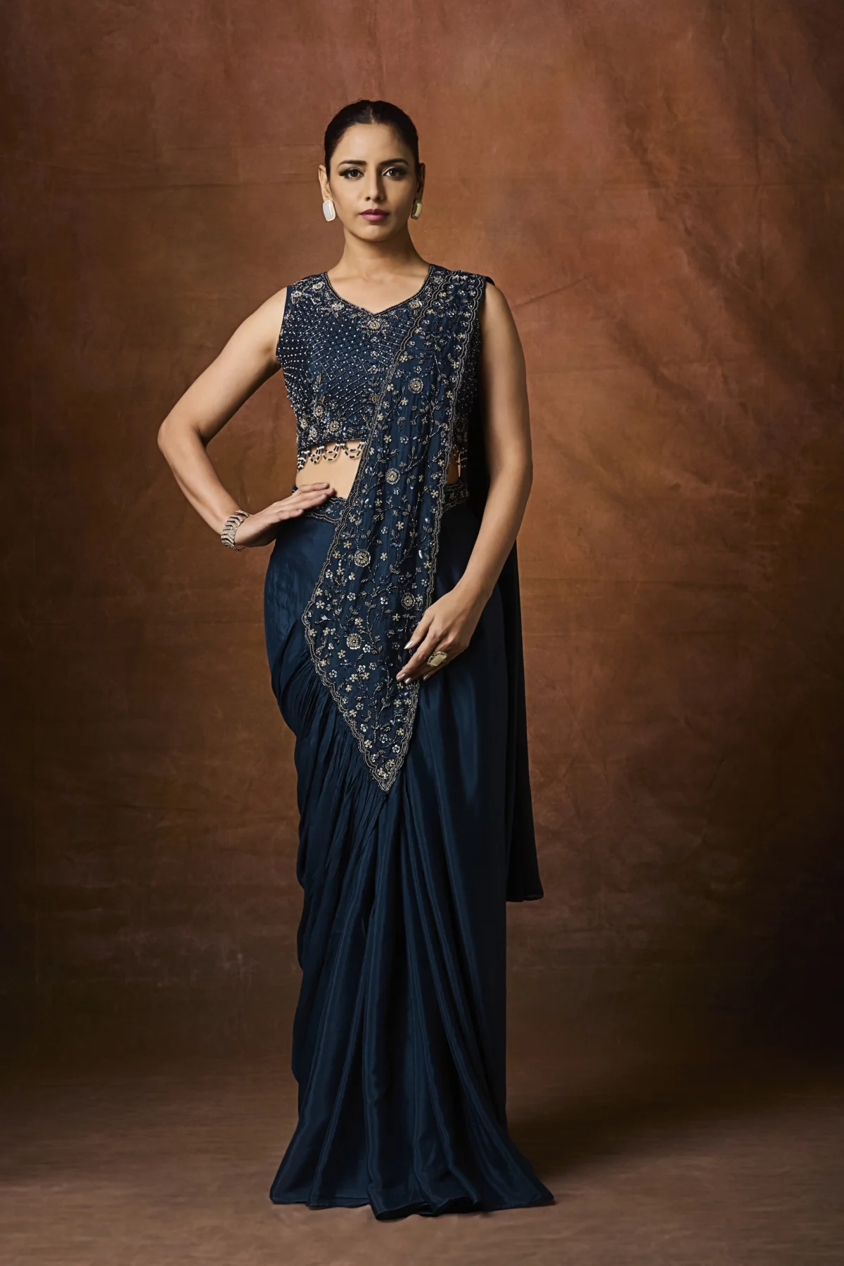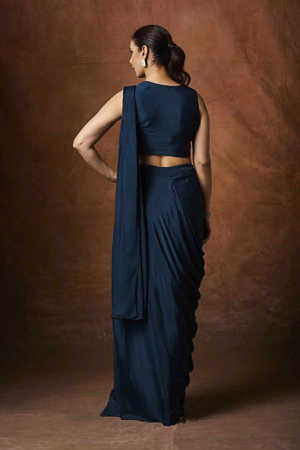 Midnight Teal Hand-Embroidered Pre-Draped Saree