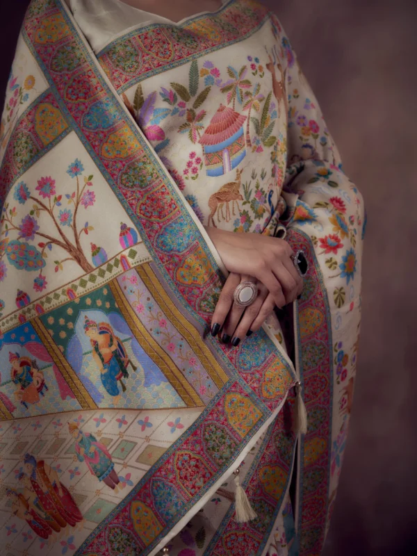 The serene ivory base allows each handcrafted-inspired motif — from cows, lotuses, florals, temple elements, to scenic court illustrations — to shine vibrantly. A beautifully detailed woven jari border frames the saree with regal precision, while the 5–6” intricate pallu elevates its grandeur, making it suitable for festive galas, poojas, weddings, and elegant cultural evenings.
