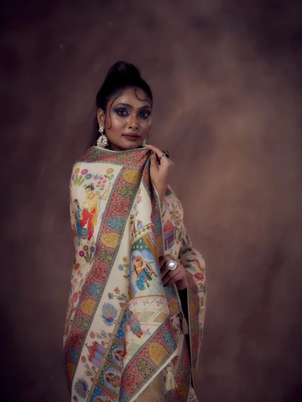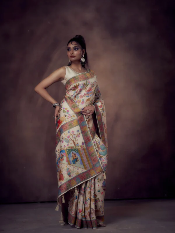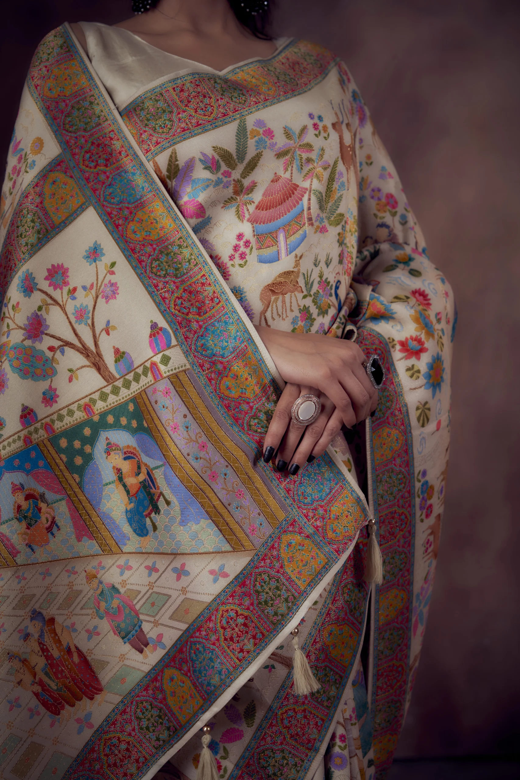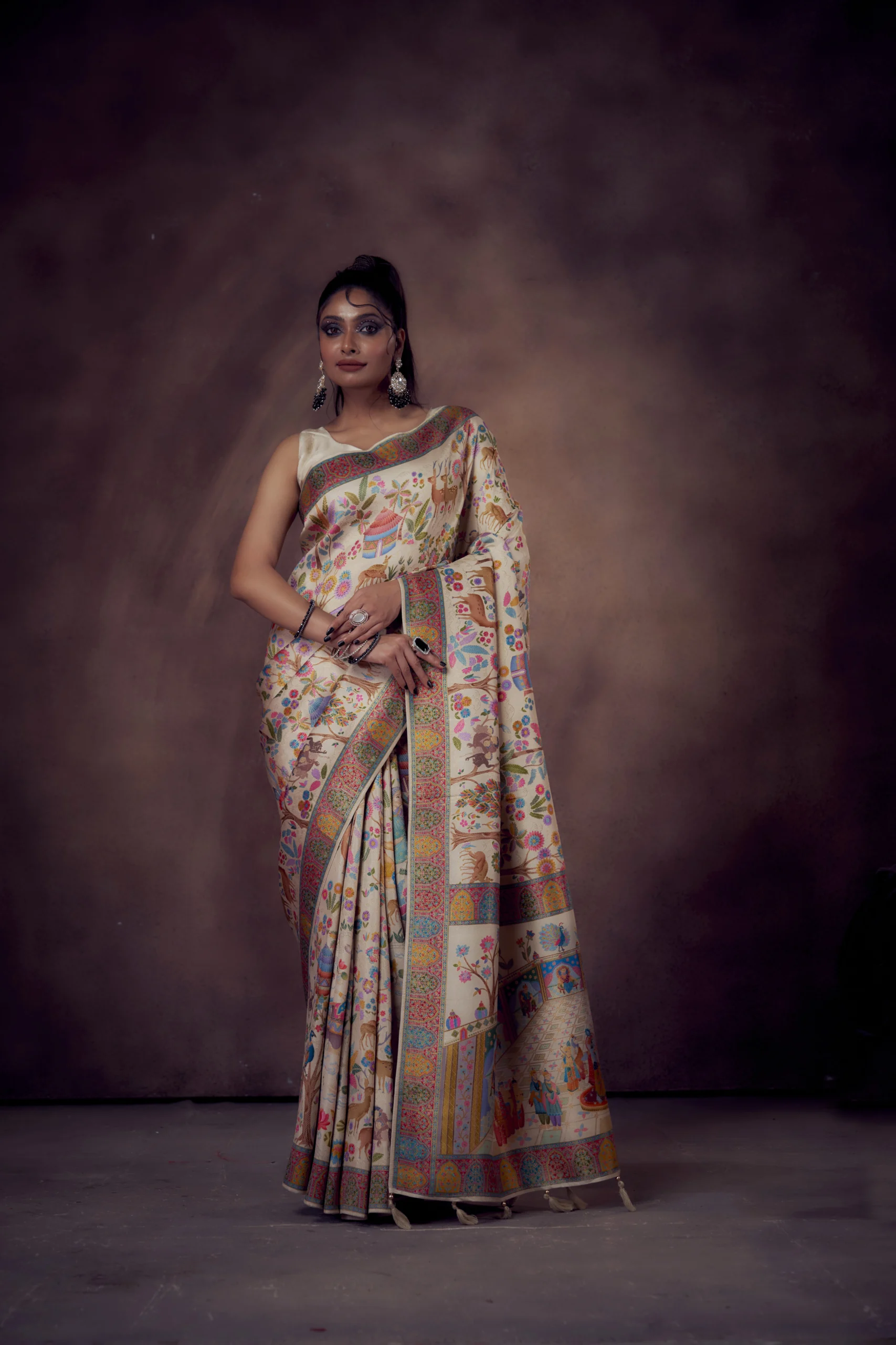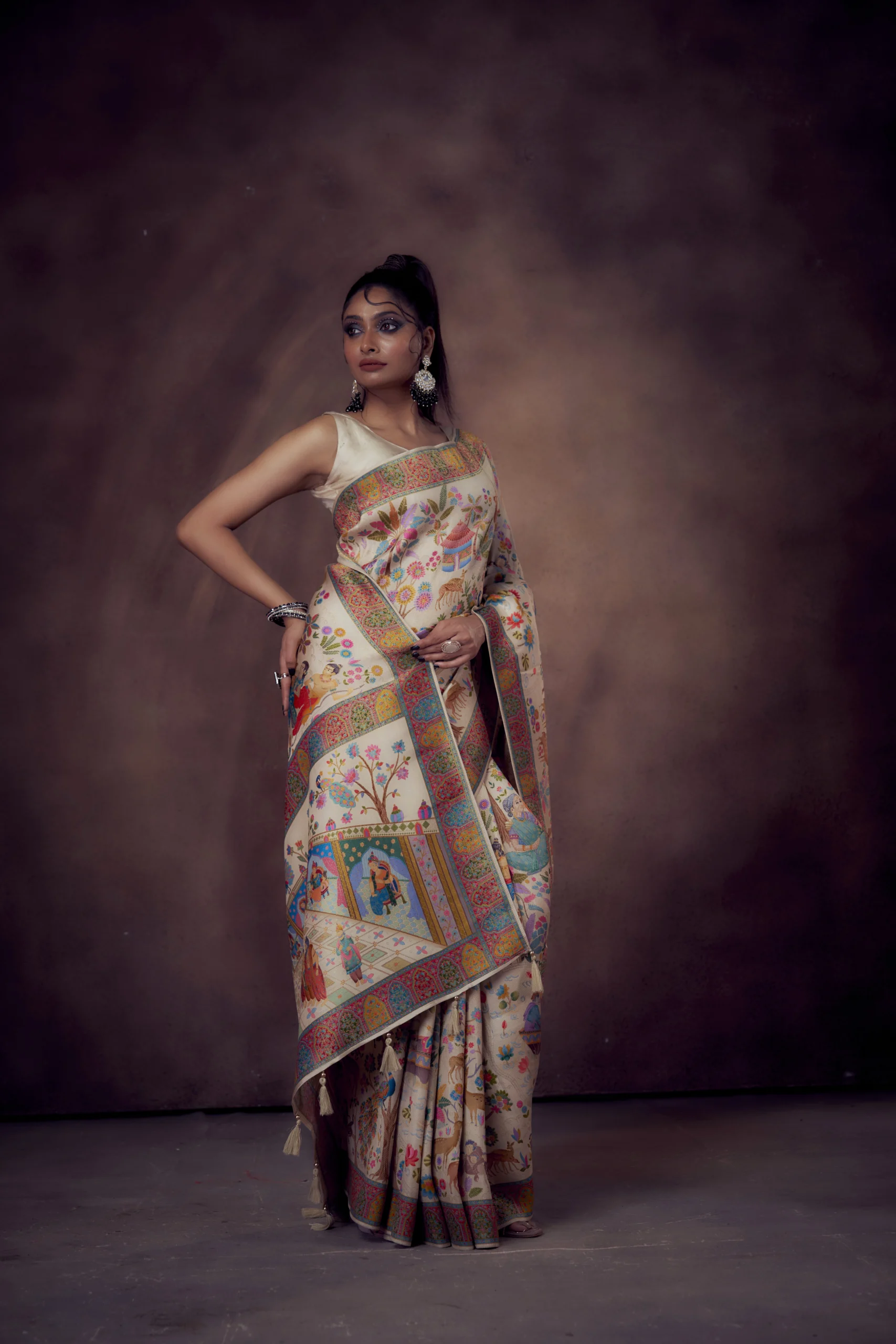 Celebrate timeless Indian artistry with our Moonga Tussar Ivory Multicolour Heritage Printed Saree, a luxurious drape that blends tradition, culture, and elegance in every inch. Crafted on soft and lustrous Moonga Tussar silk, this saree features an exquisite compilation of Pichwai, Kalamkari, Patola and miniature-inspired prints, narrating stories of Indian folklore, rituals, nature, and royal life.