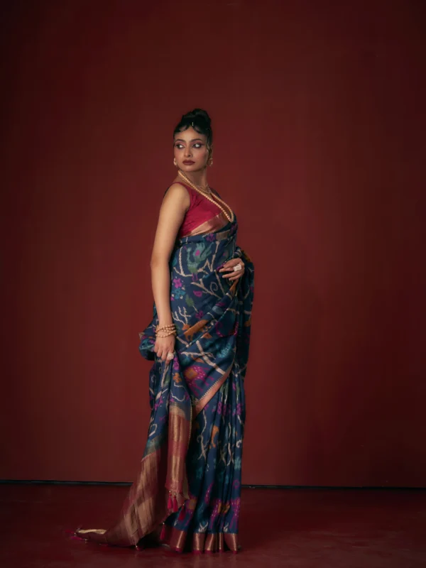 The saree comes with a 5.5-metre drape length and an attached 80 cm blouse piece, allowing you to style it traditionally or with a modern twist. A refined choice for women who appreciate heritage textiles with a bold, artistic soul.