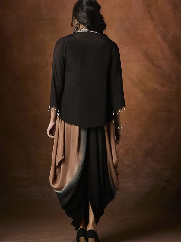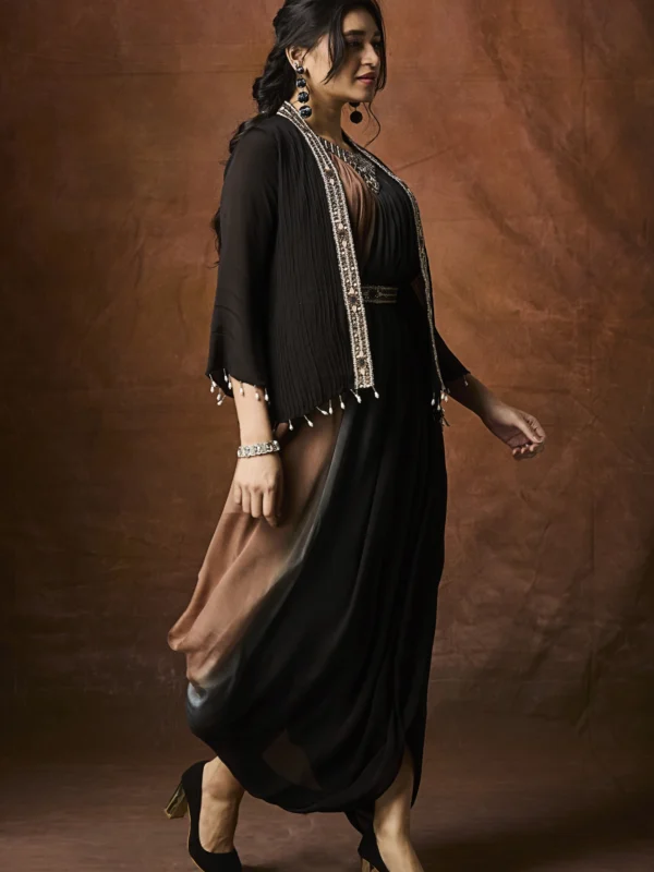 This striking ensemble features a fluid black draped inner dress, designed with soft gathers that create a graceful fall and effortless movement. The draped silhouette adds a modern, fashion-forward edge while maintaining timeless sophistication.