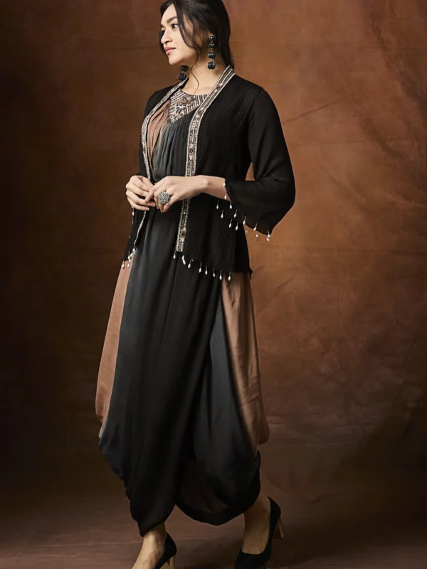 Command attention with understated glamour in the Noir Aabha Draped Indo-Western Jacket Dress, a bold fusion of contemporary tailoring and artisanal elegance.