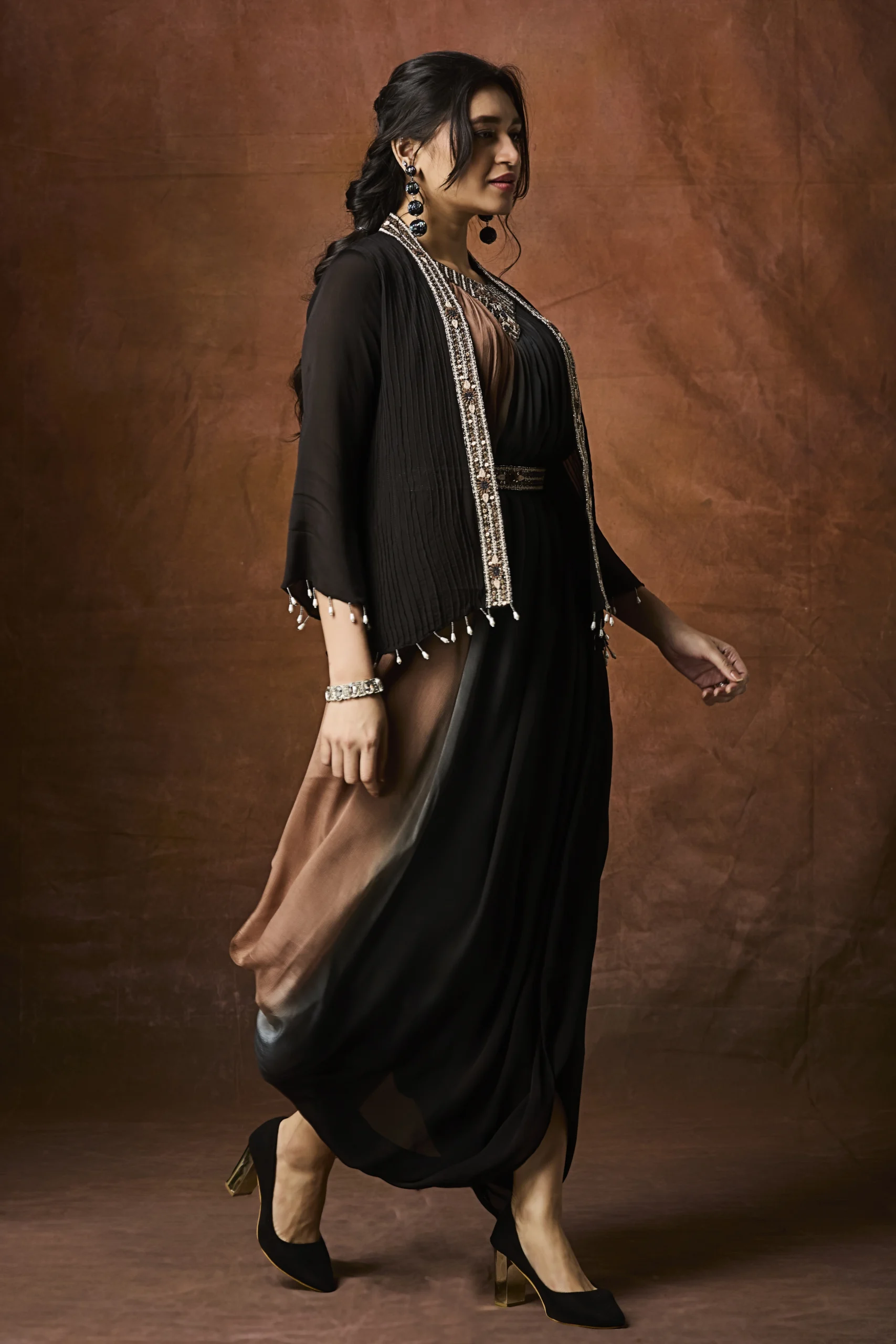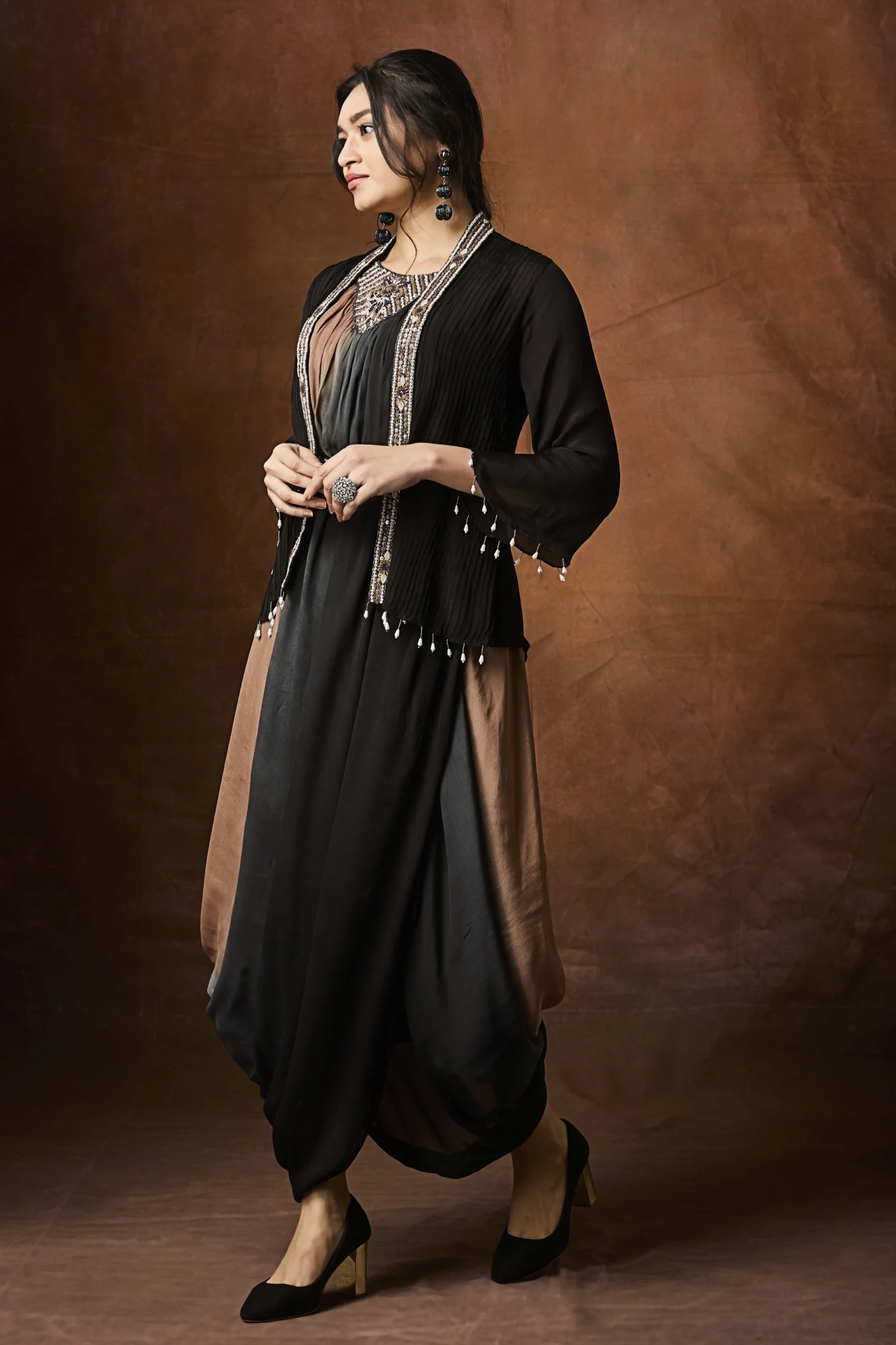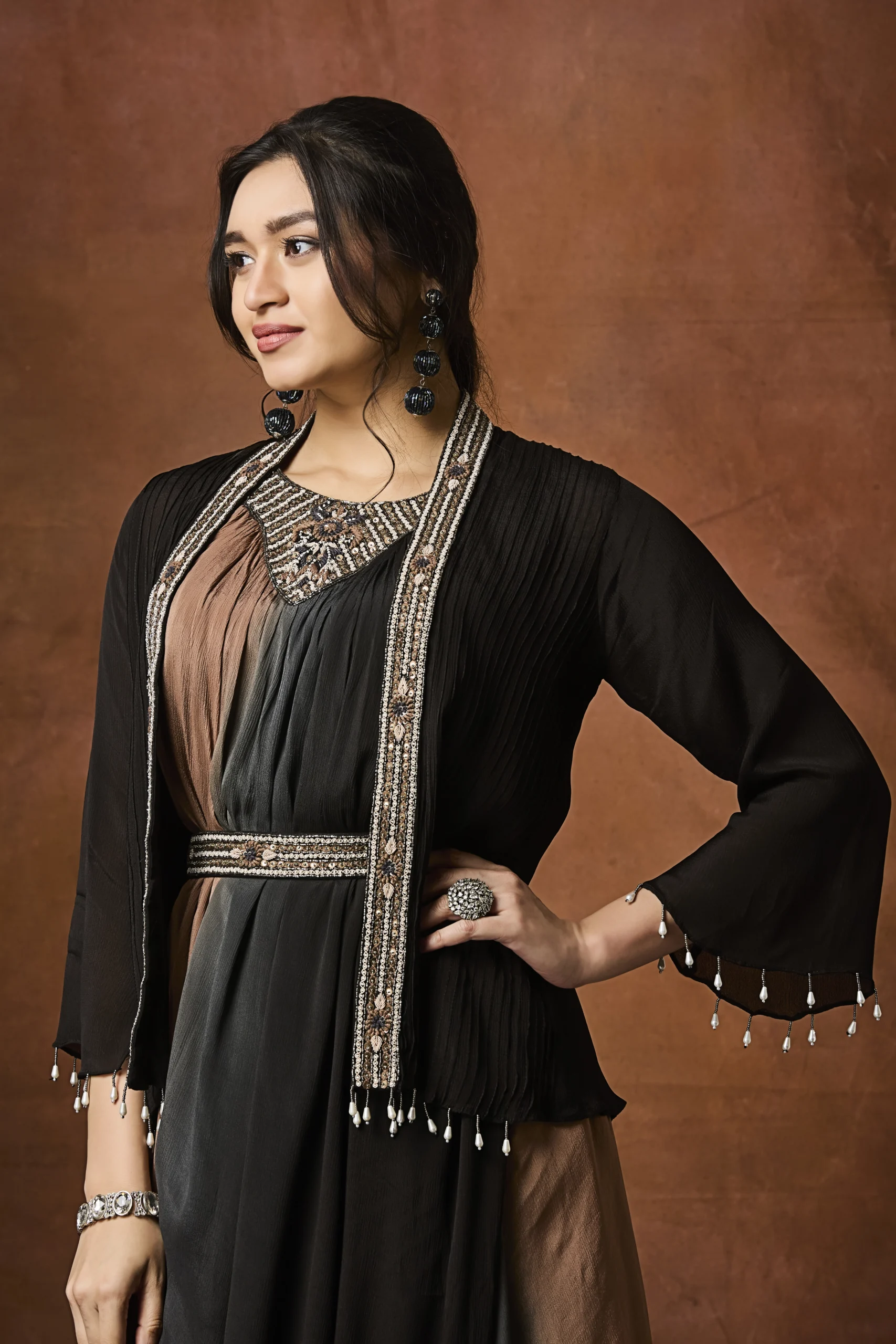 Layered over it is a finely textured black jacket, elevated with hand-embellished borders and delicate bead detailing. The jacket’s structured fit beautifully balances the fluidity of the inner dress, while the tassel accents at the sleeves and hem add subtle drama and festive charm. A coordinated embellished waist belt cinches the look, enhancing the silhouette and adding definition.