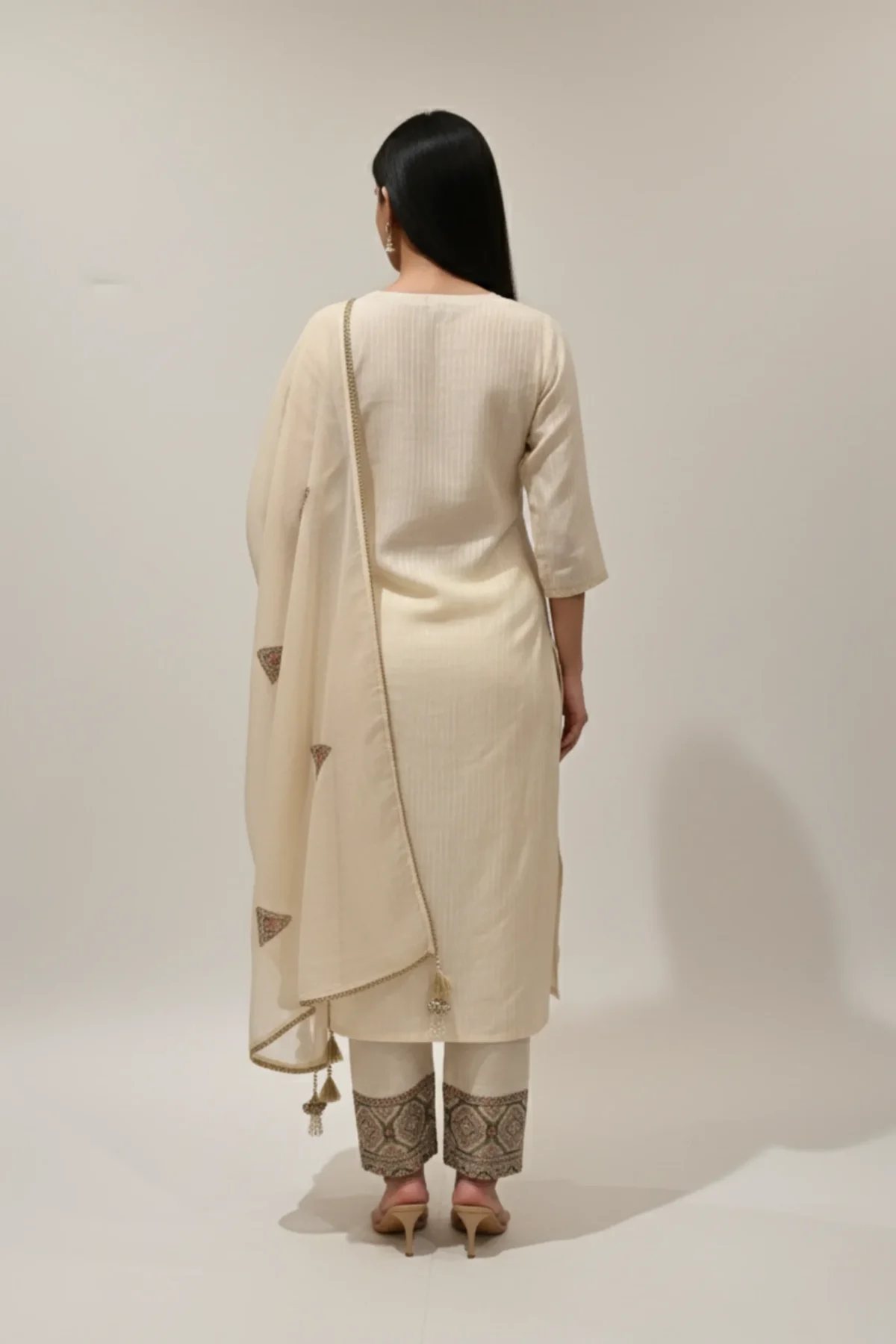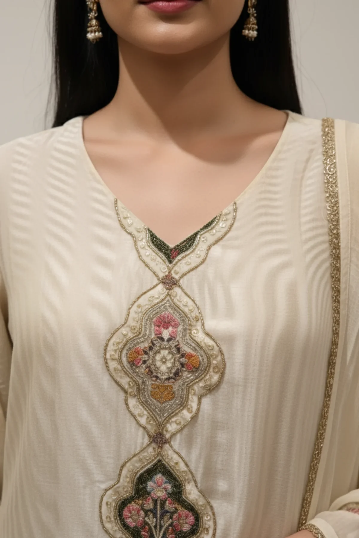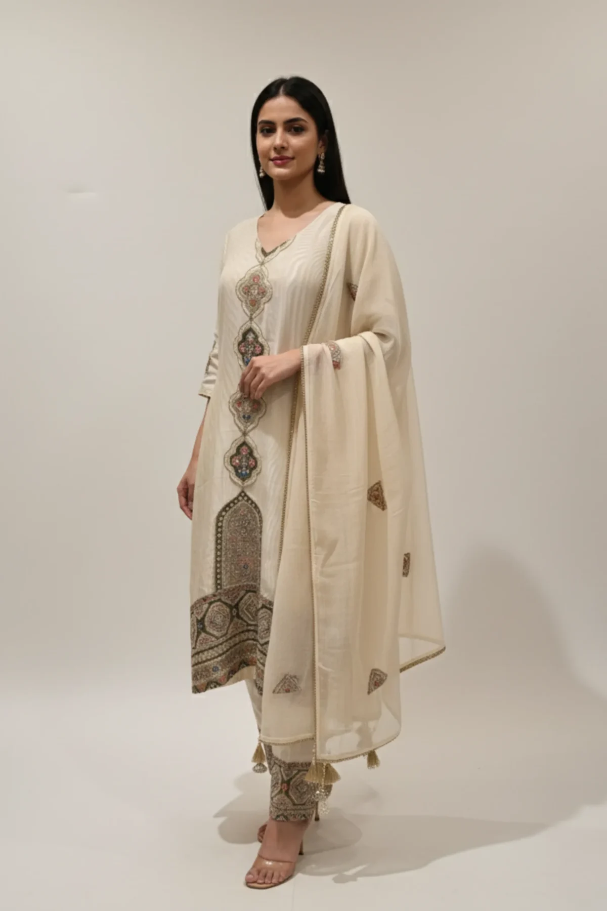 Radiate refined grace with Rangoli Saris’ Ivory Radiance Designer Suit, crafted in fine fancy fabric with exquisite designer embroidery for an effortlessly royal look.