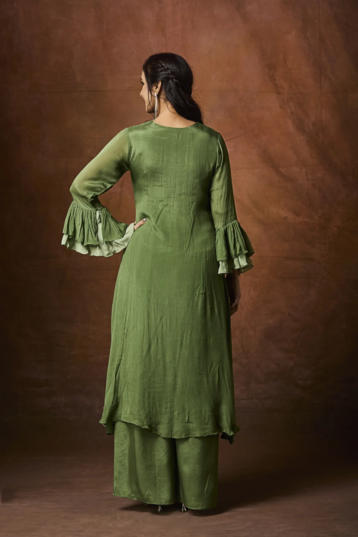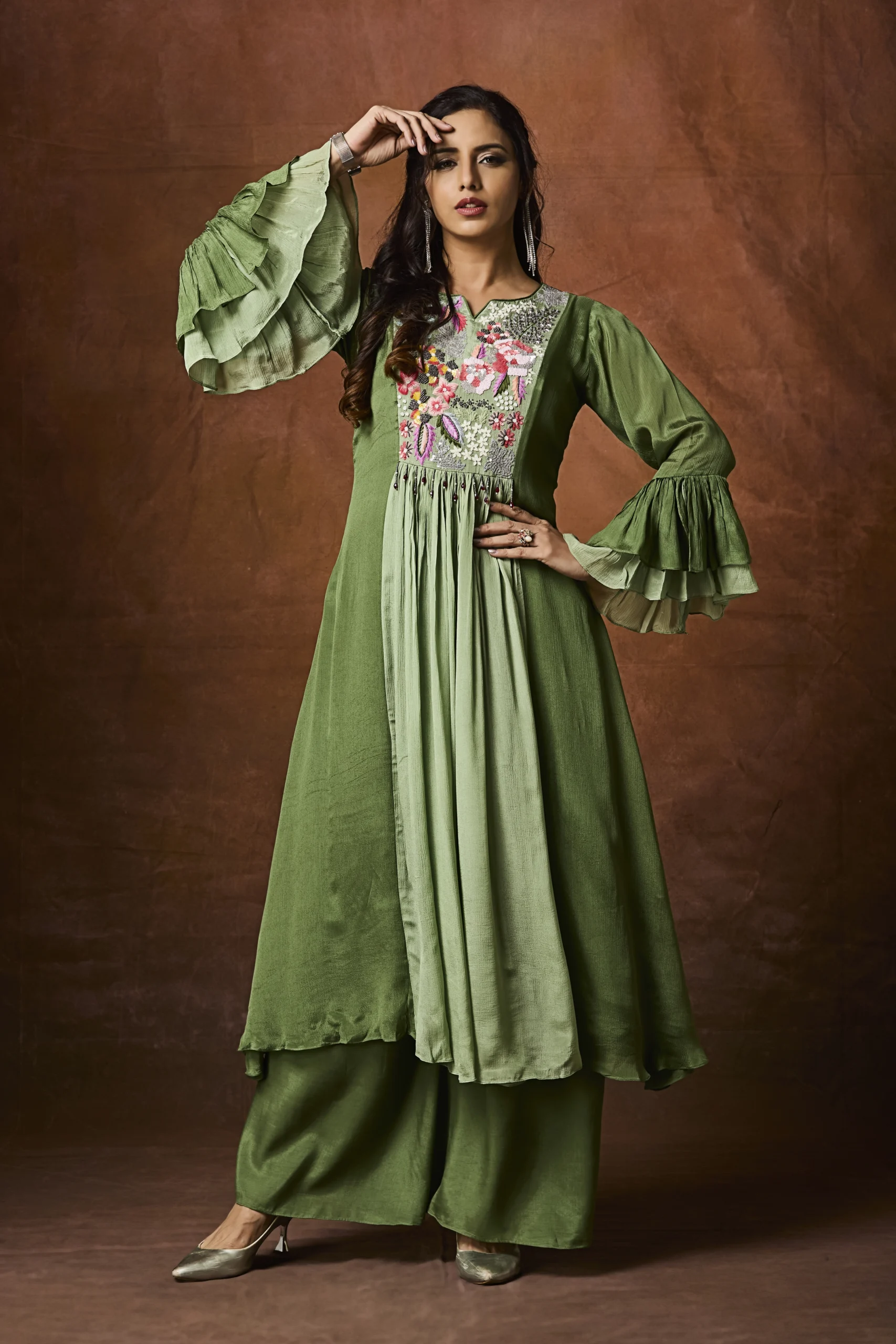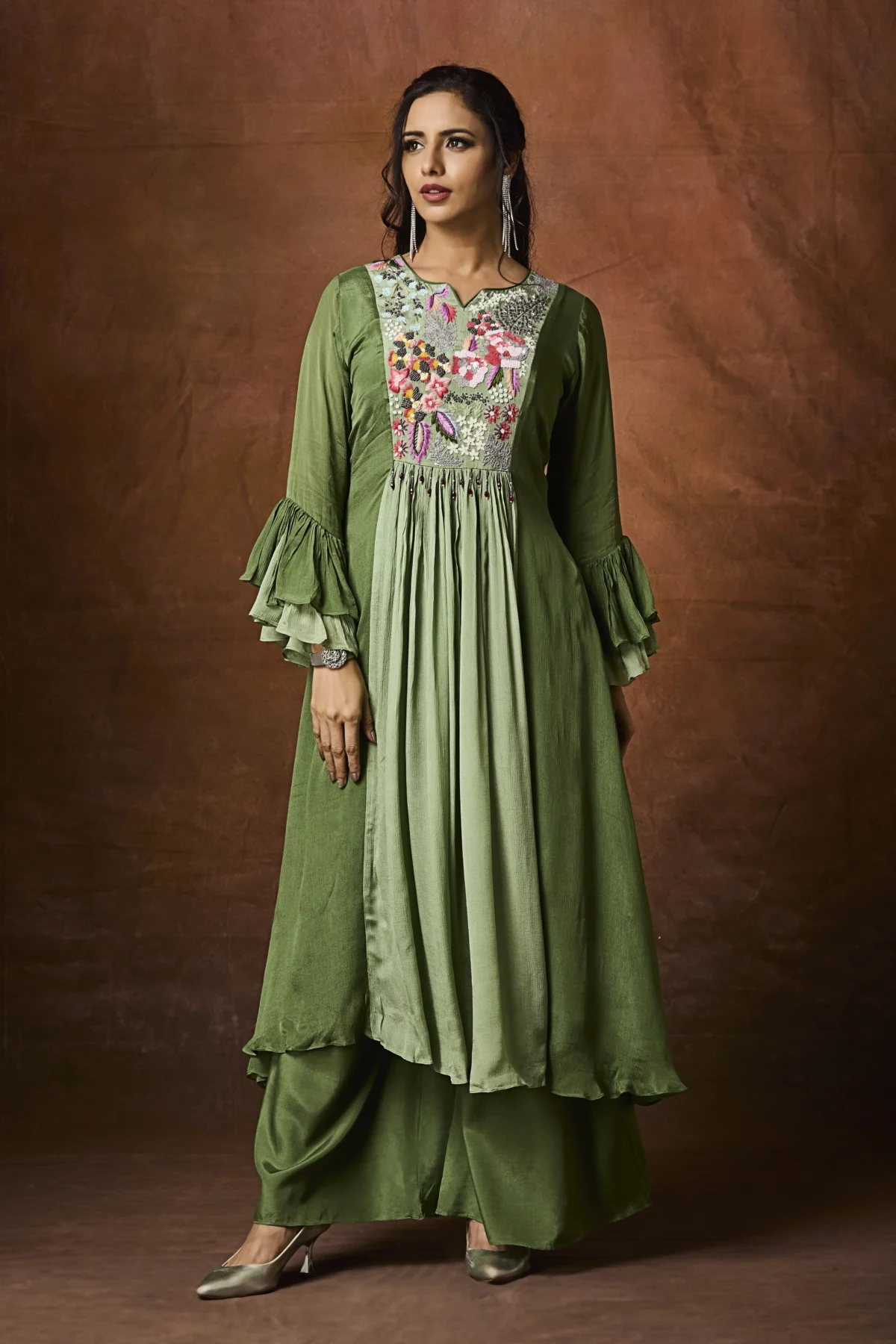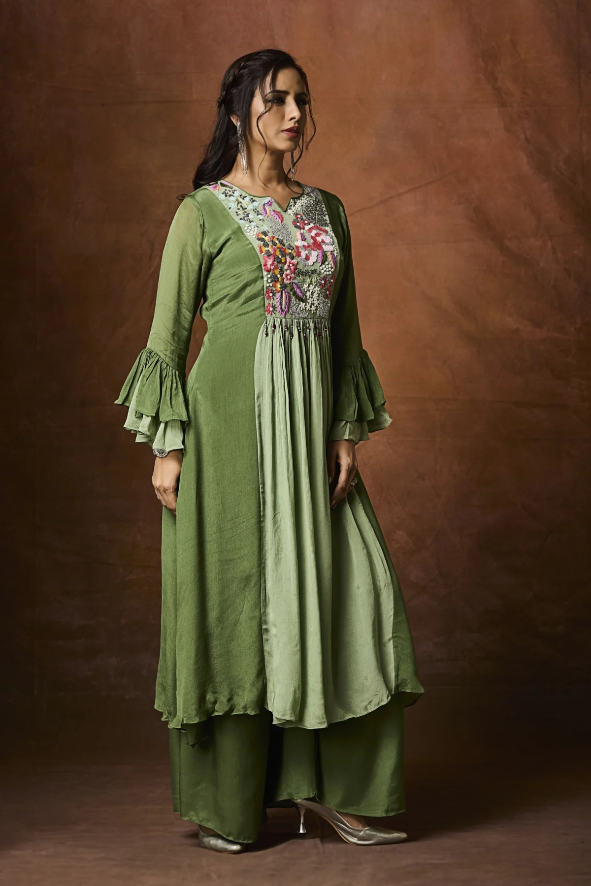 Olive green Indo-Western kurta set with floral embroidered yoke, layered sleeves, and palazzo pants.