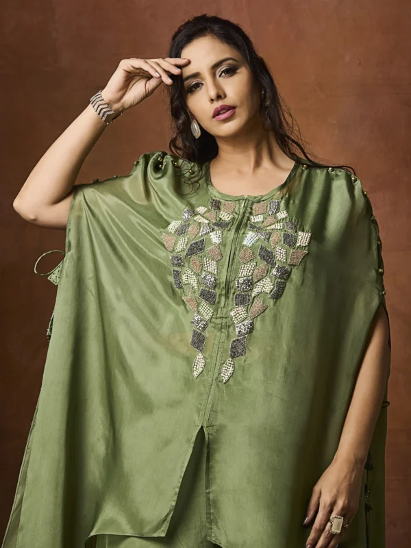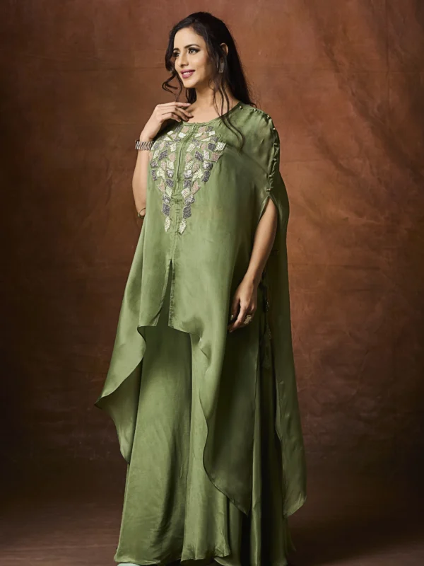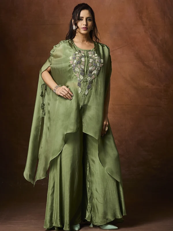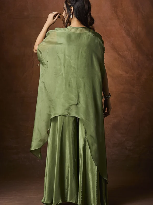 A refined blend of modern fluidity and artisanal detailing, this Olive Green Embroidered Cape-Style Indo-Western Ensemble is designed for effortless sophistication. The outfit features a sheer, flowy cape overlay adorned with geometric hand-embellished embroidery along the front panel, creating a striking visual statement.