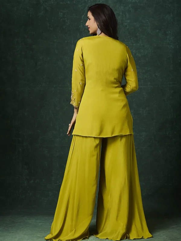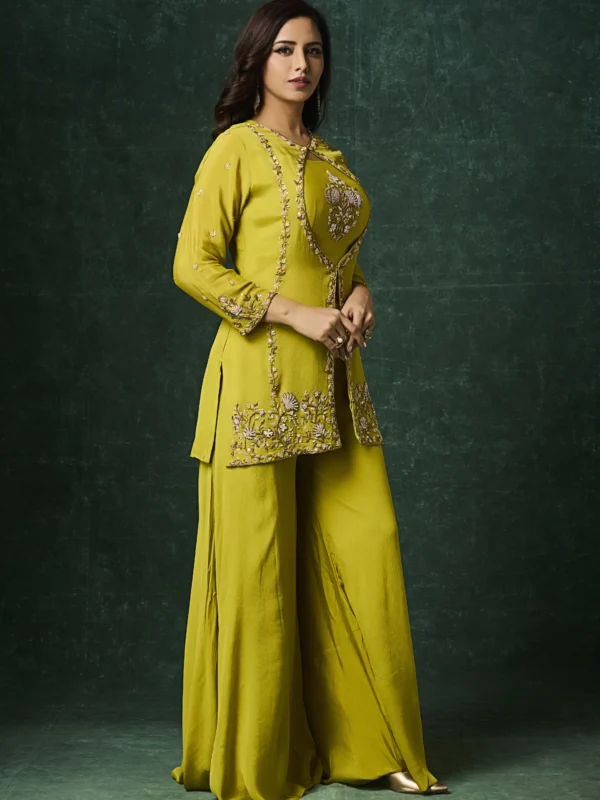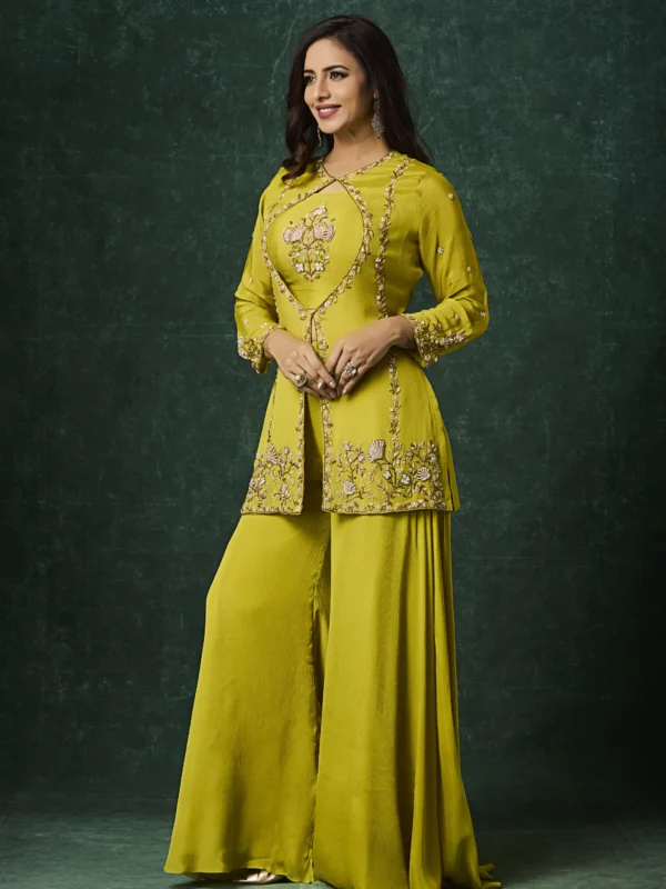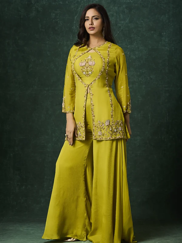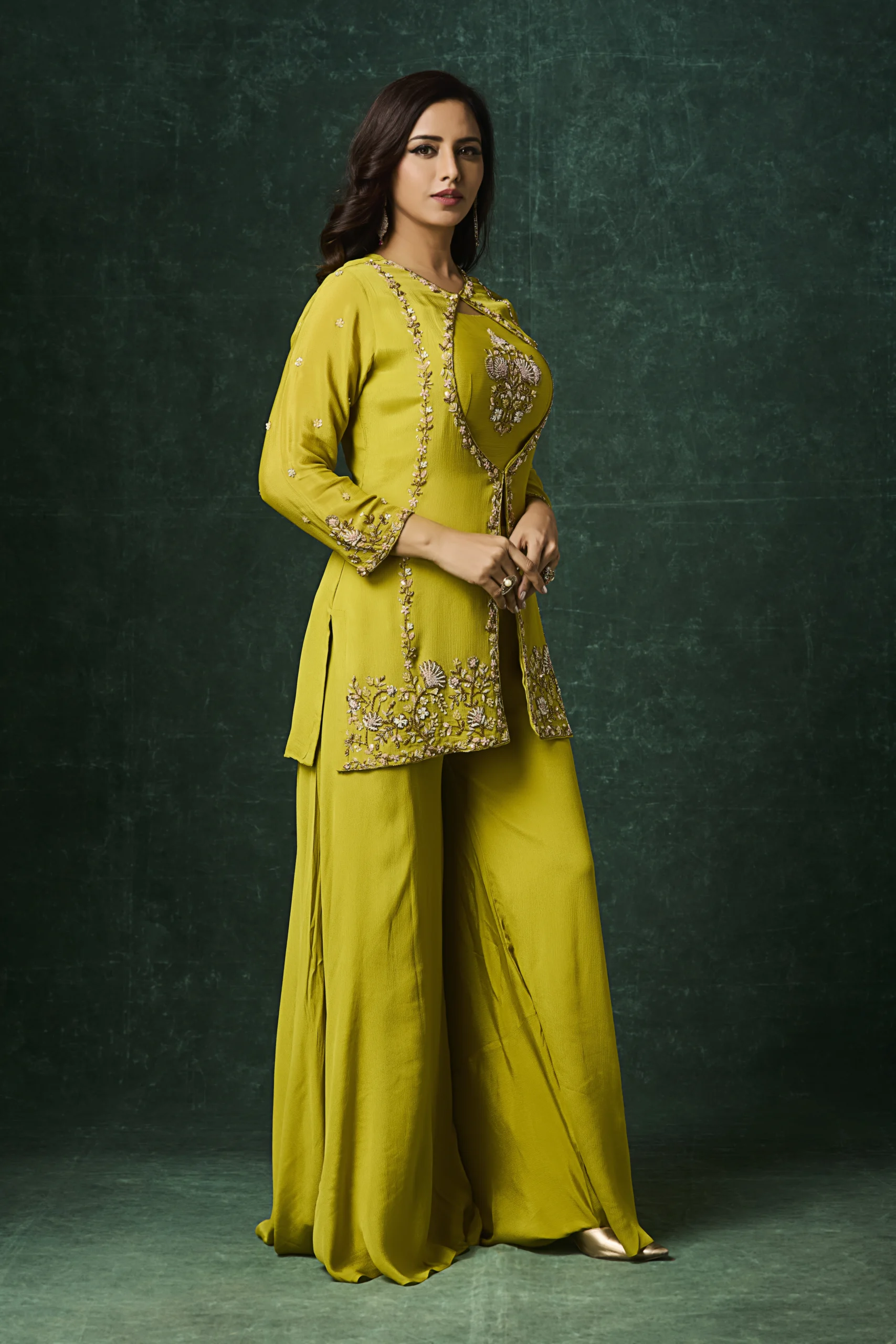 The coordinated flowy bottoms provide graceful movement and balance the structured upper silhouette, making this ensemble ideal for festive celebrations, wedding functions, cocktail evenings, and elegant gatherings. The rich olive green tone adds a contemporary charm while maintaining a timeless festive appeal.