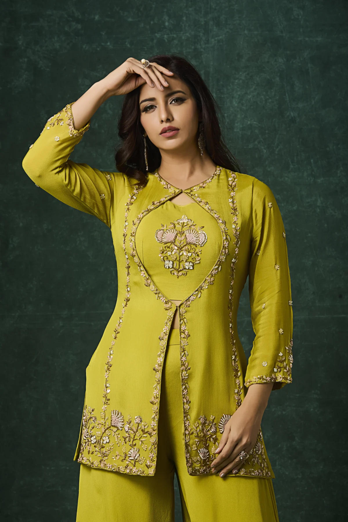 Olive green Indo-Western ensemble featuring an embroidered inner layer, jacket-style overlay, and coordinated flowy bottoms.
