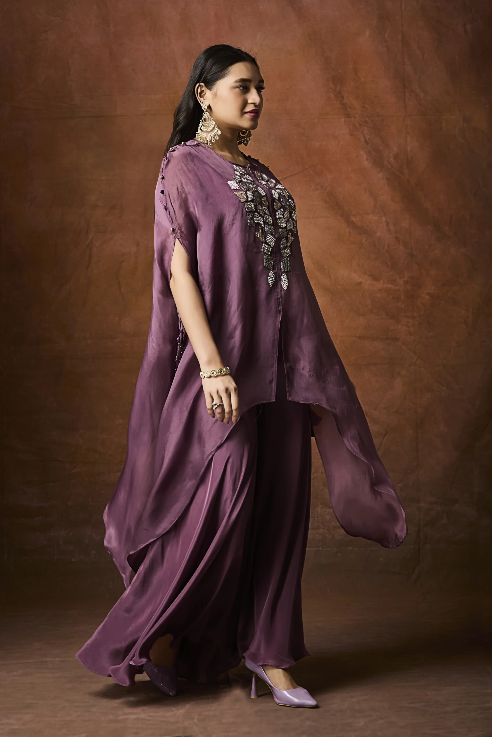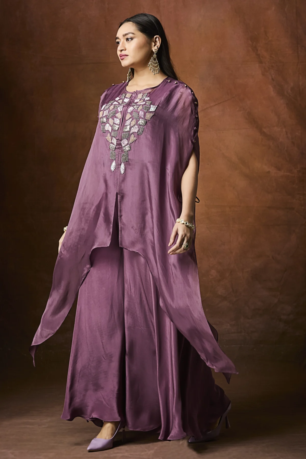 Plum-toned embroidered Indo-Western ensemble featuring a flowy cape overlay and modern layered silhouette.
