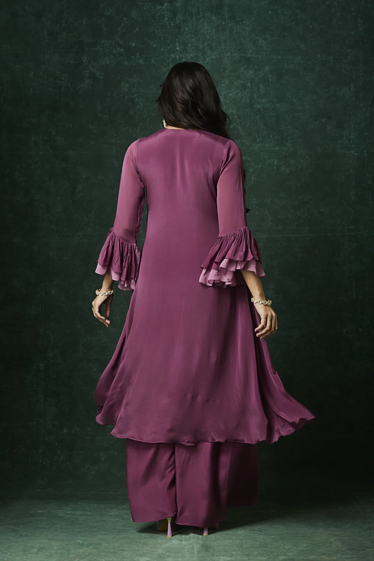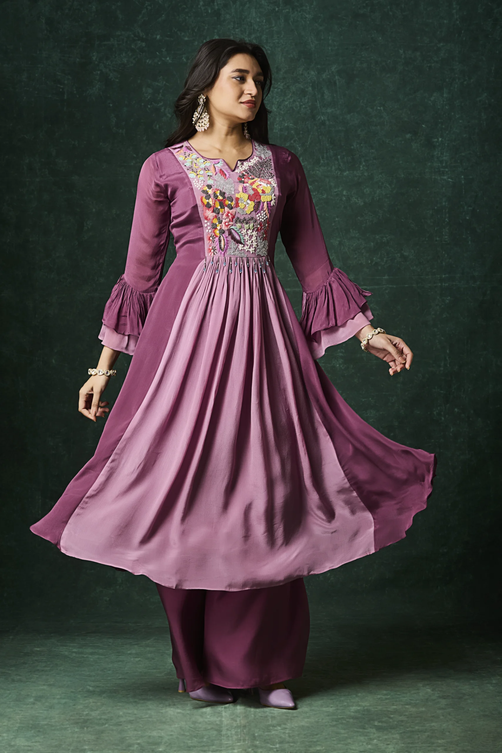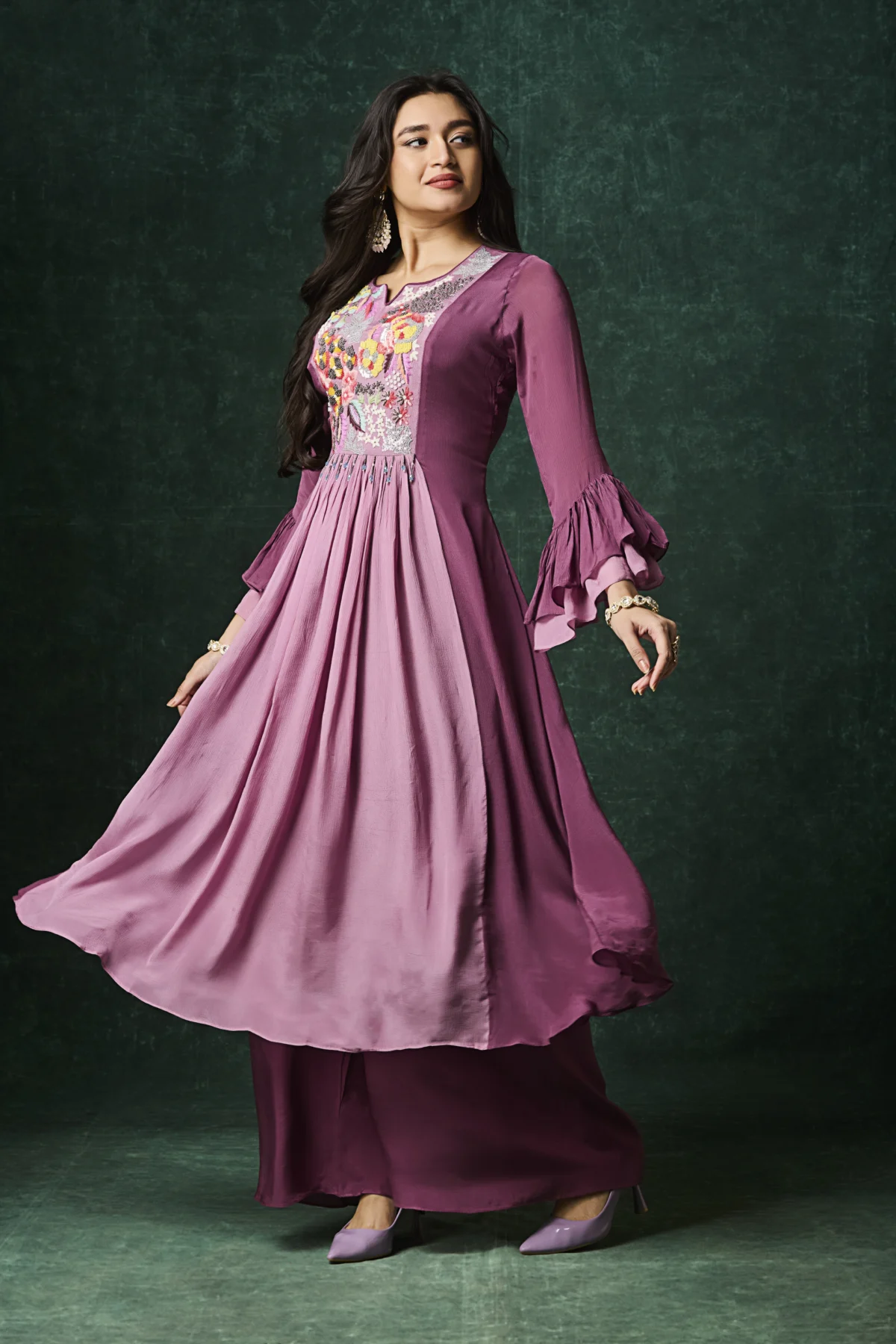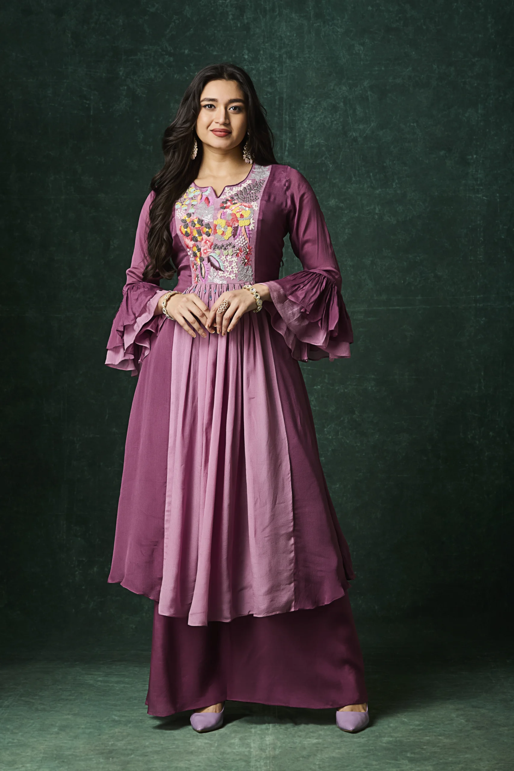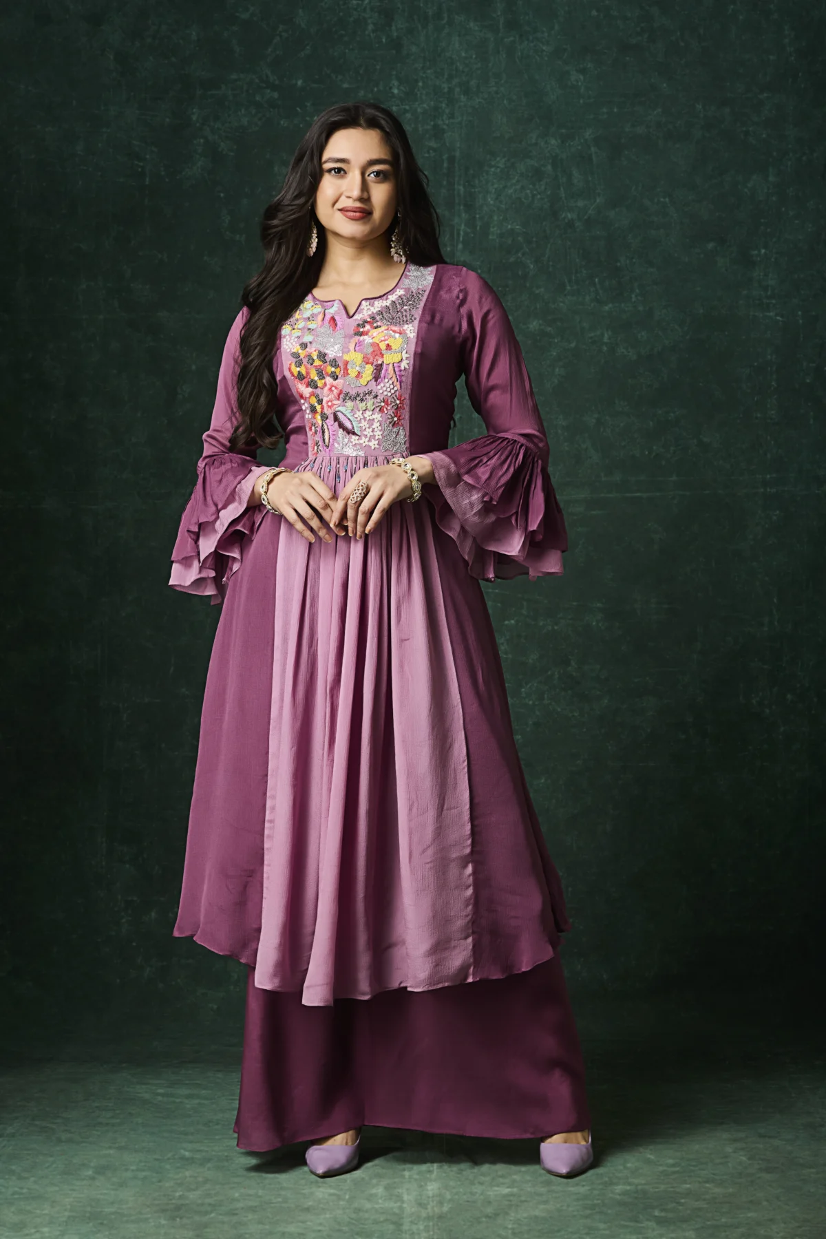Plum Indo-Western kurta set with floral embroidered yoke and layered flared silhouette.