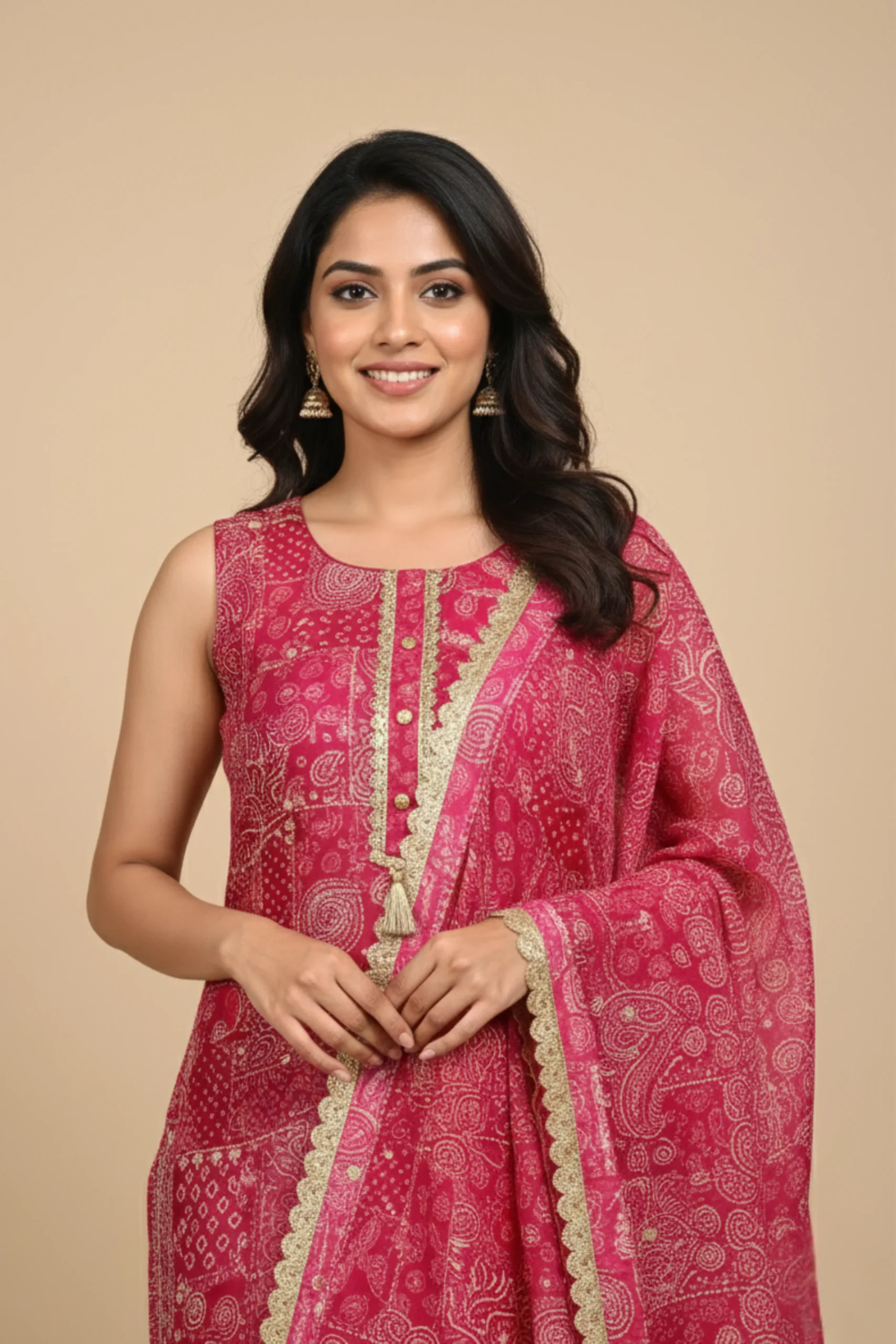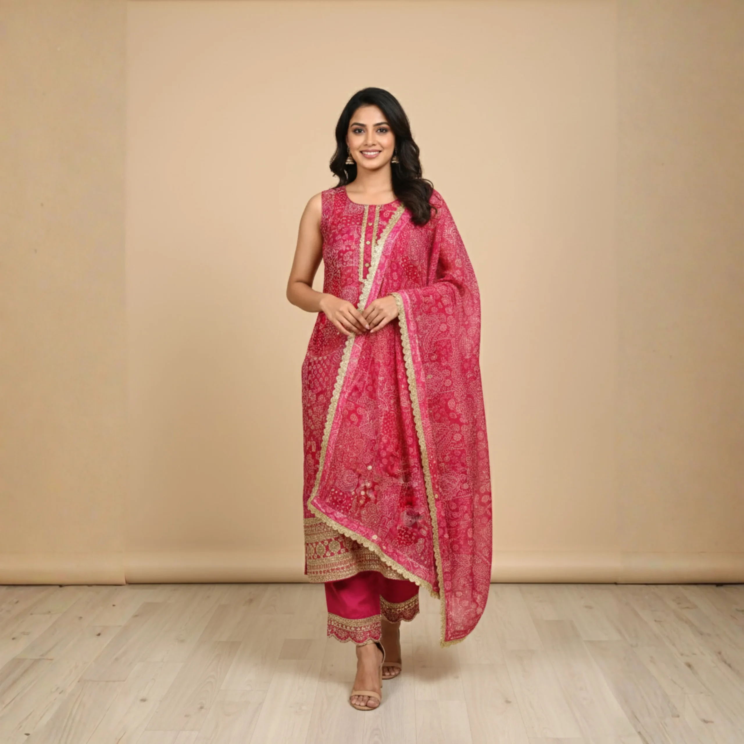 The suit is adorned with intricate print and highlight work, delicately woven into rich tones of pink and gold, exuding a regal elegance. The sleeveless kurta paired with coordinated pants and a beautifully printed dupatta creates an effortlessly graceful look for daytime celebrations or evening soirées.