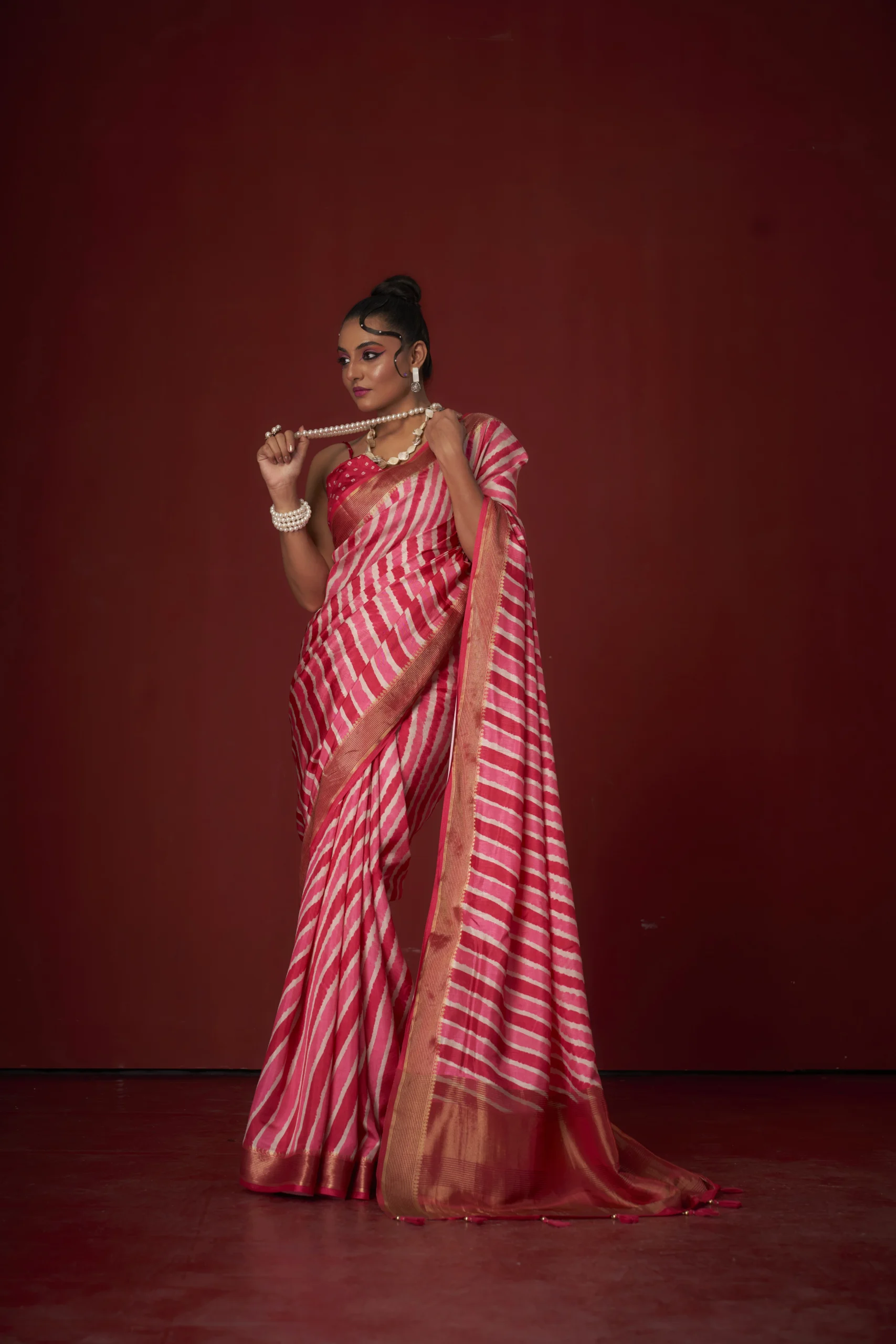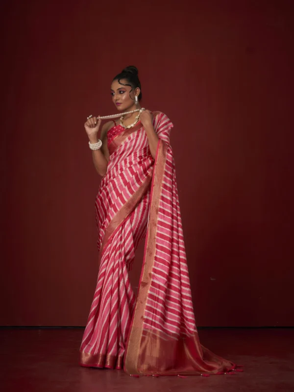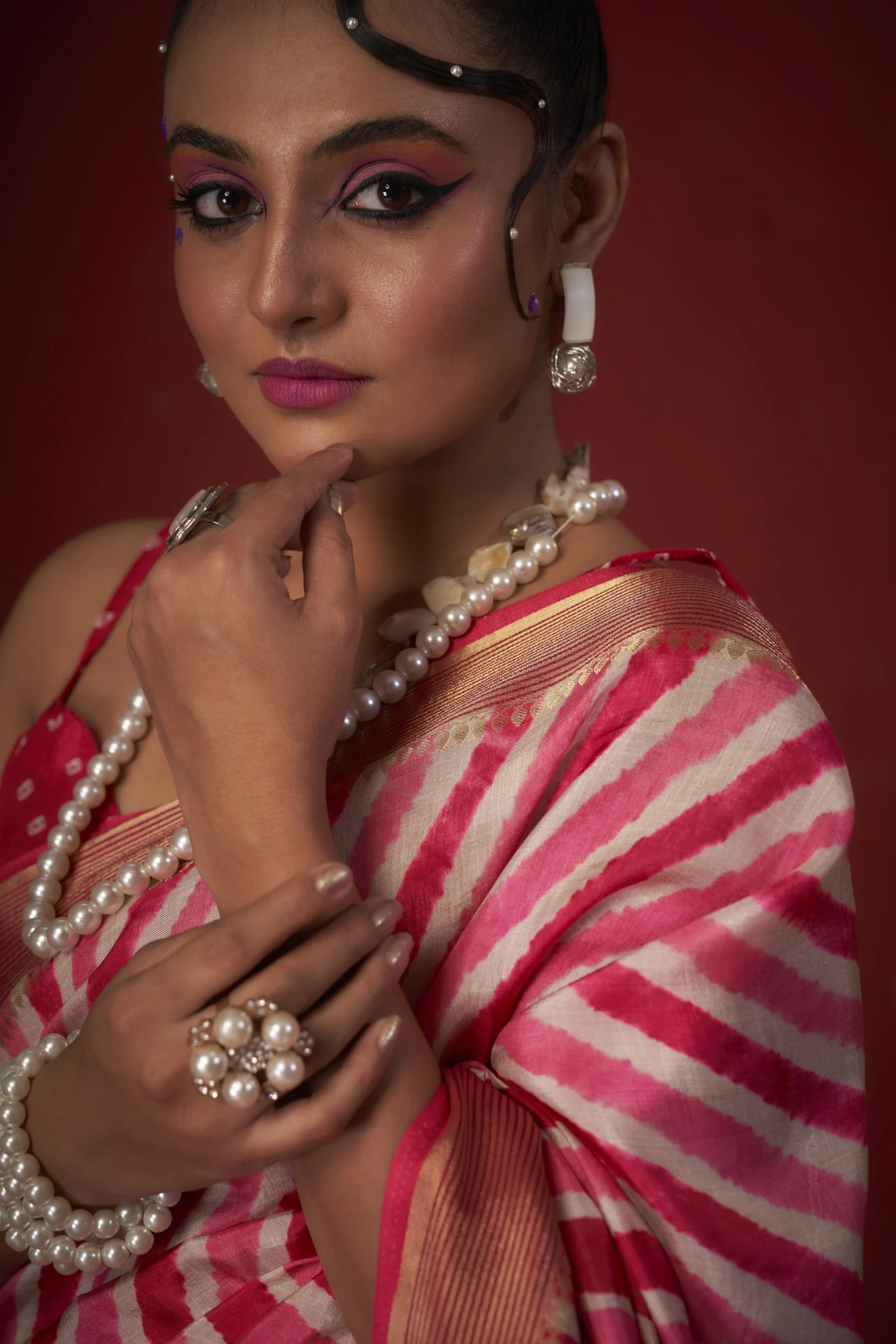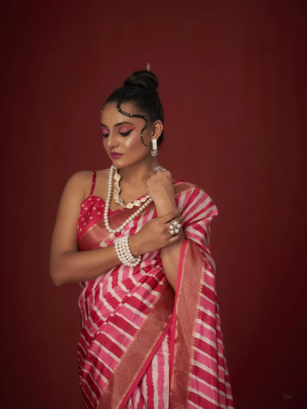 Designed with Shibori-style tie-dye stripes, the saree infuses modern vibrance into classical Indian craft traditions, beautifully blending heritage influences from Pichwai, Patola, Kalamkari, and regional textile art forms. The vivid rani pink palette makes the saree instantly eye-catching, while its rich motifs elevate the silhouette with contemporary finesse.