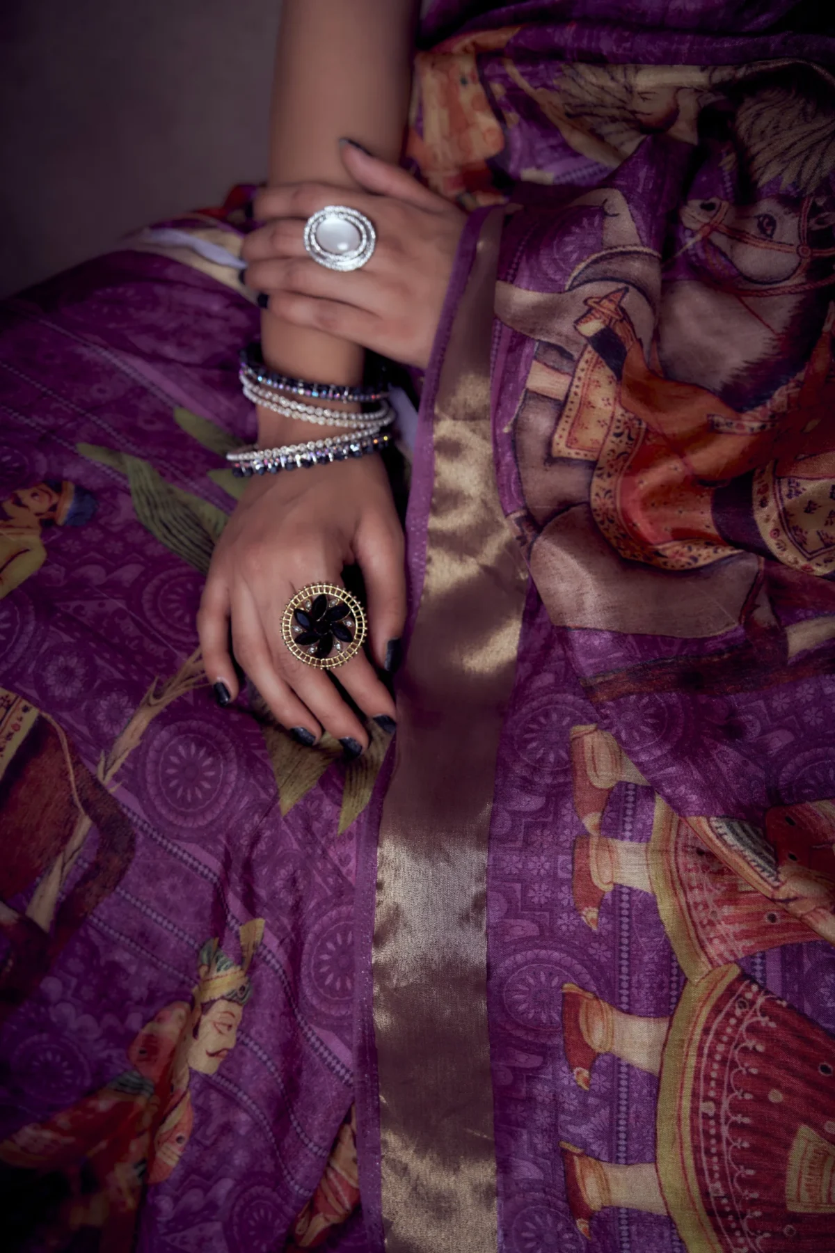 Regal Darbar Moonga Tussar Saree with Royal Procession Print & Woven Zari Border